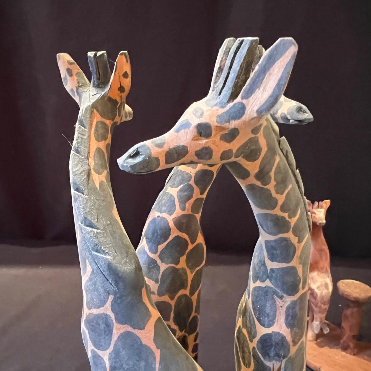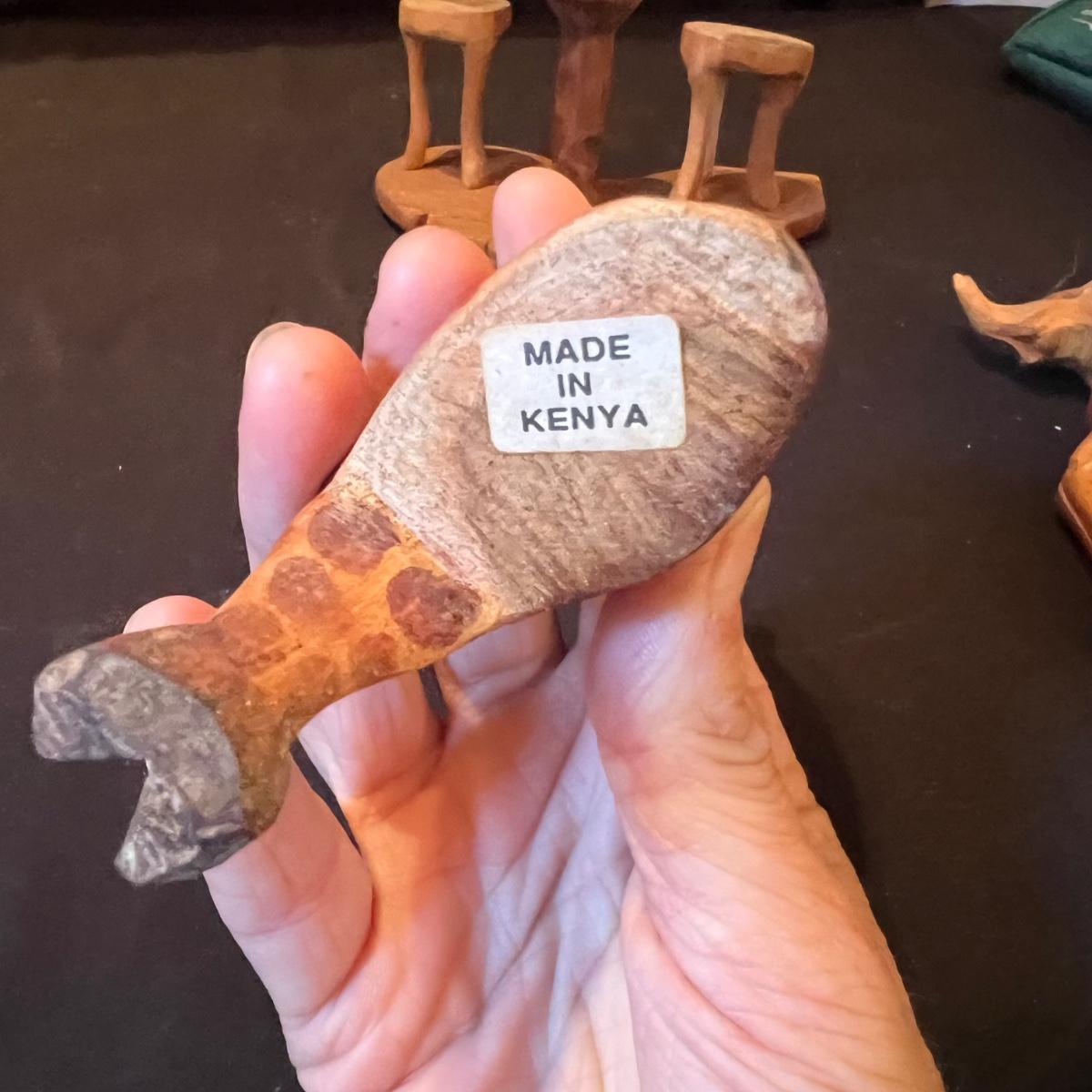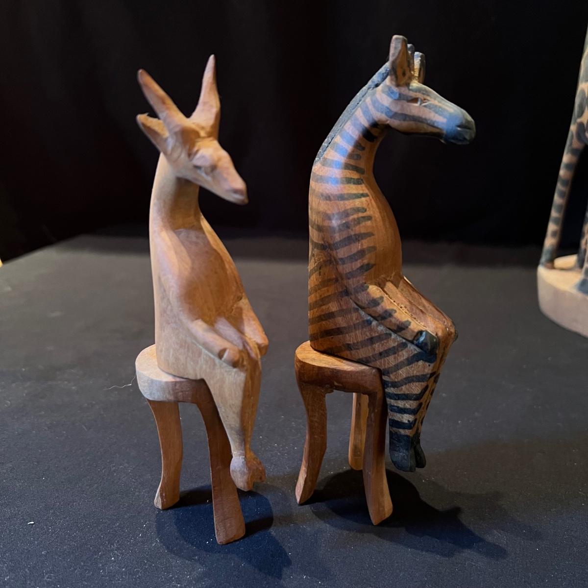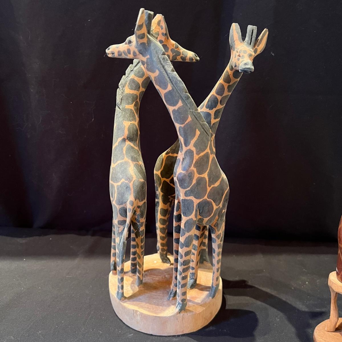 The three giraffes appear to have been hand carved from one piece of wood, see images; it measures 5”D x 13”H. Lot also includes four sitting animals with four chairs and a small stand. One of the animals has a Made in Kenya sticker.