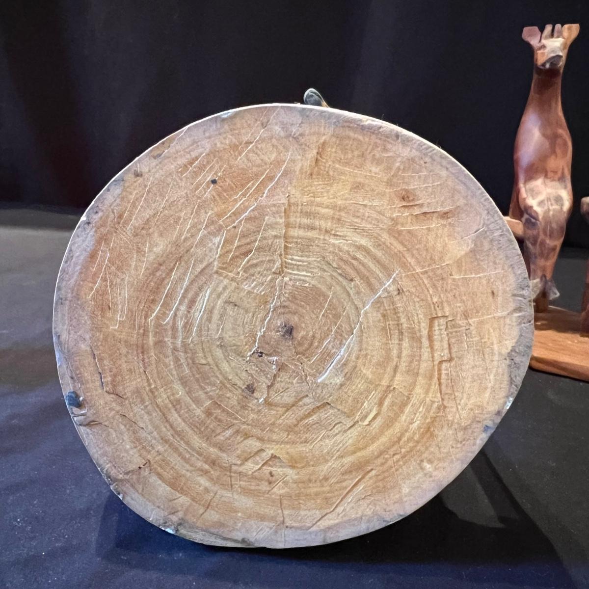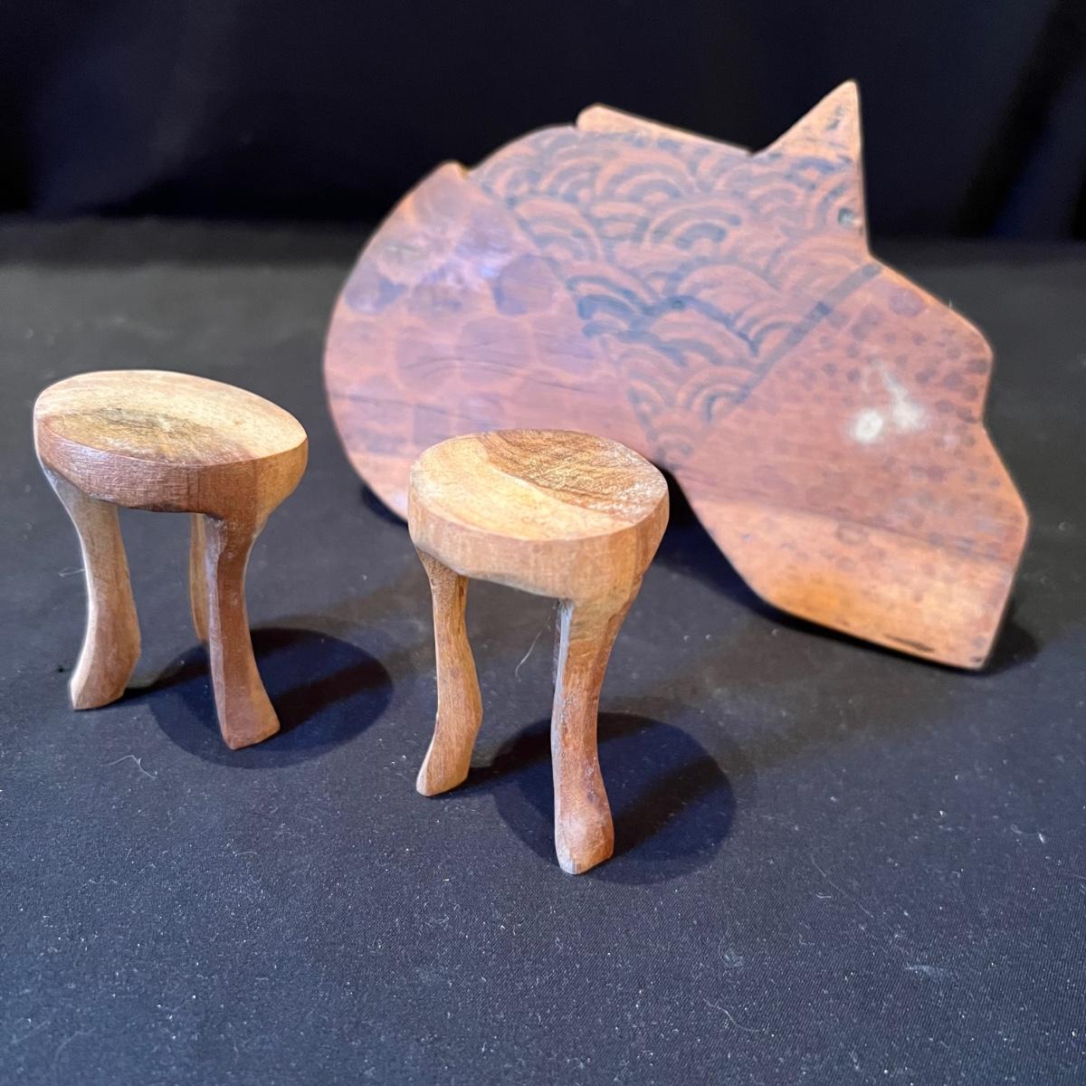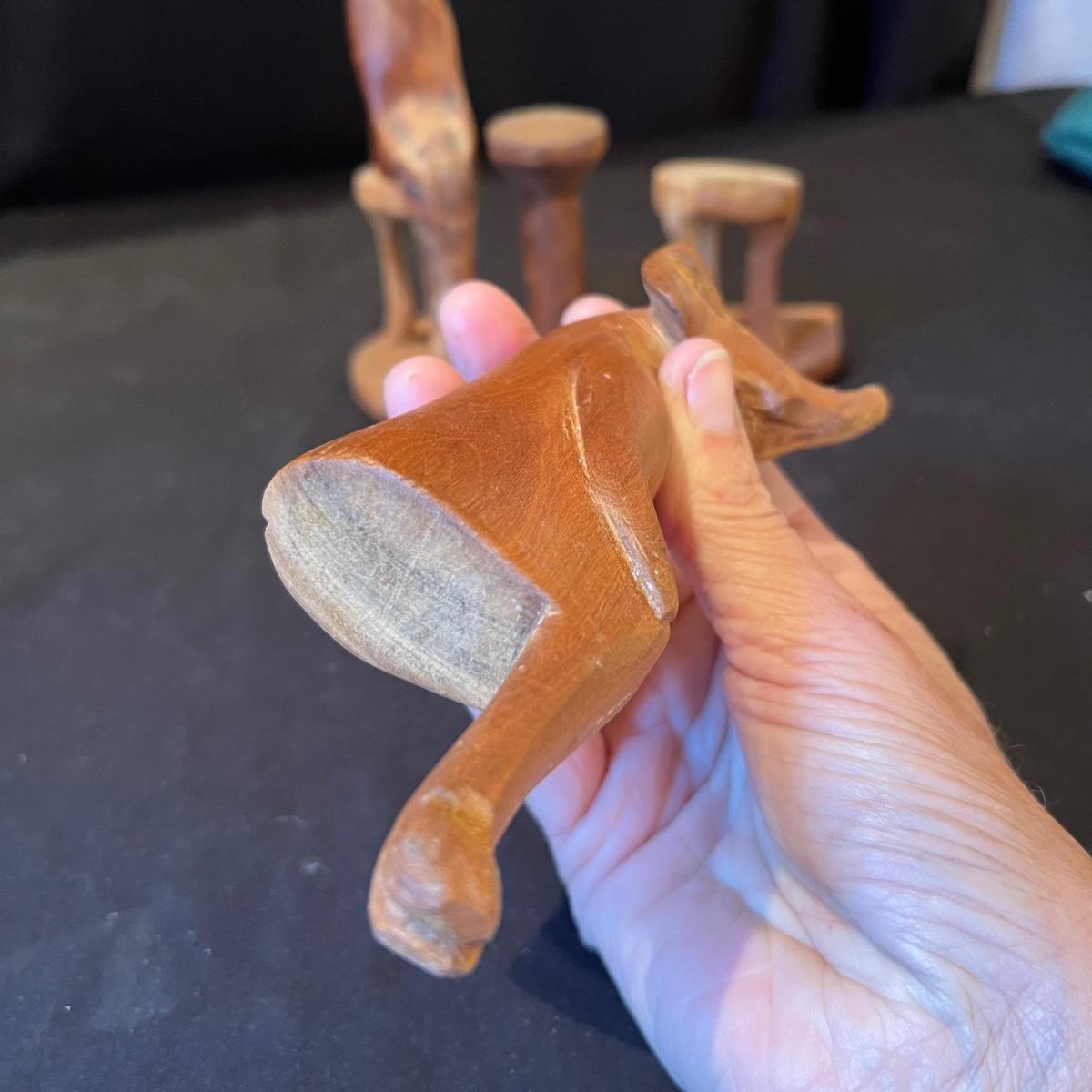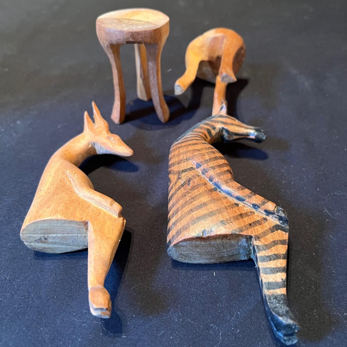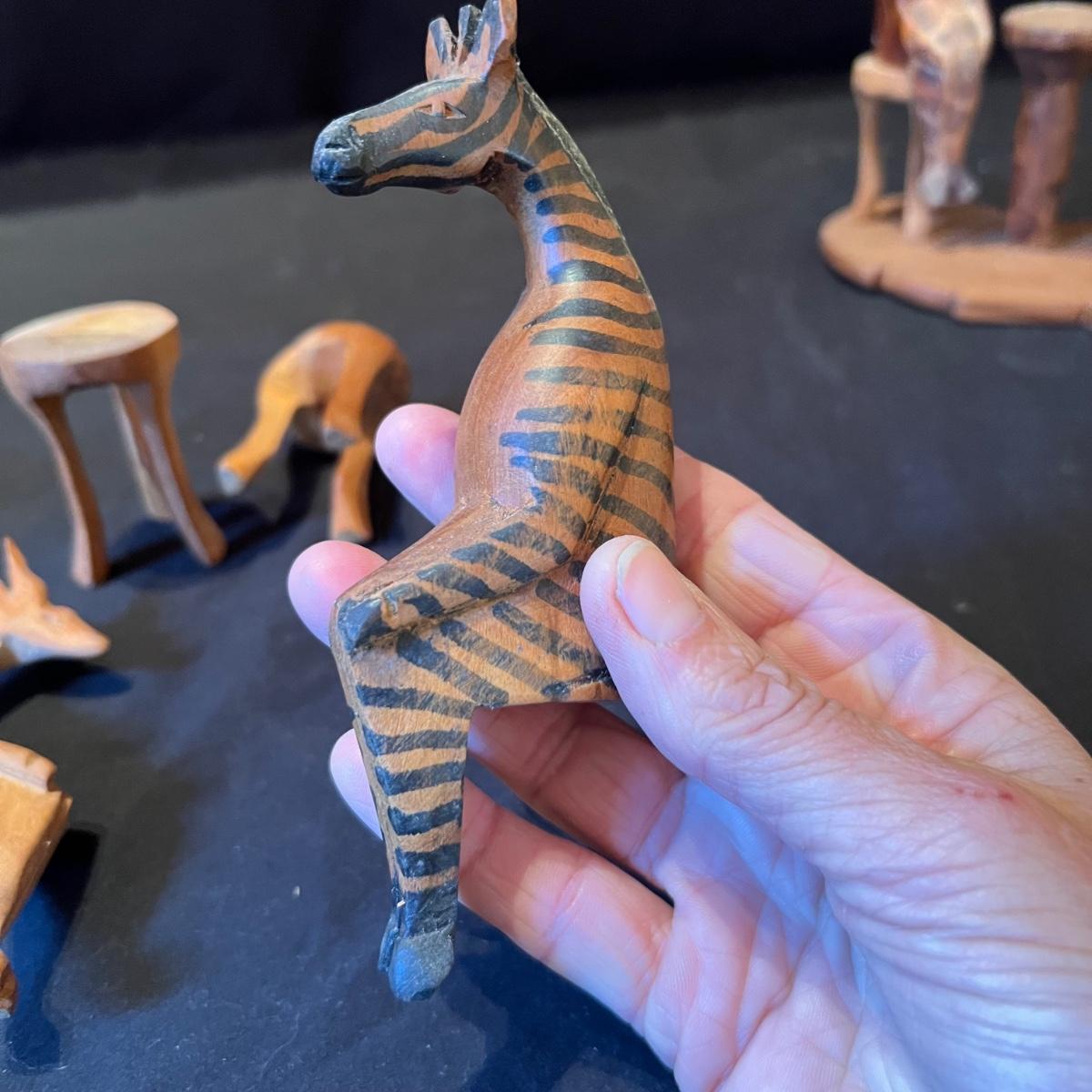 The three giraffes appear to have been hand carved from one piece of wood, see images; it measures 5”D x 13”H. Lot also includes four sitting animals with four chairs and a small stand. One of the animals has a Made in Kenya sticker.