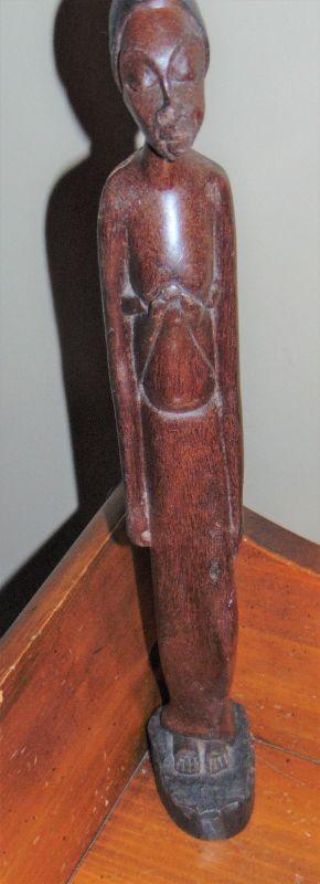 Features a woman with a baby on her back. Teak. Dimension: 14.5" tall by 2" deep.