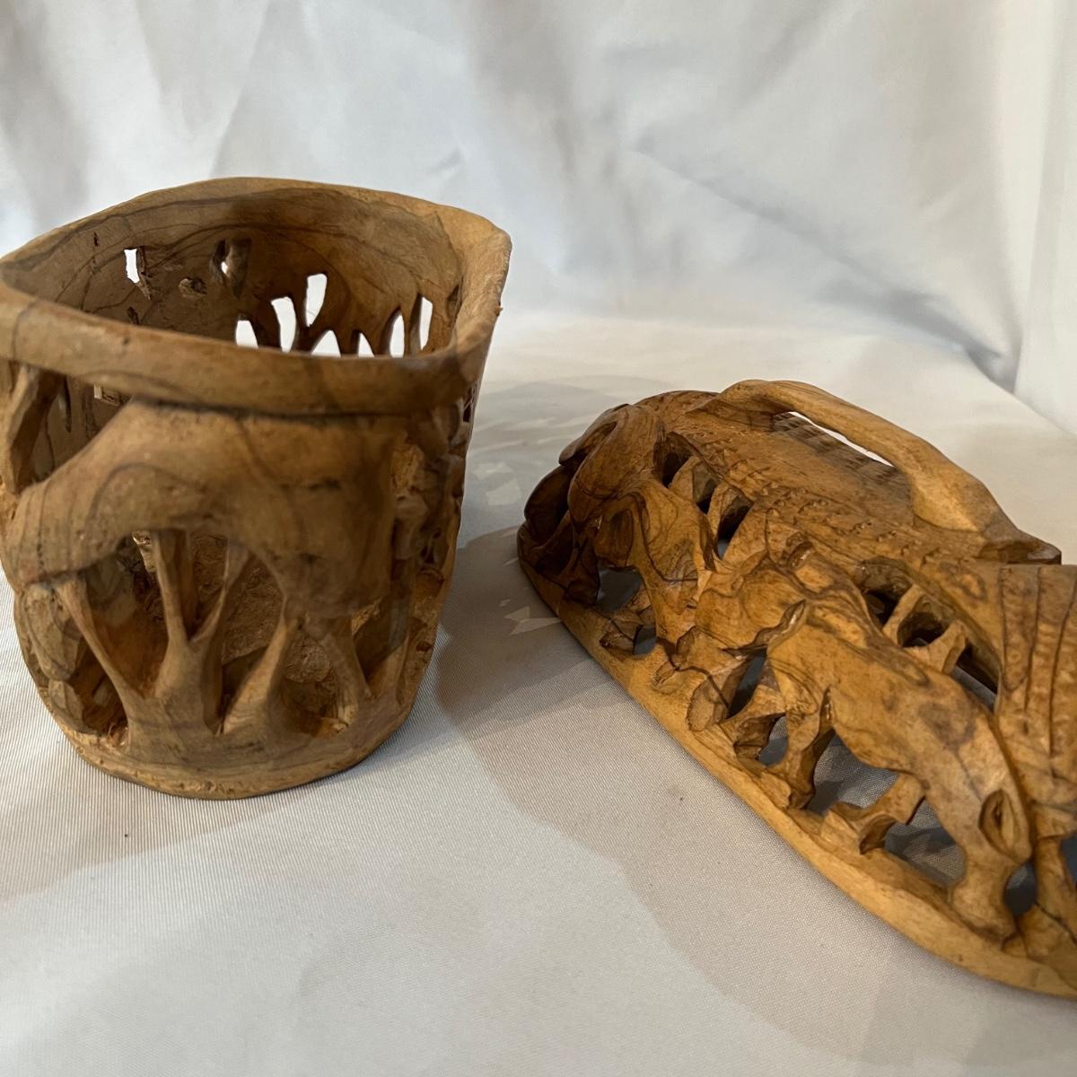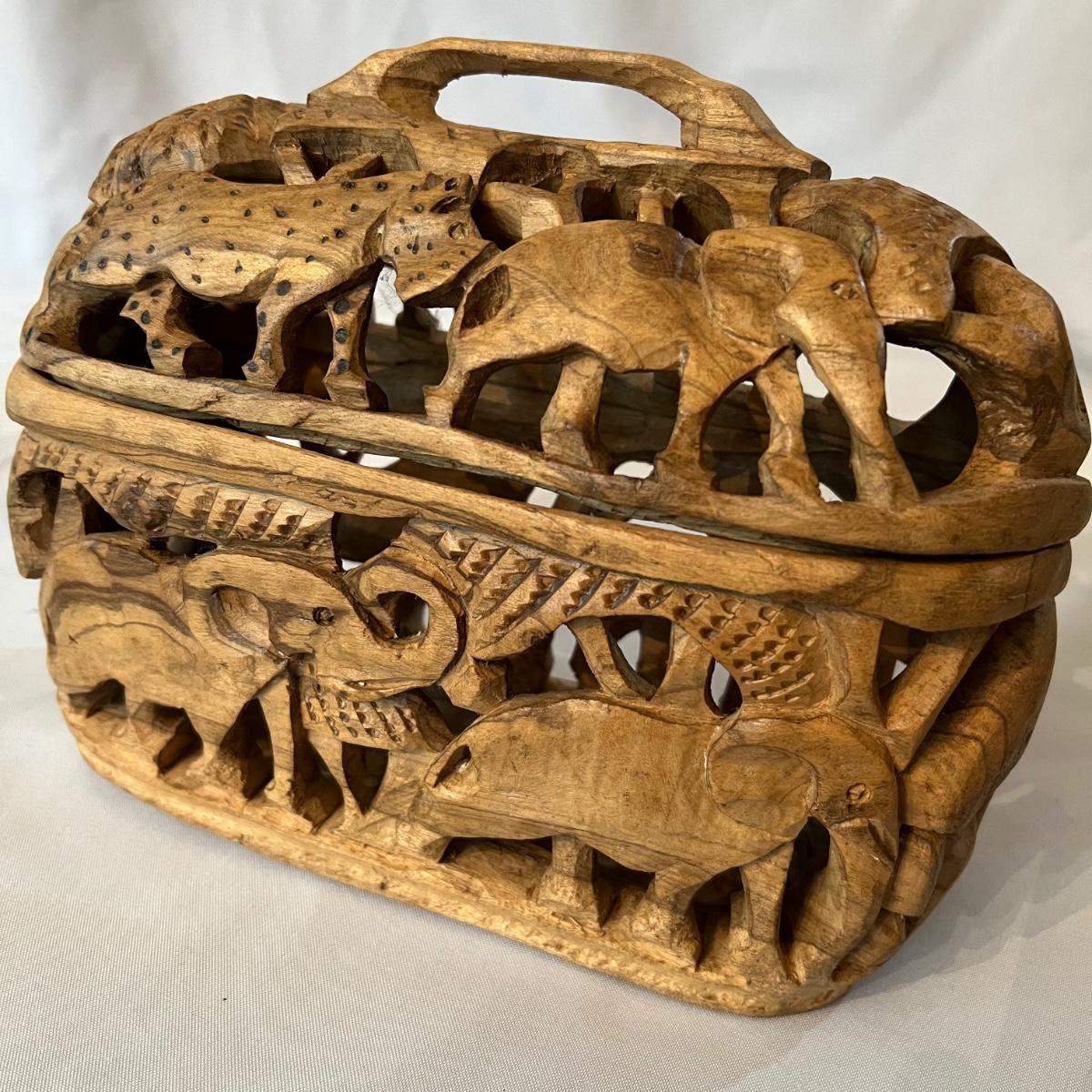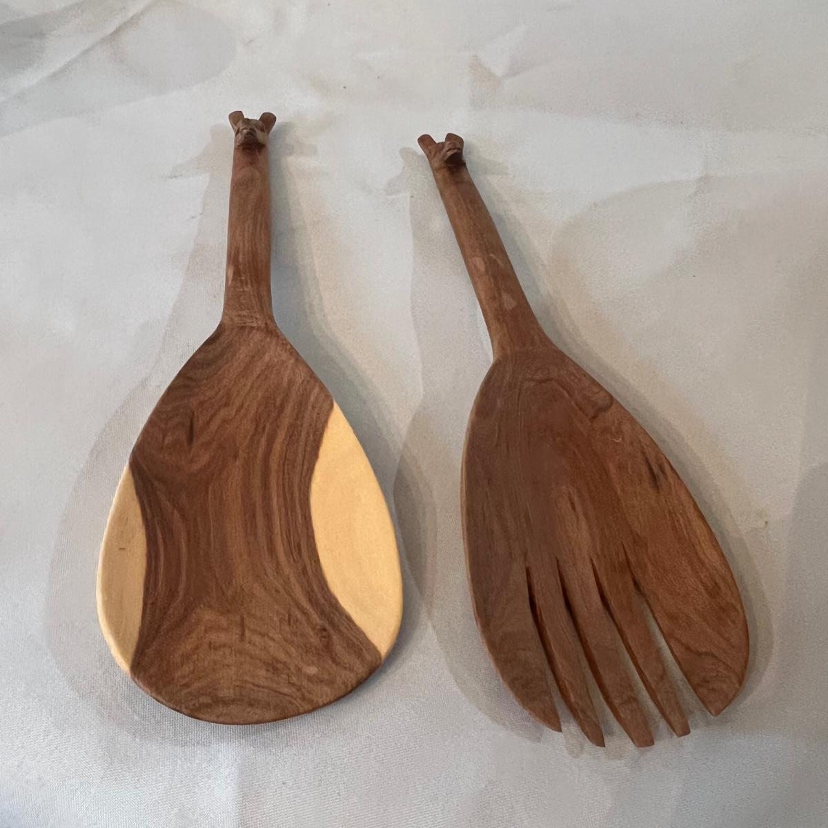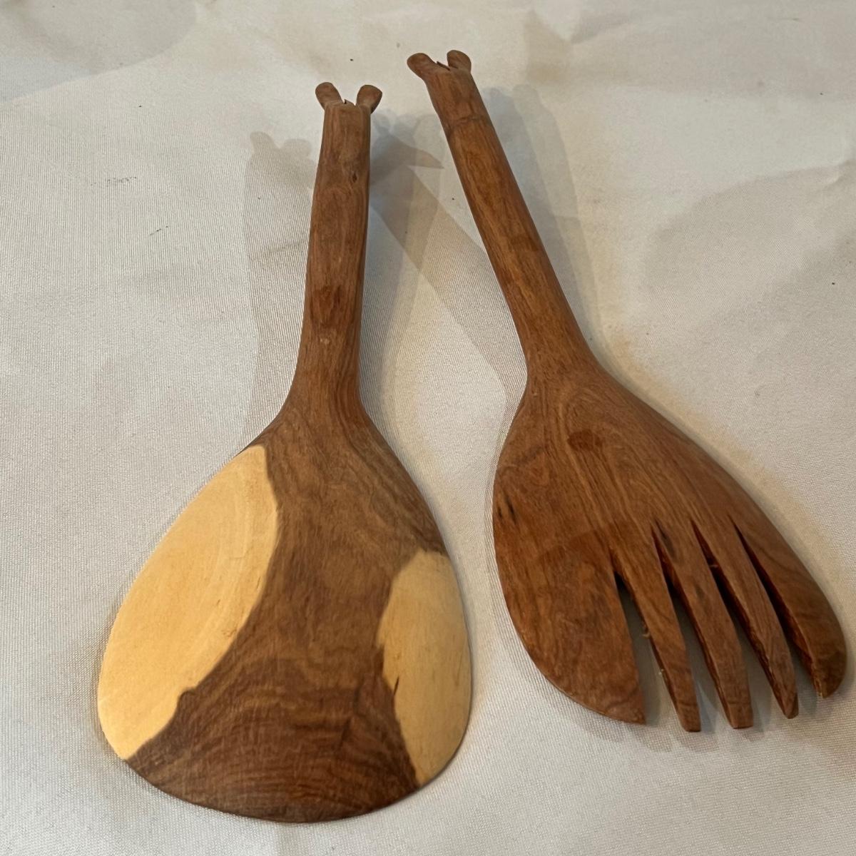 This African style wood box appears to be hand carved and features elephants, rhino and other African animals. It’s made from a lightweight wood; it has a small chip on its base. We have paired this with a set of wooden salad servers with giraffe heads.