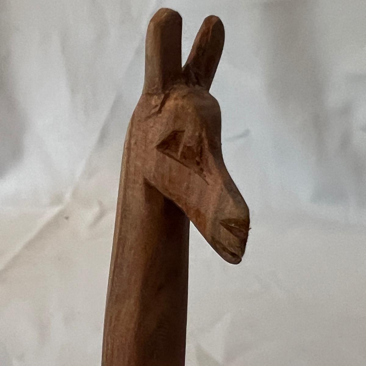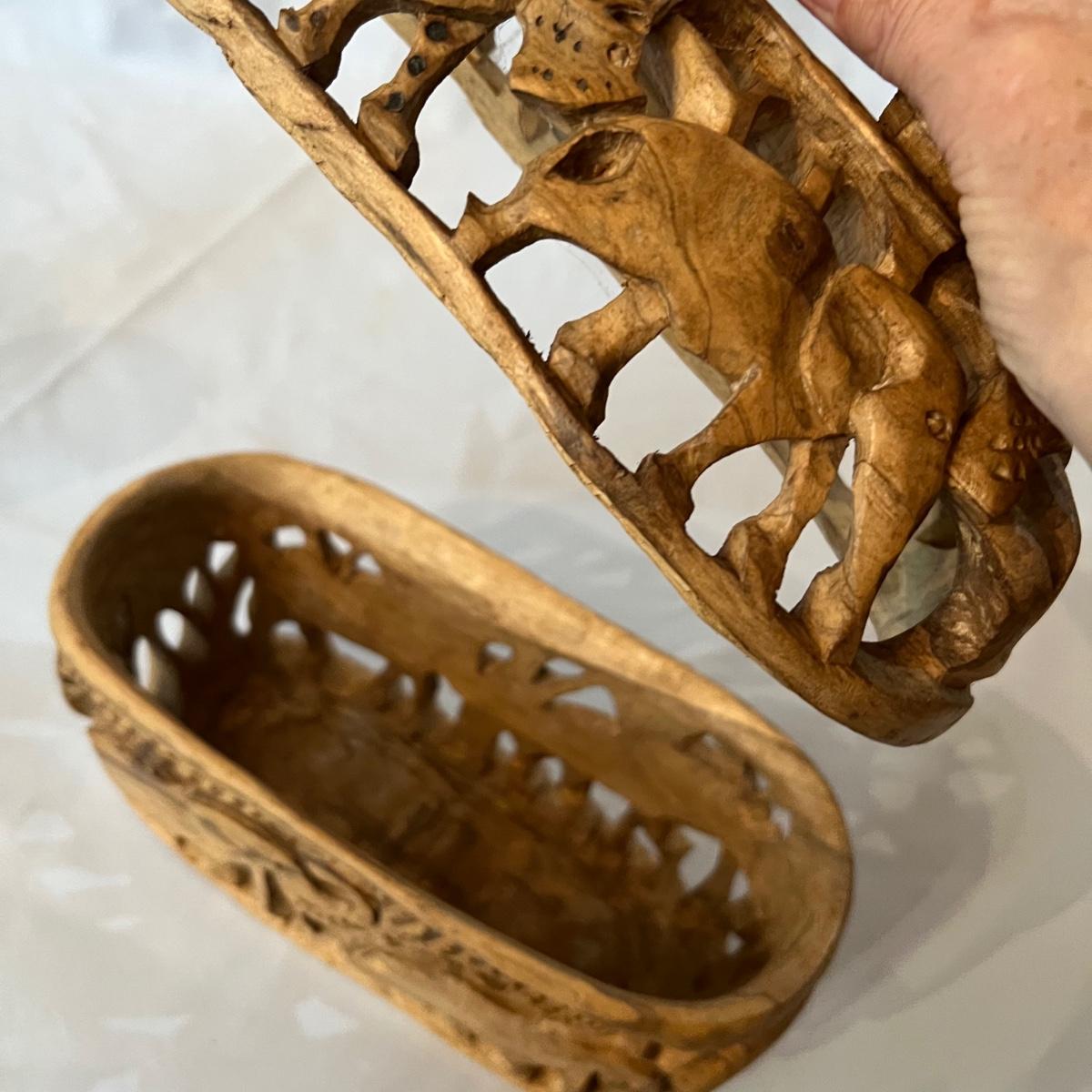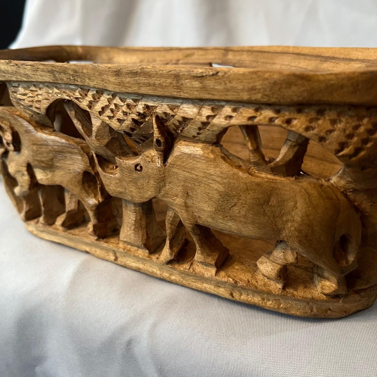 This African style wood box appears to be hand carved and features elephants, rhino and other African animals. It’s made from a lightweight wood; it has a small chip on its base. We have paired this with a set of wooden salad servers with giraffe heads.