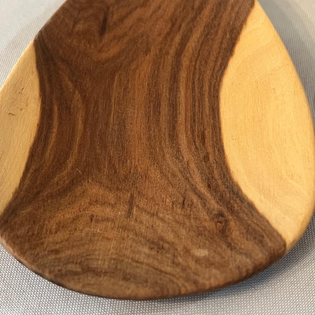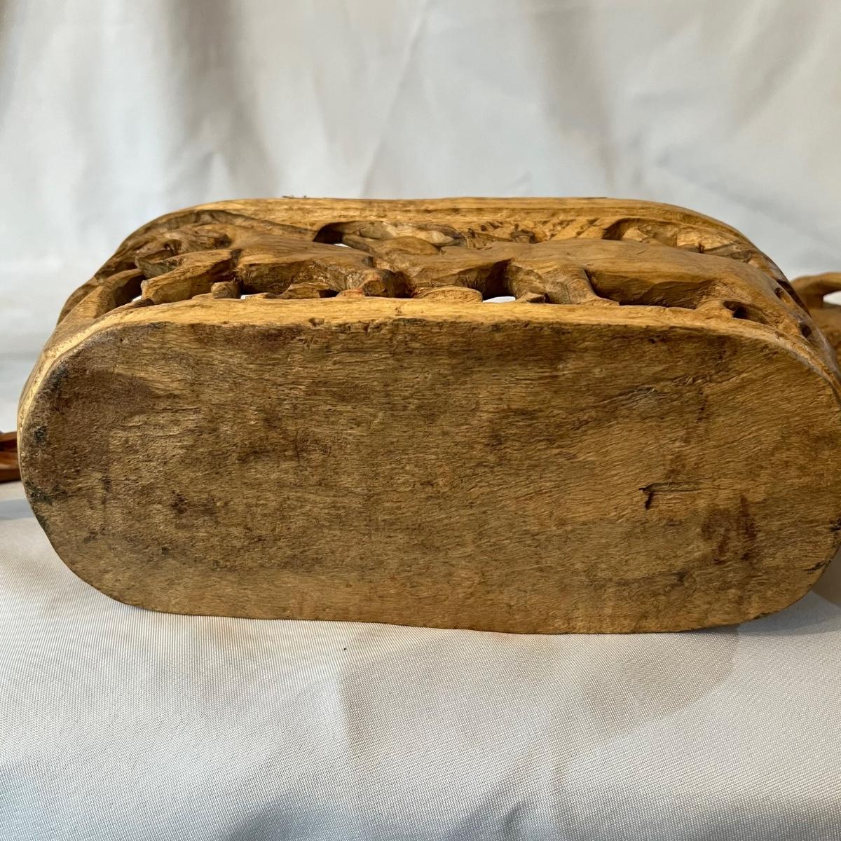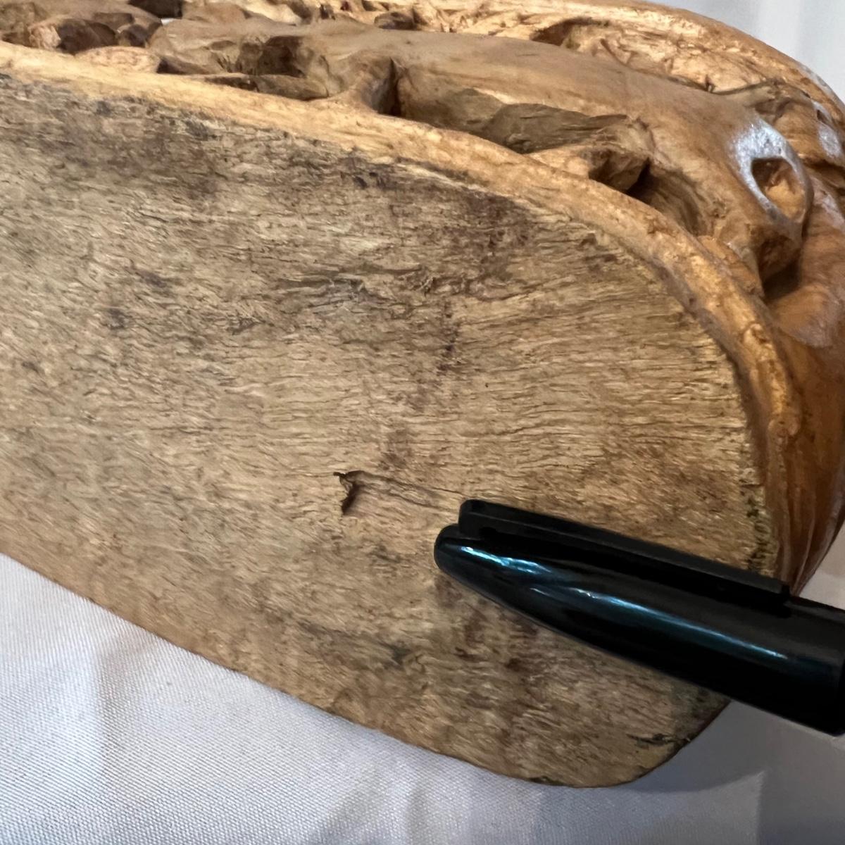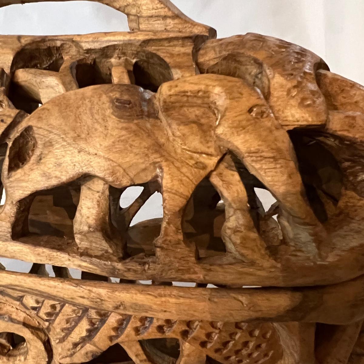 This African style wood box appears to be hand carved and features elephants, rhino and other African animals. It’s made from a lightweight wood; it has a small chip on its base. We have paired this with a set of wooden salad servers with giraffe heads.