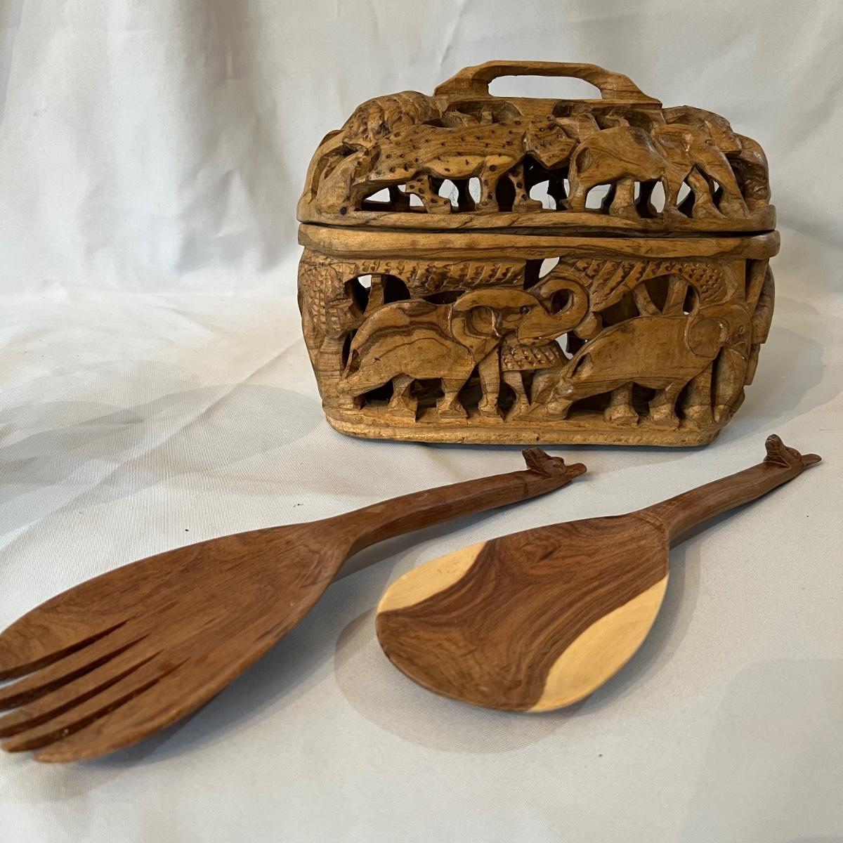 Hand Carved African Wood Lidded Box & Wood Salad Servers (FR-RG)