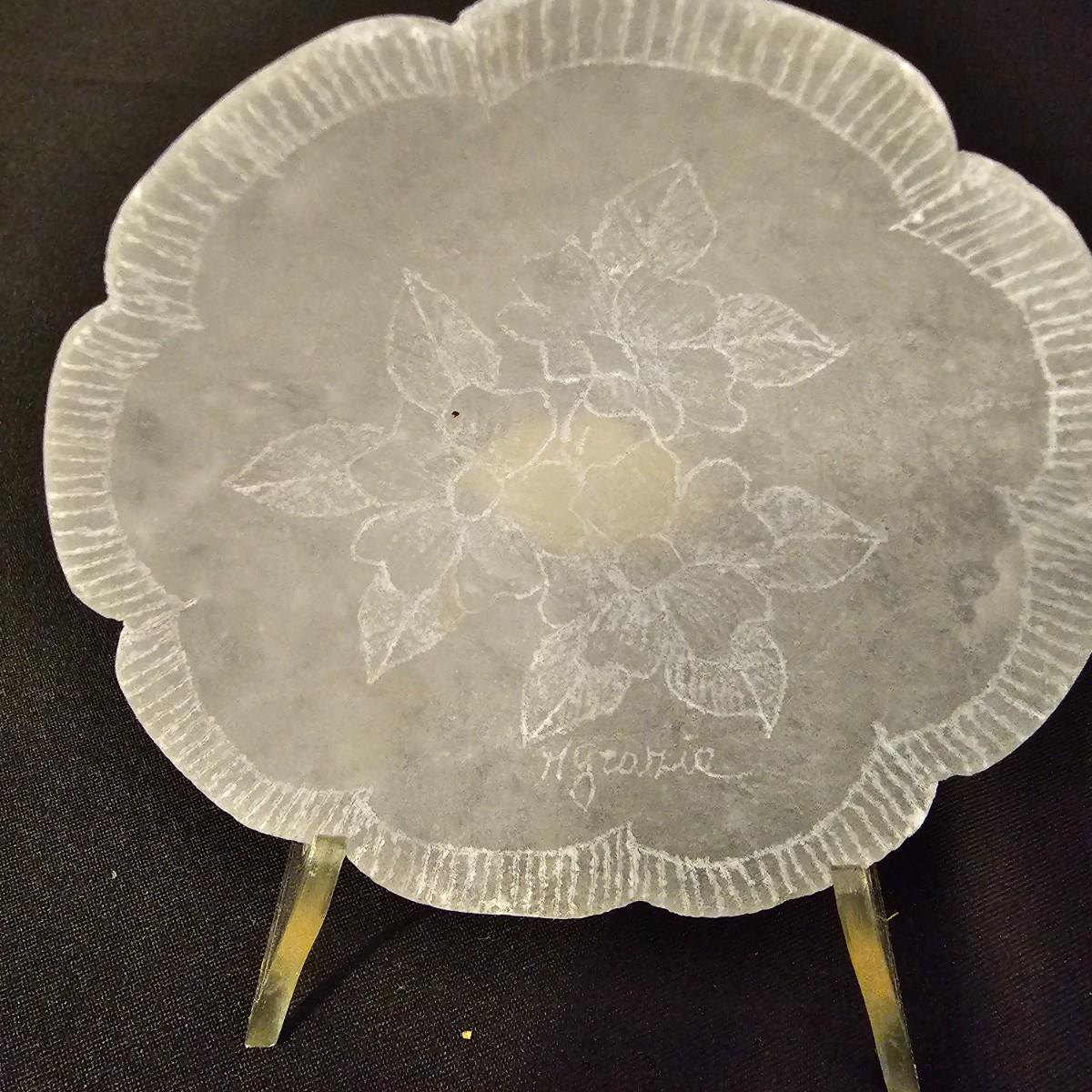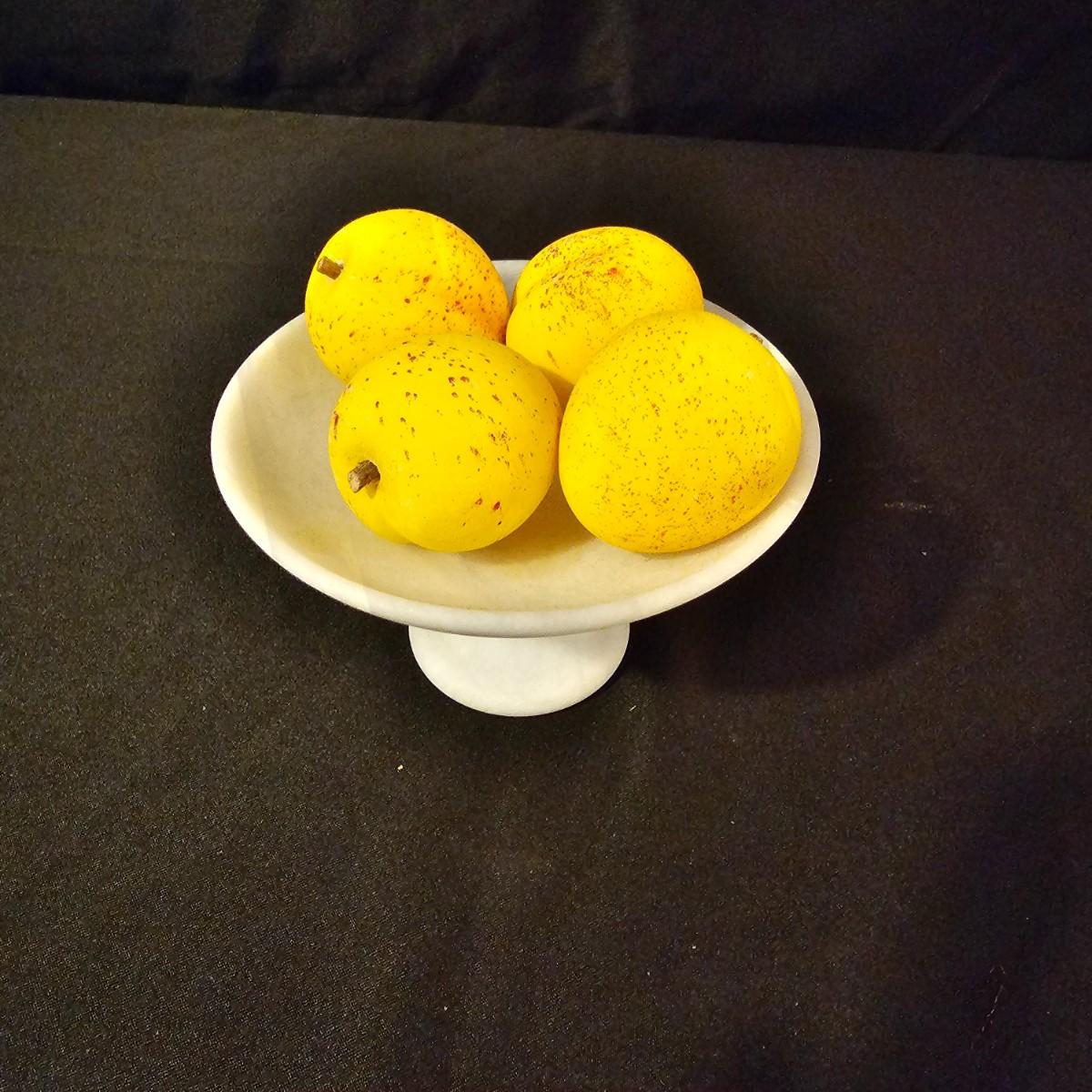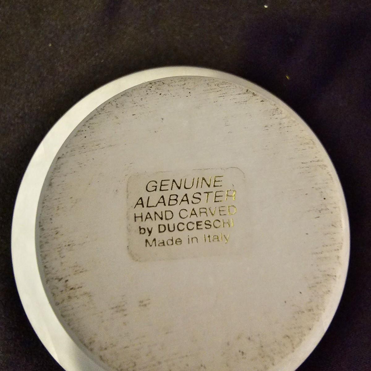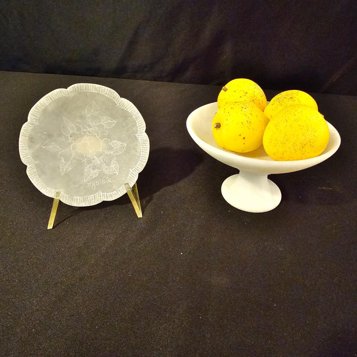 Delicate alabaster items from Italy. Small etched plate has stand, is signed and measures 3.25"D. Footed bowl is 4"D x 2.25"H, has four apples that appear to be stone. See photos for details. Shipping available.