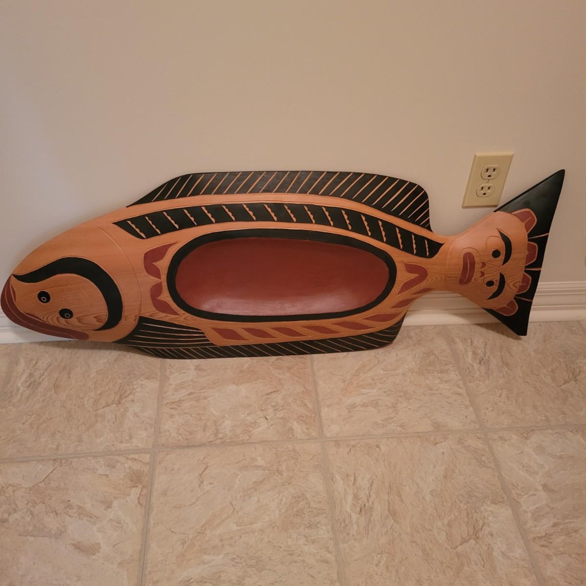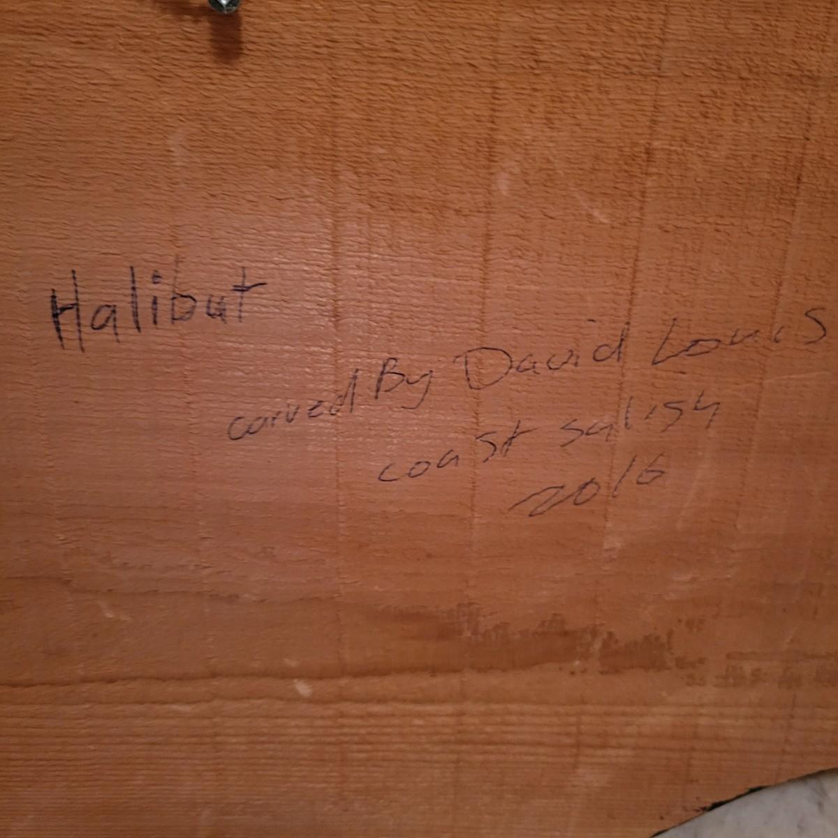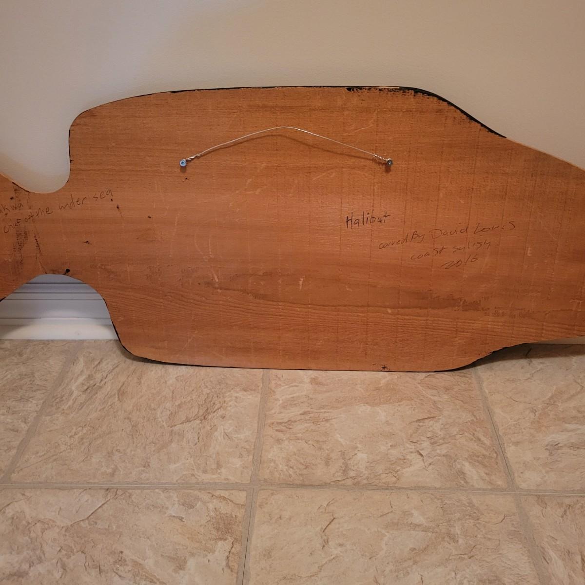 A wooden hand carved and painted halibut by David Louis, Pacific coast Salish. This piece is titled "Koomakwa, Chief of the Under Sea" and features rich colors. It measures approximately 42" x 2" x 16"H. Shipping available