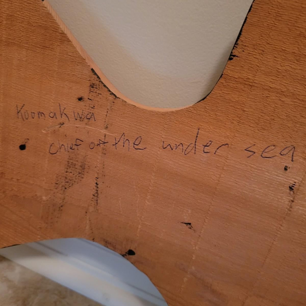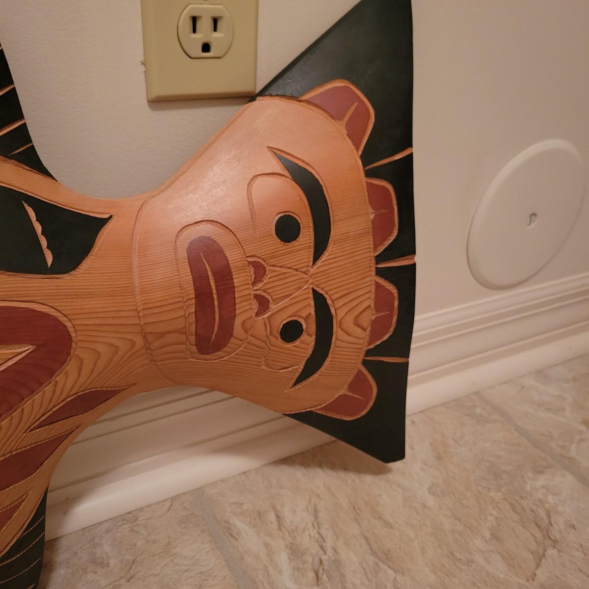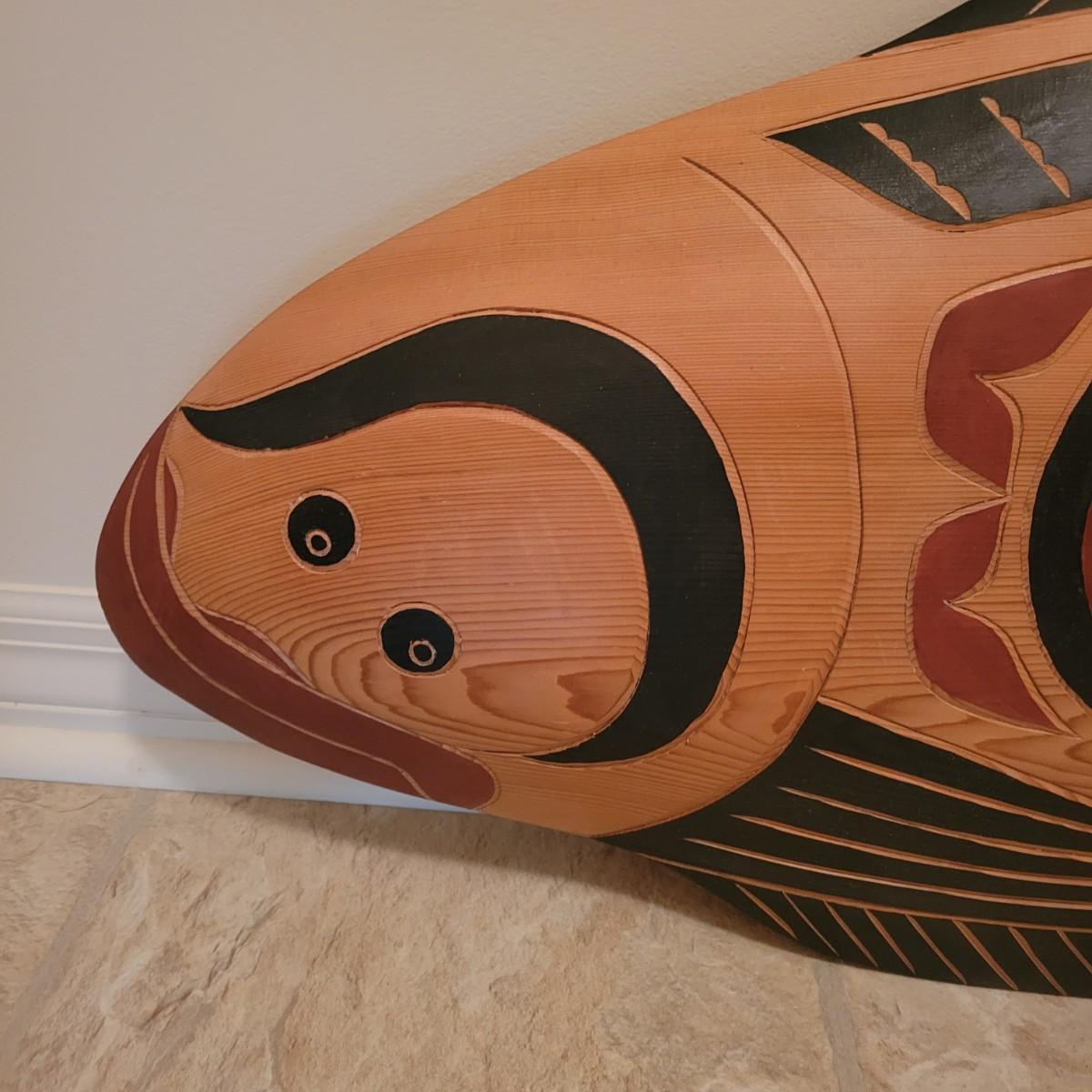 A wooden hand carved and painted halibut by David Louis, Pacific coast Salish. This piece is titled "Koomakwa, Chief of the Under Sea" and features rich colors. It measures approximately 42" x 2" x 16"H. Shipping available