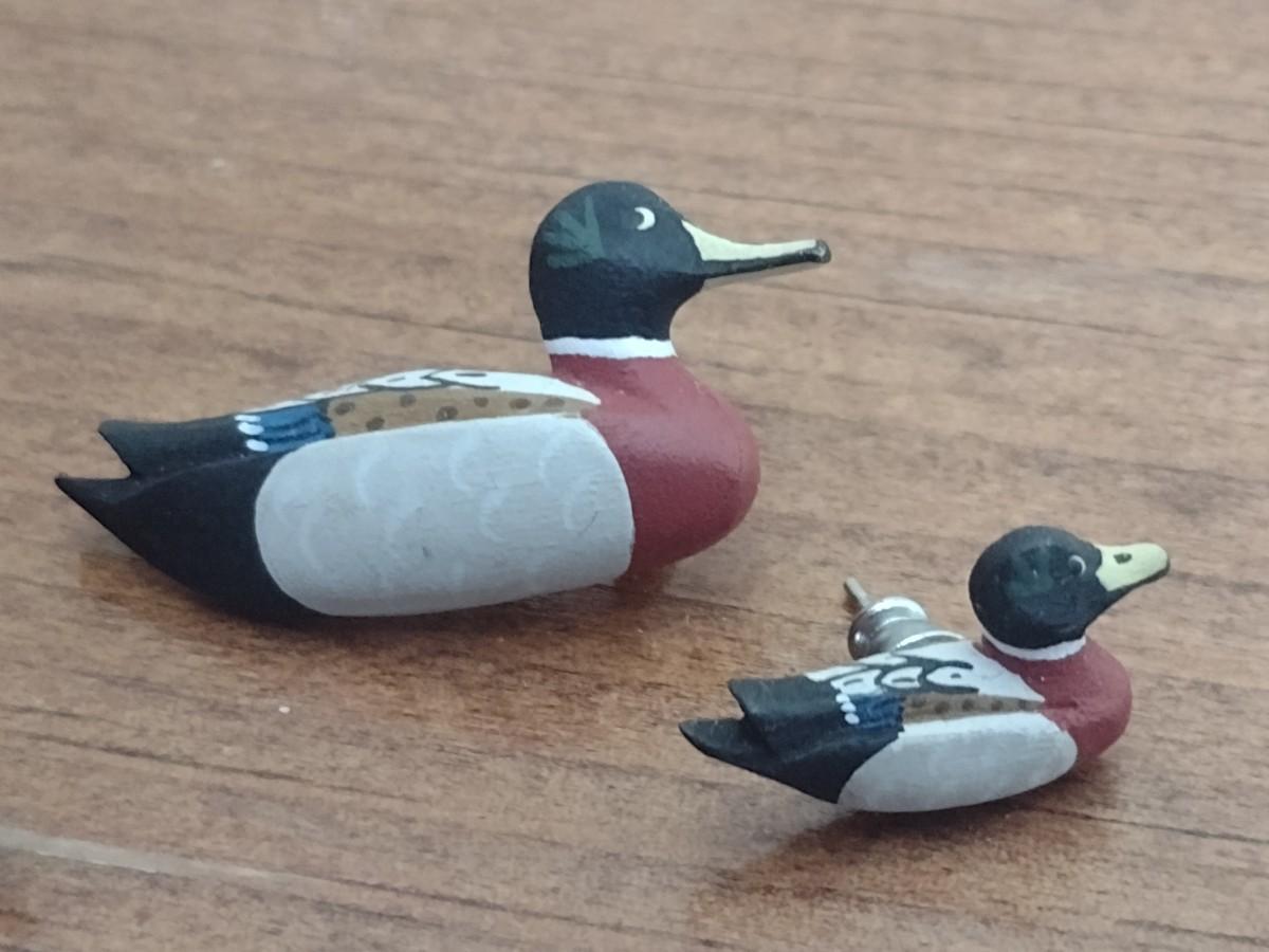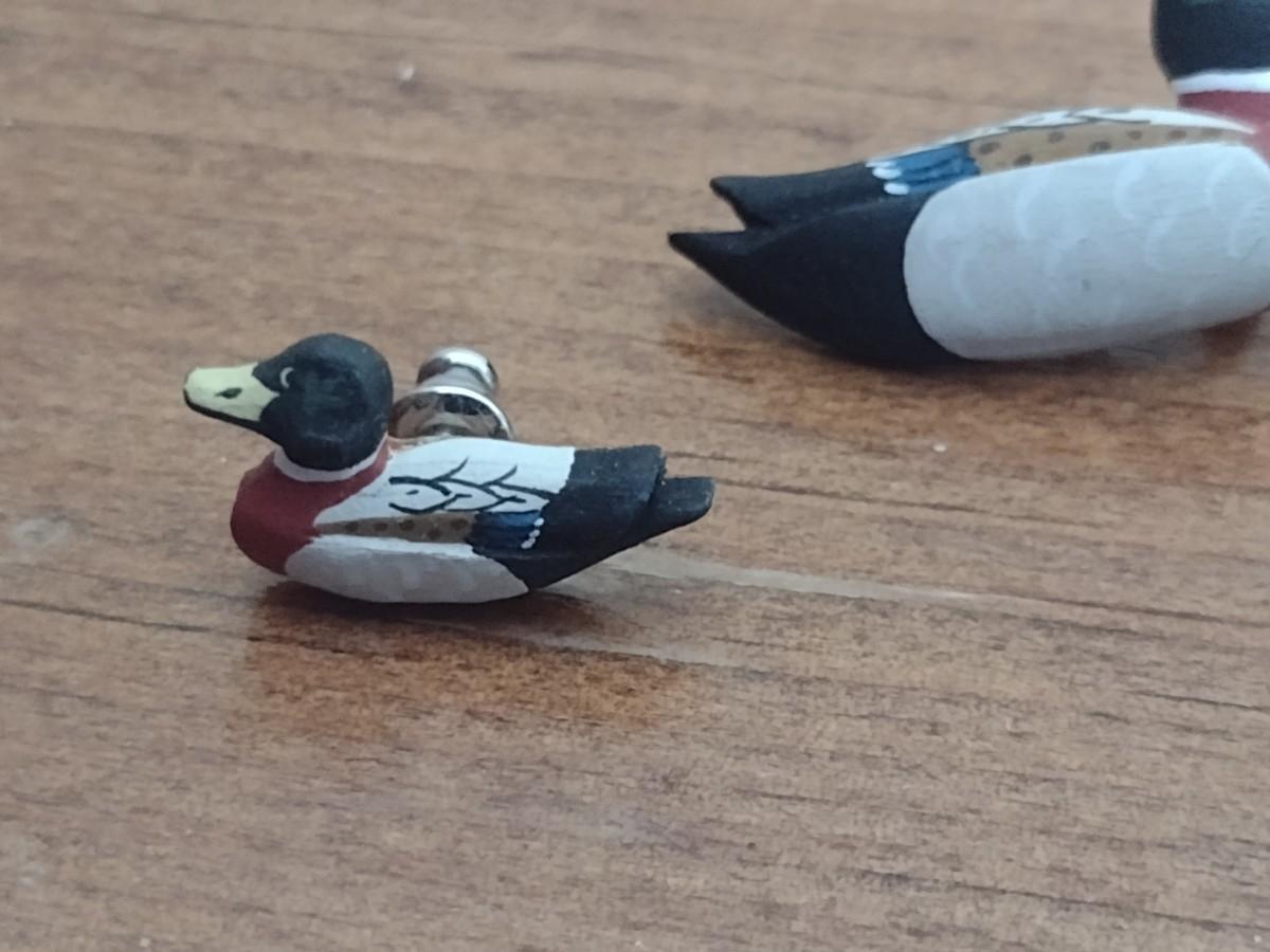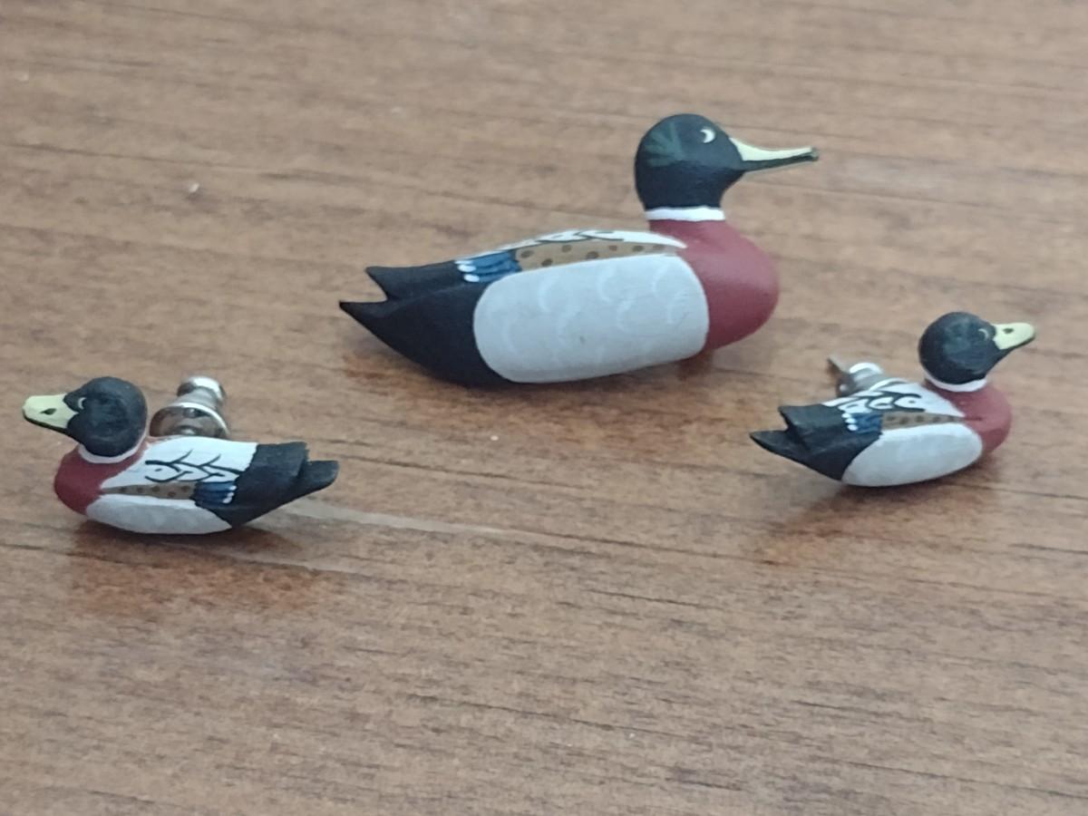 Hand Carved and Painted Miniature Wood Duck Pin and Earrings