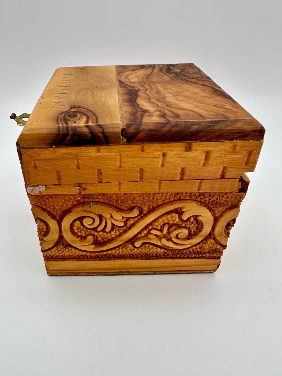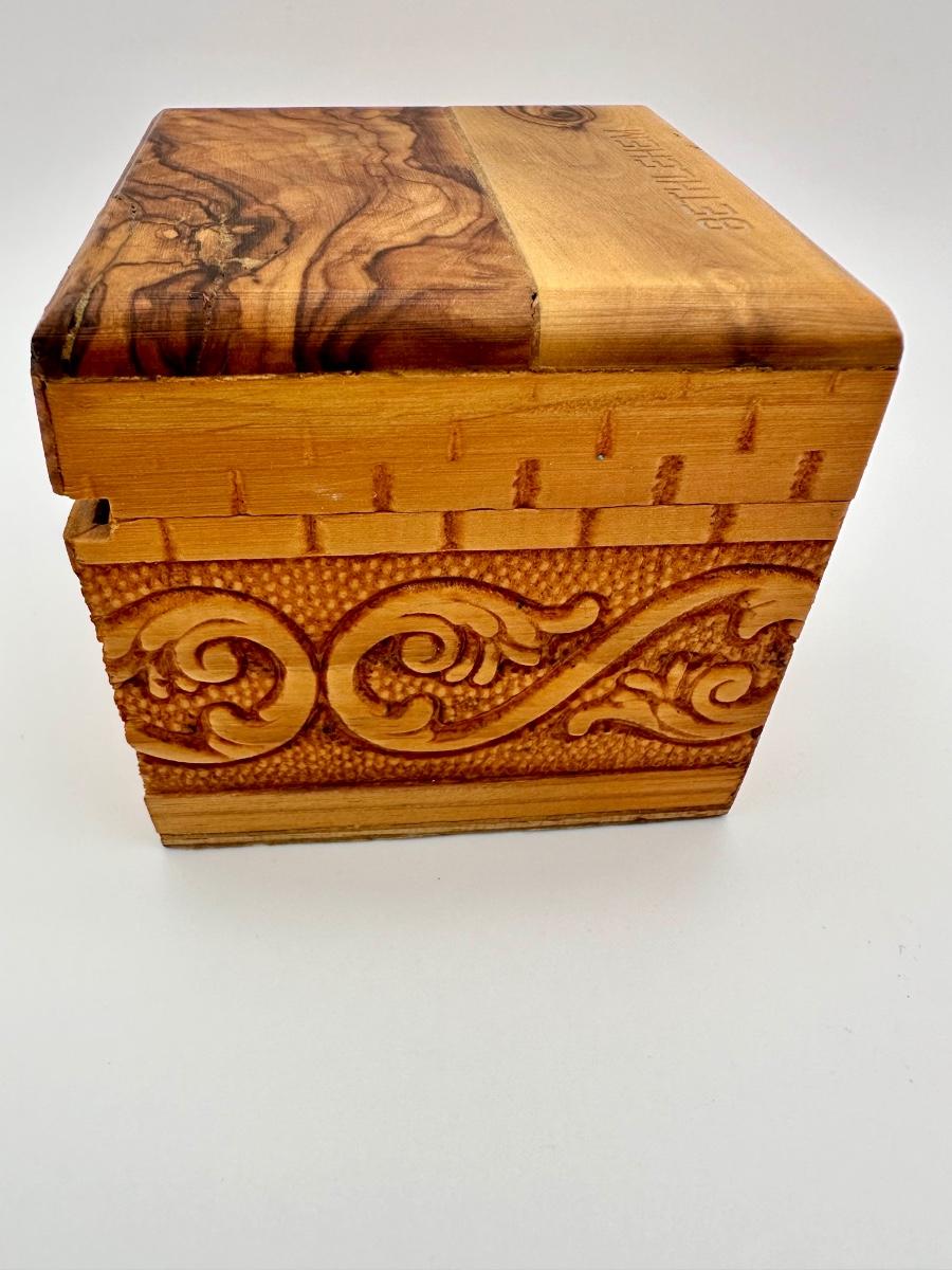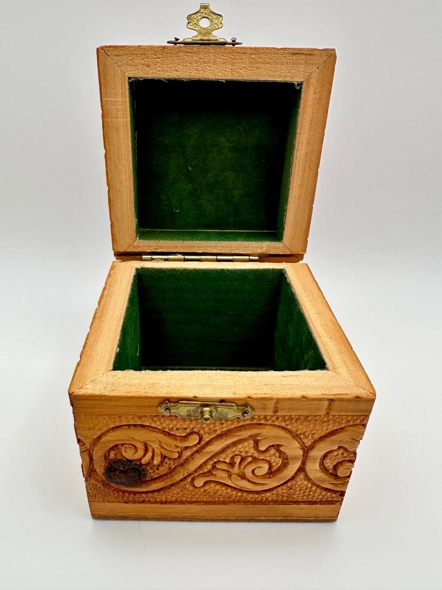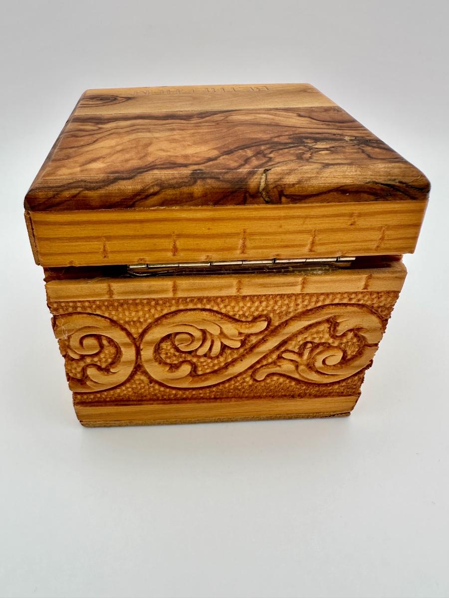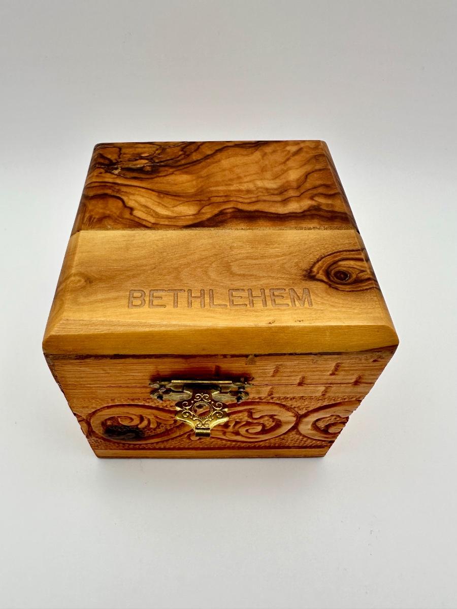 Beautiful, hand carved ring box, marked “Bethlehem” felt lined.