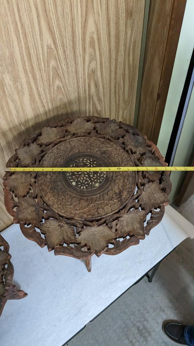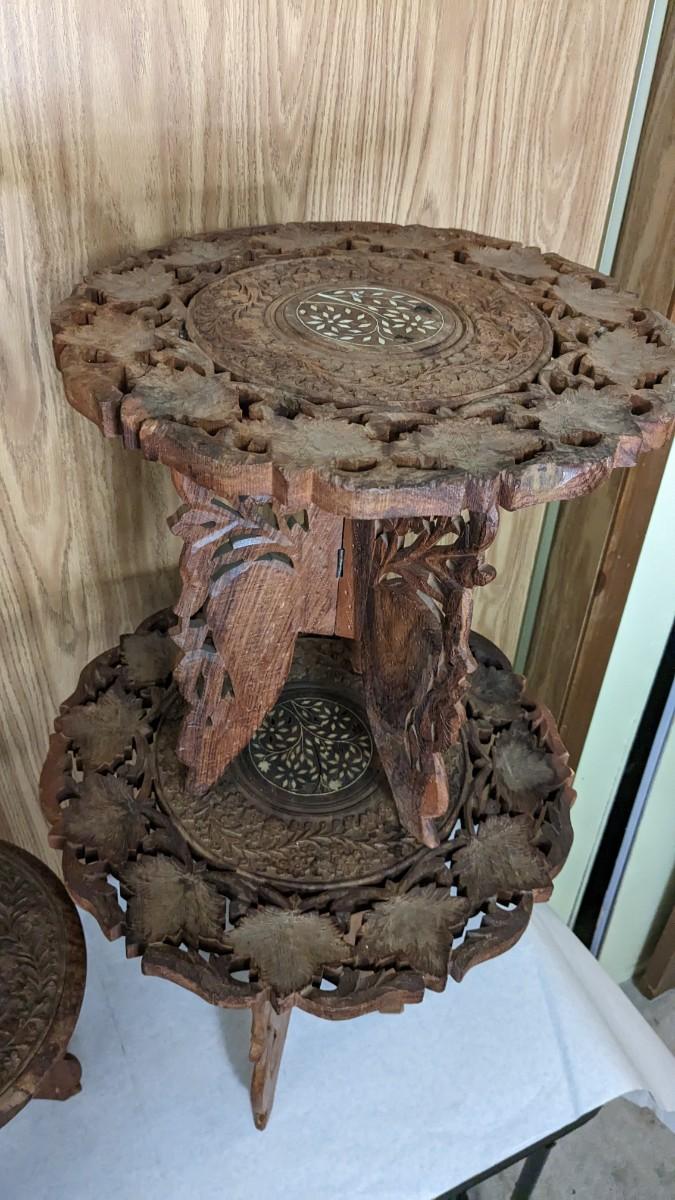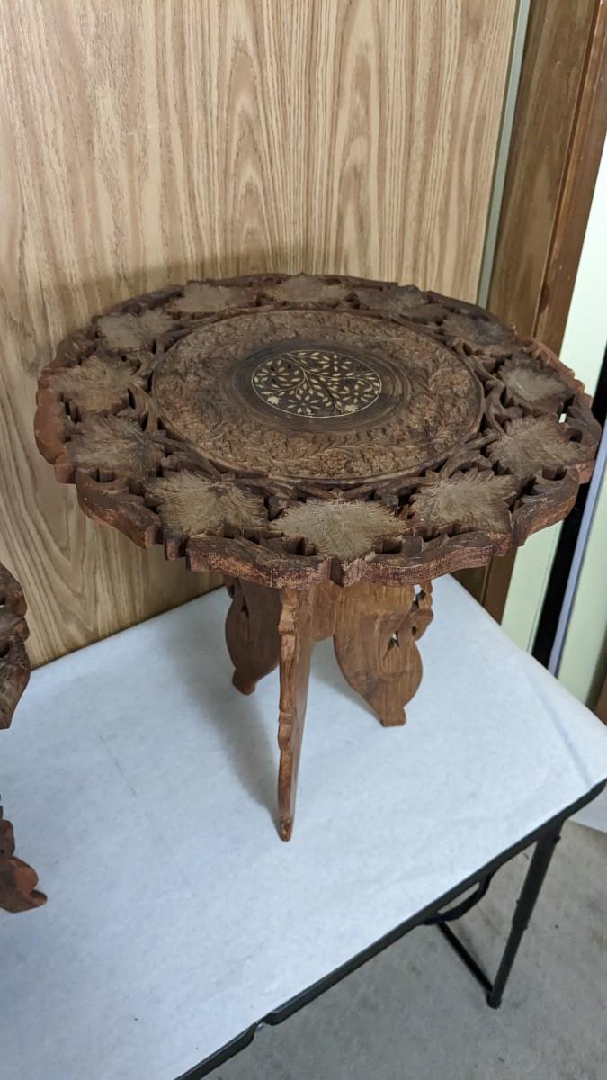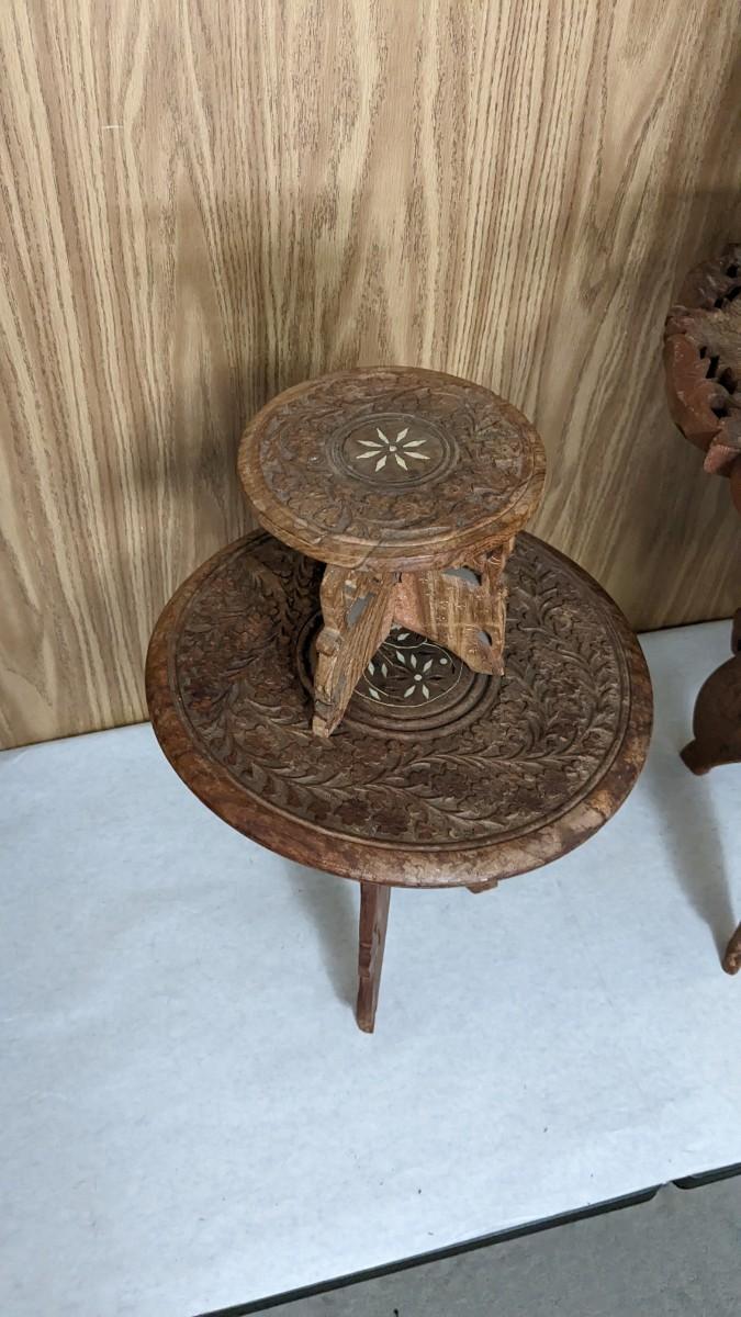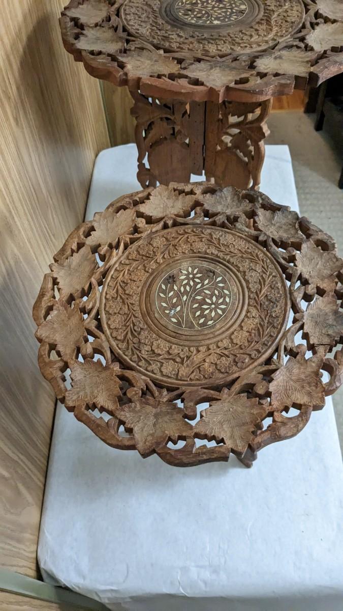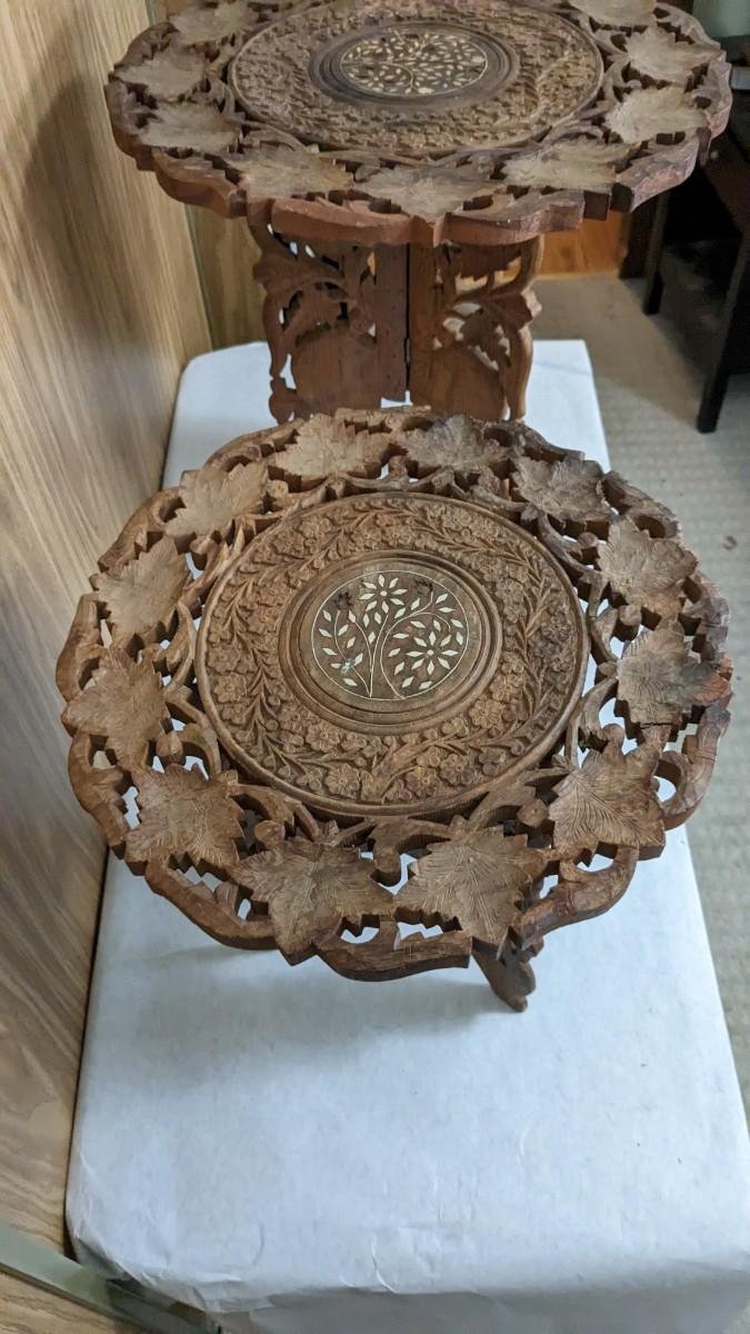 4ea, varied design and size tables from India, minor flaws noted to each piece including missing inlay, dryness to wood, and some scuffs. As well as one leg needing work to hinges, note in photos. Each are functional and gorgeous. bdrm1
