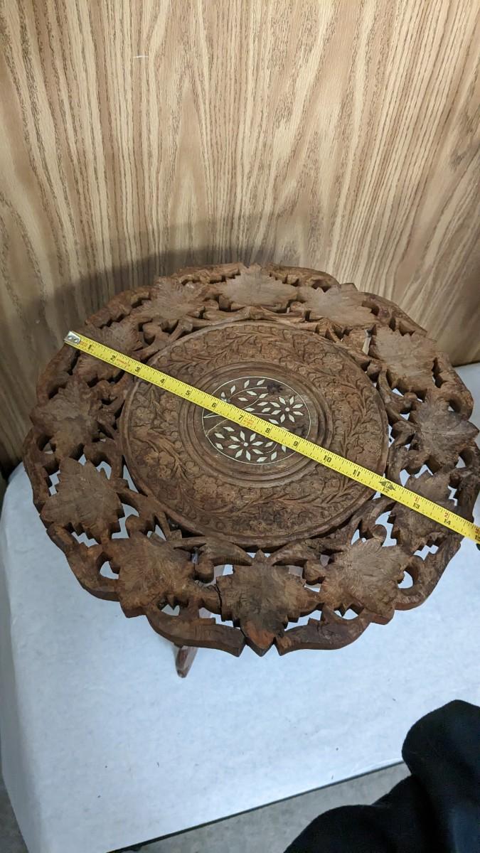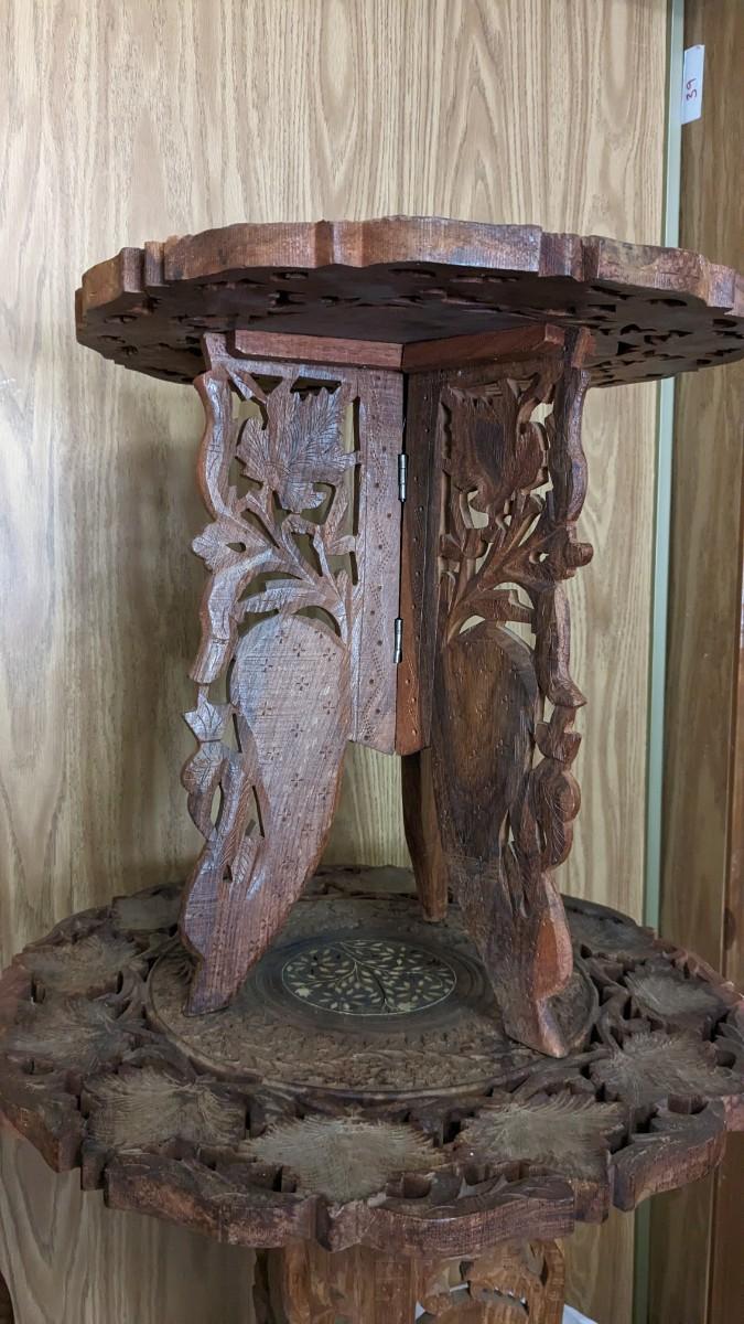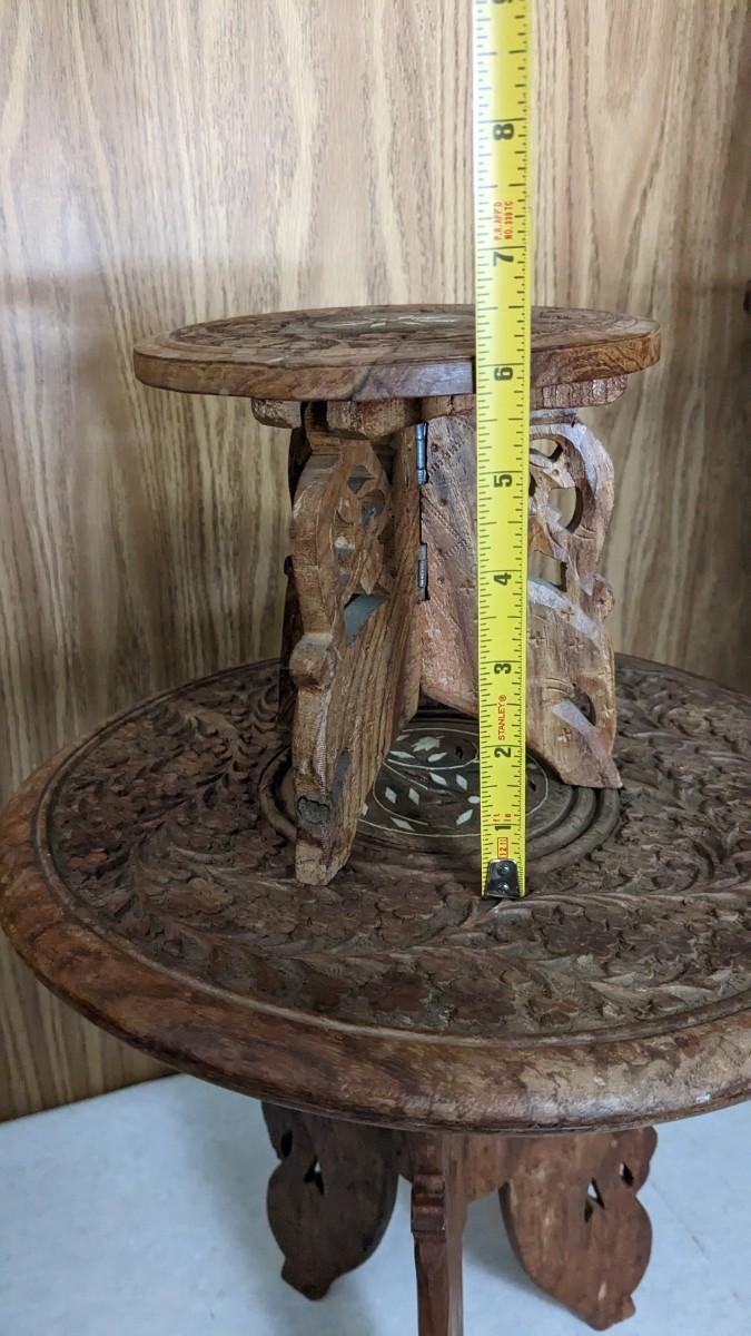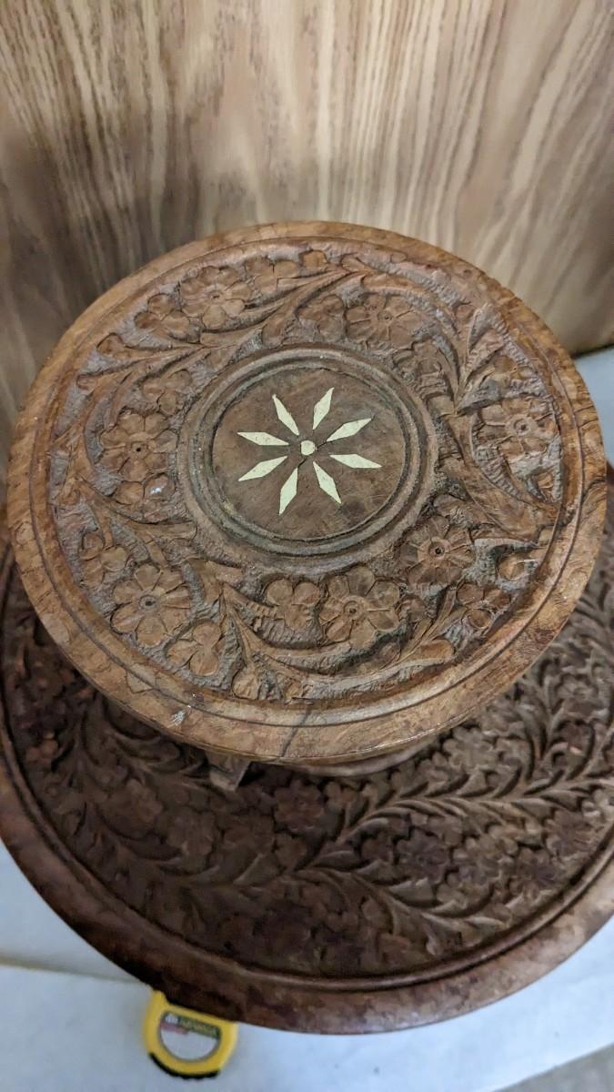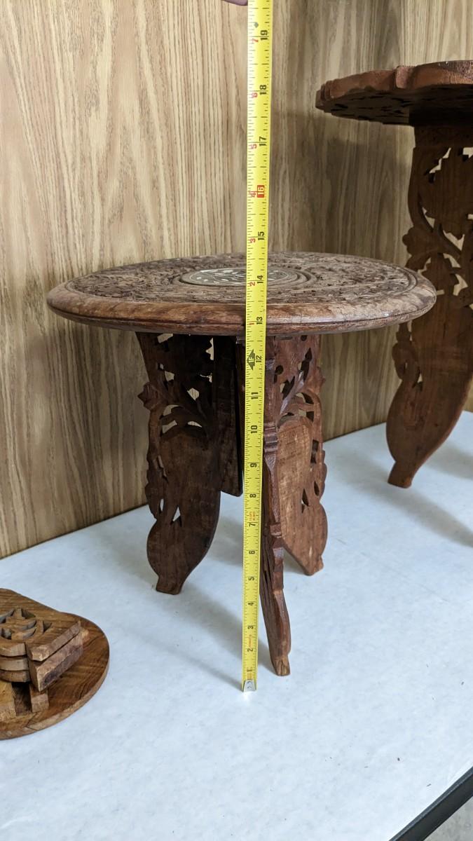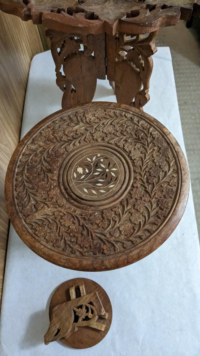 4ea, varied design and size tables from India, minor flaws noted to each piece including missing inlay, dryness to wood, and some scuffs. As well as one leg needing work to hinges, note in photos. Each are functional and gorgeous. bdrm1
