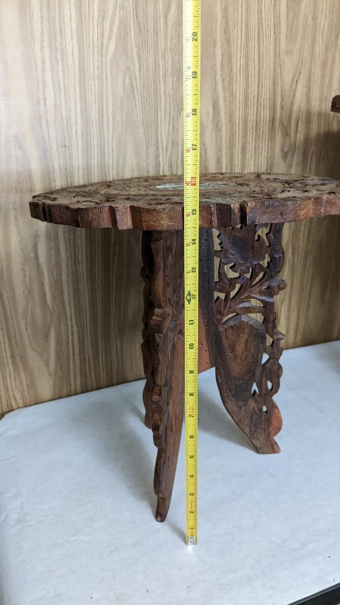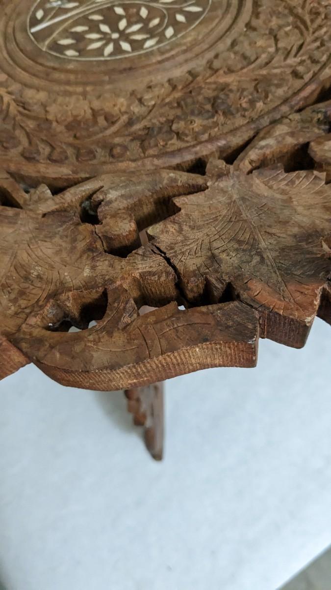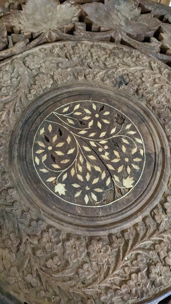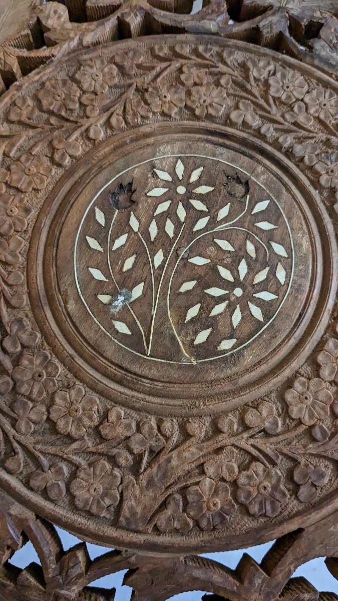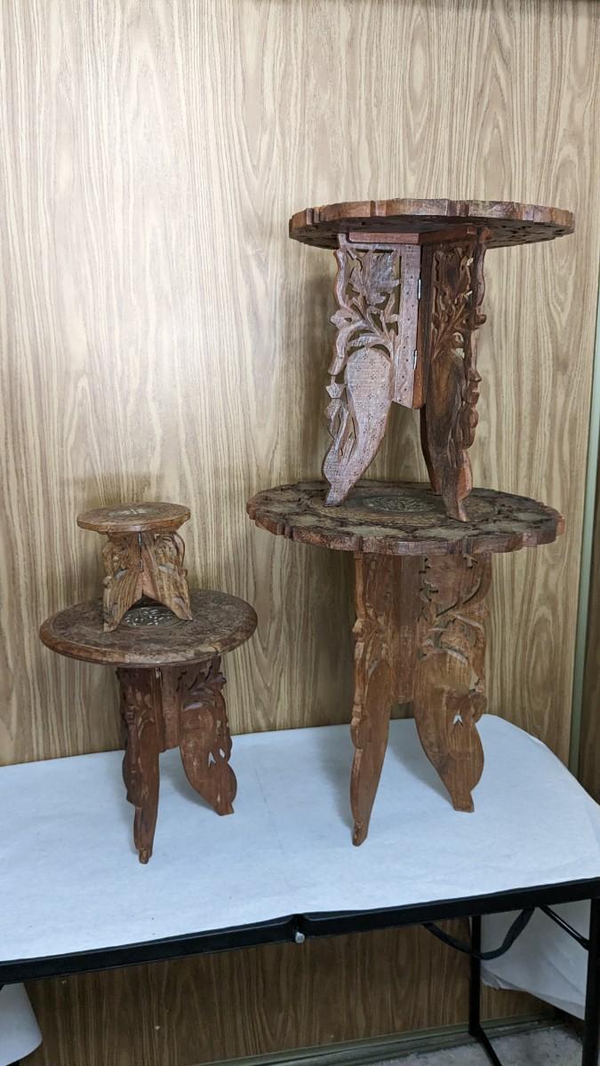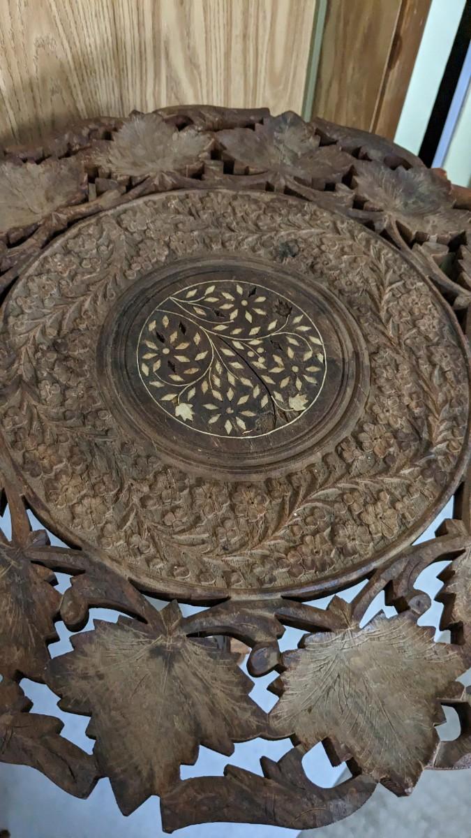 4ea, varied design and size tables from India, minor flaws noted to each piece including missing inlay, dryness to wood, and some scuffs. As well as one leg needing work to hinges, note in photos. Each are functional and gorgeous. bdrm1