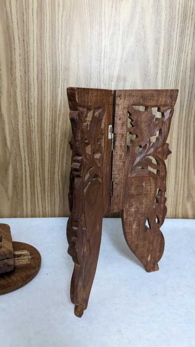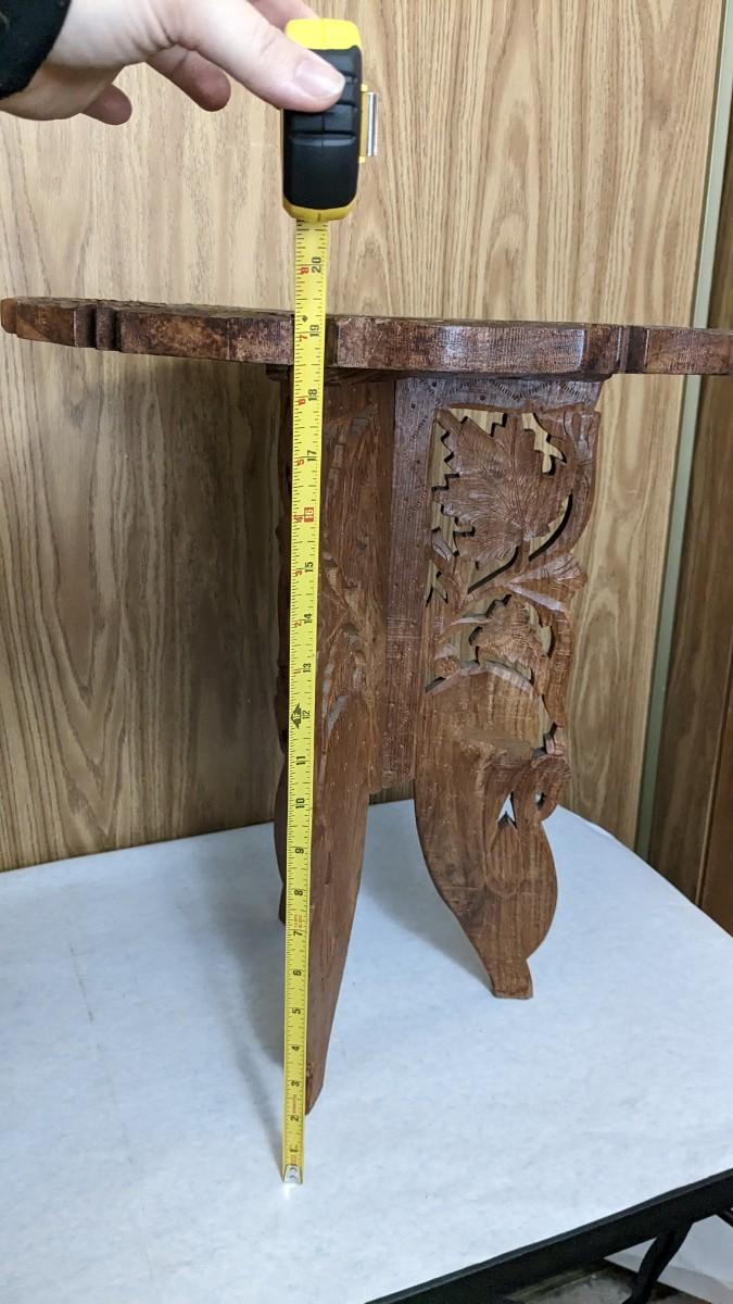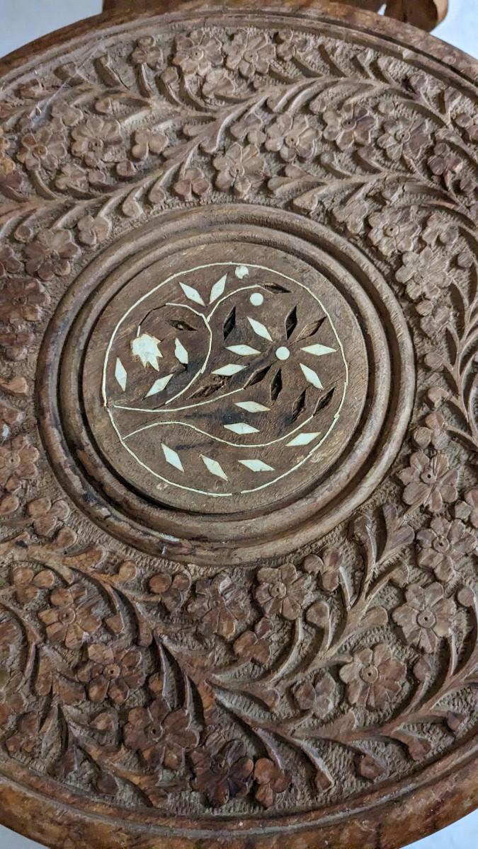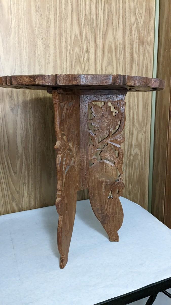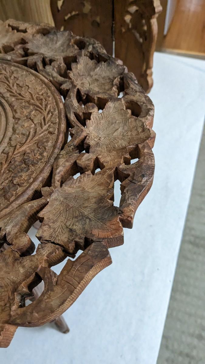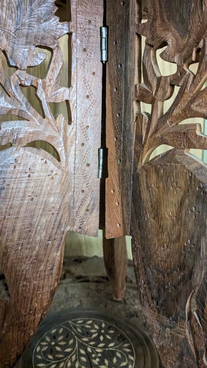 4ea, varied design and size tables from India, minor flaws noted to each piece including missing inlay, dryness to wood, and some scuffs. As well as one leg needing work to hinges, note in photos. Each are functional and gorgeous. bdrm1