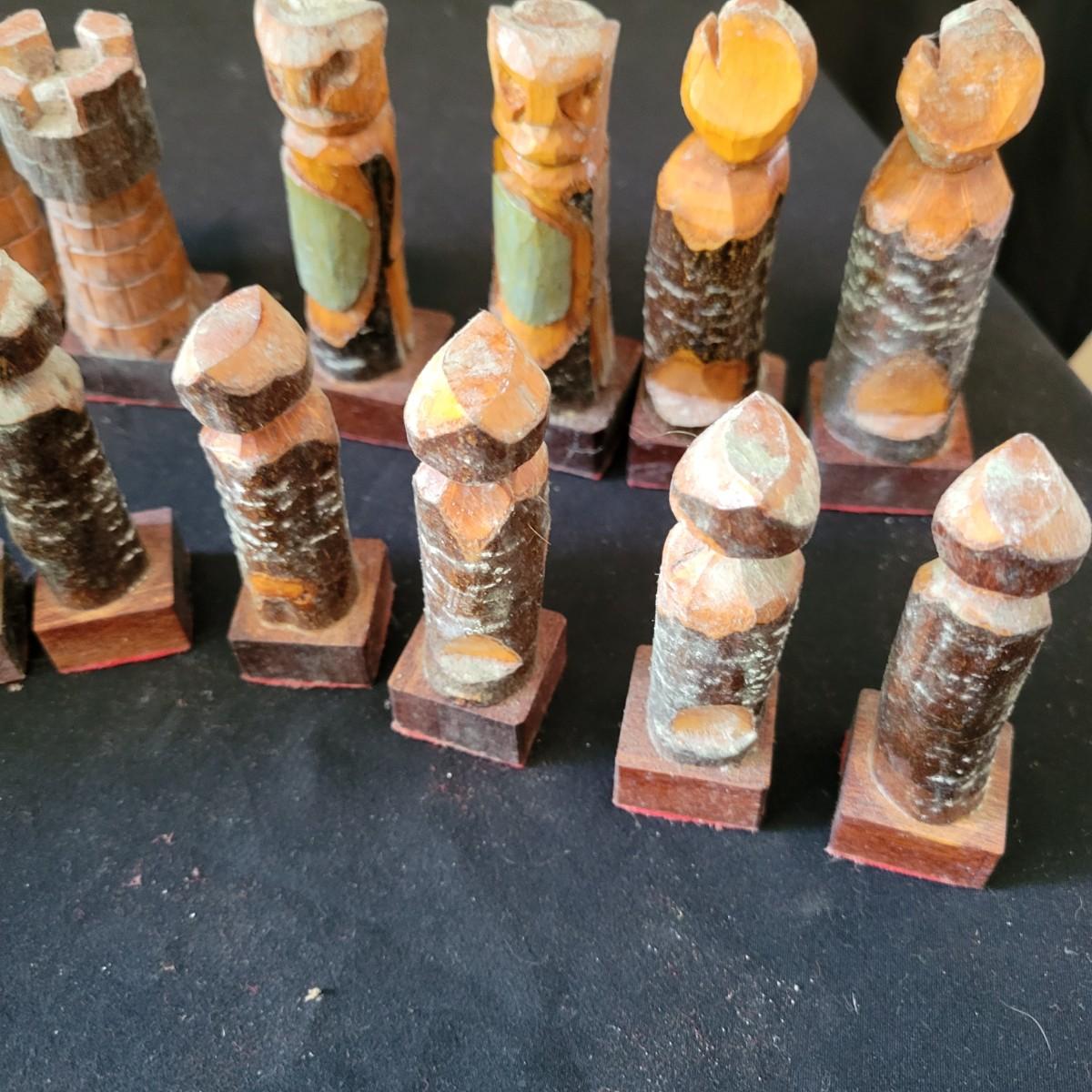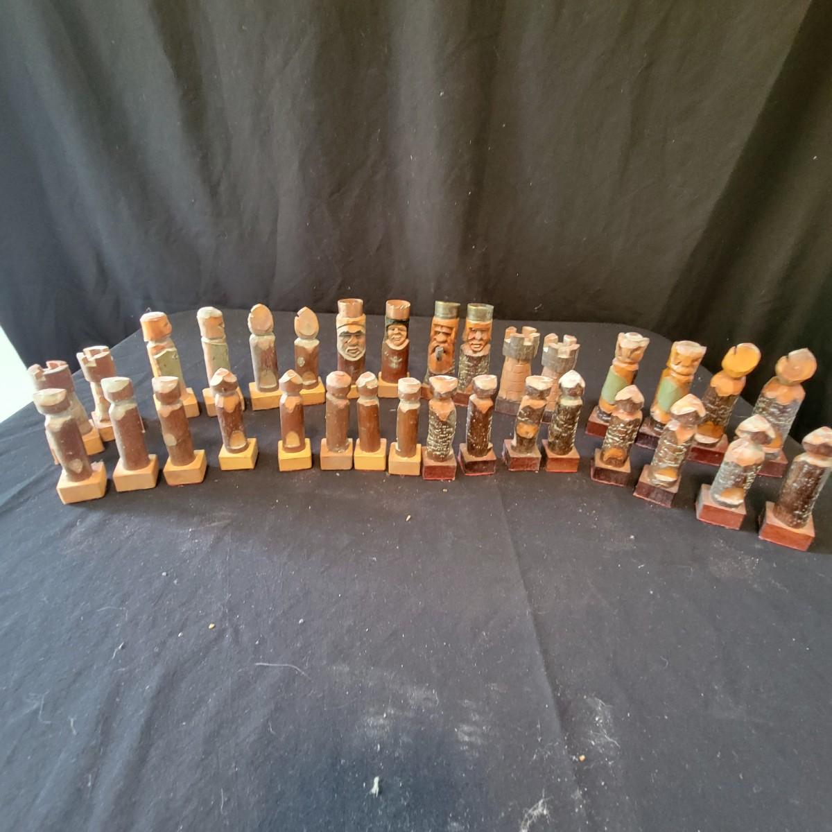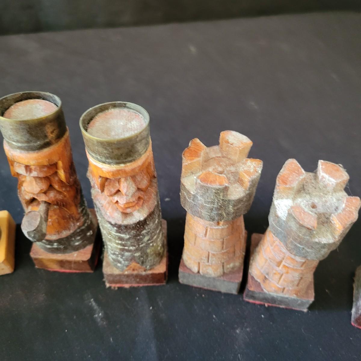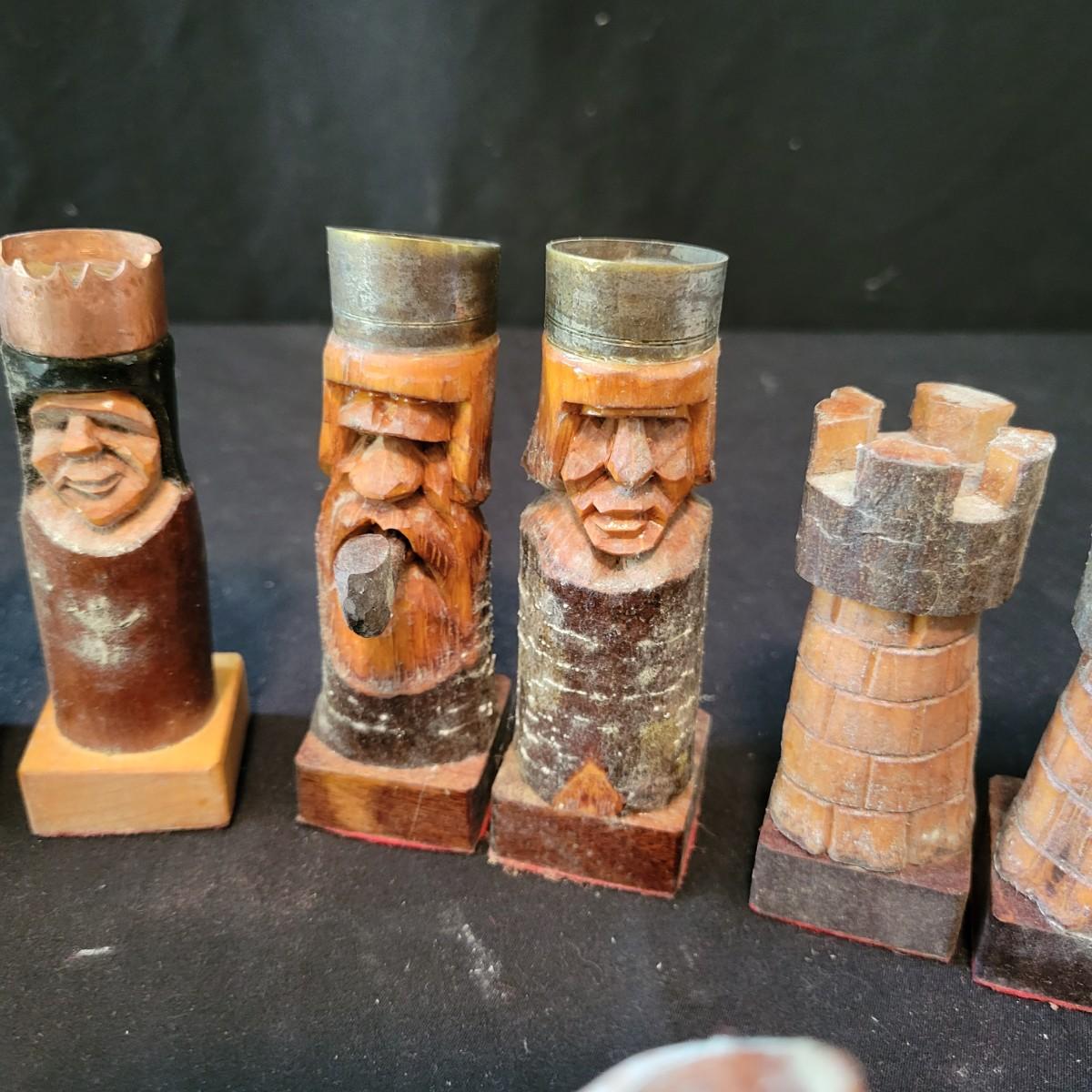 Complete hand carved chess pieces with felt bottoms. Pieces have been stored in a basement and are a bit moldy, bit should clean up nicely since they are lacquered. Multiple pieces have copper embellishments. Kings are approximately 4.25" tall. Shipping available