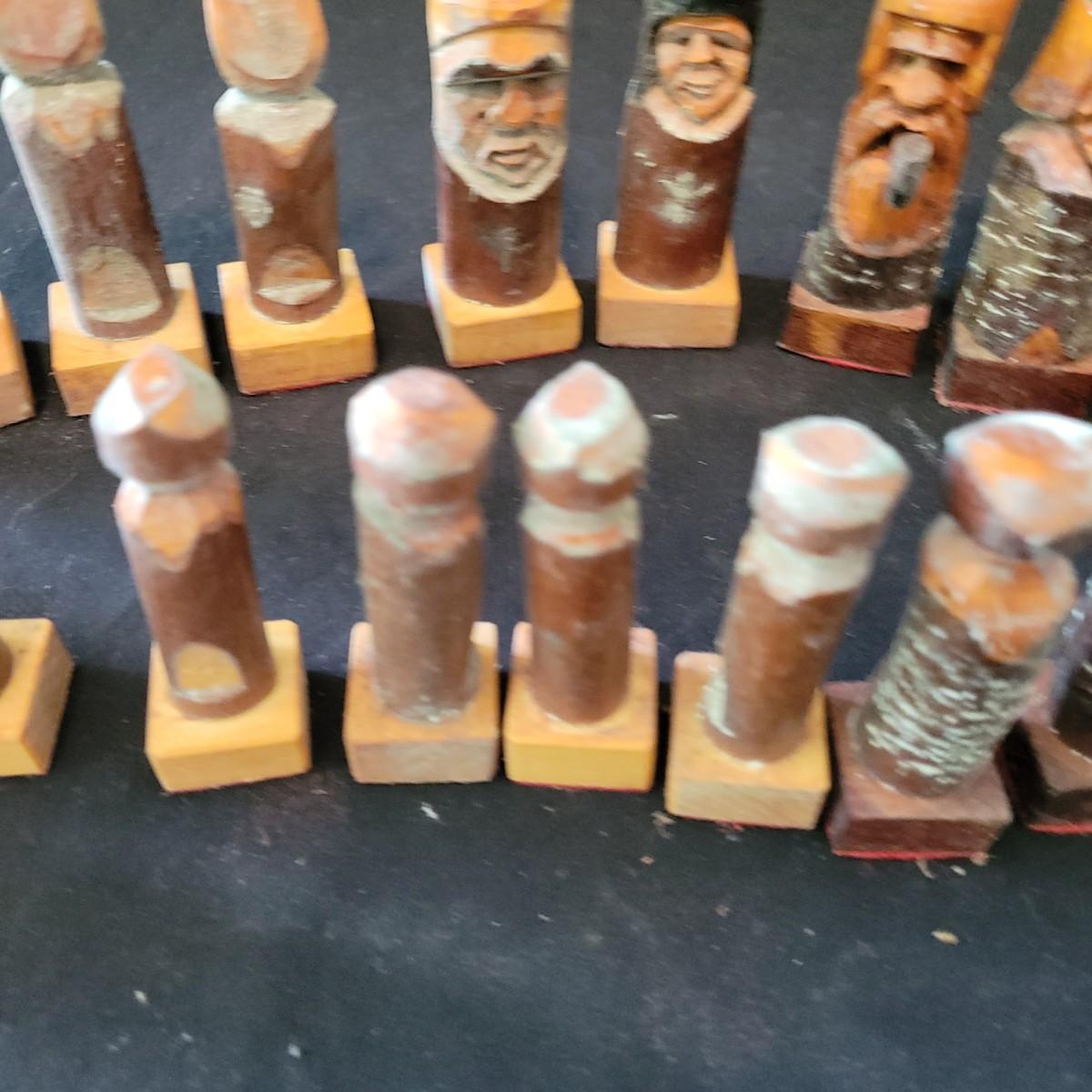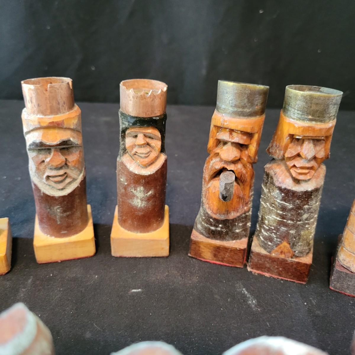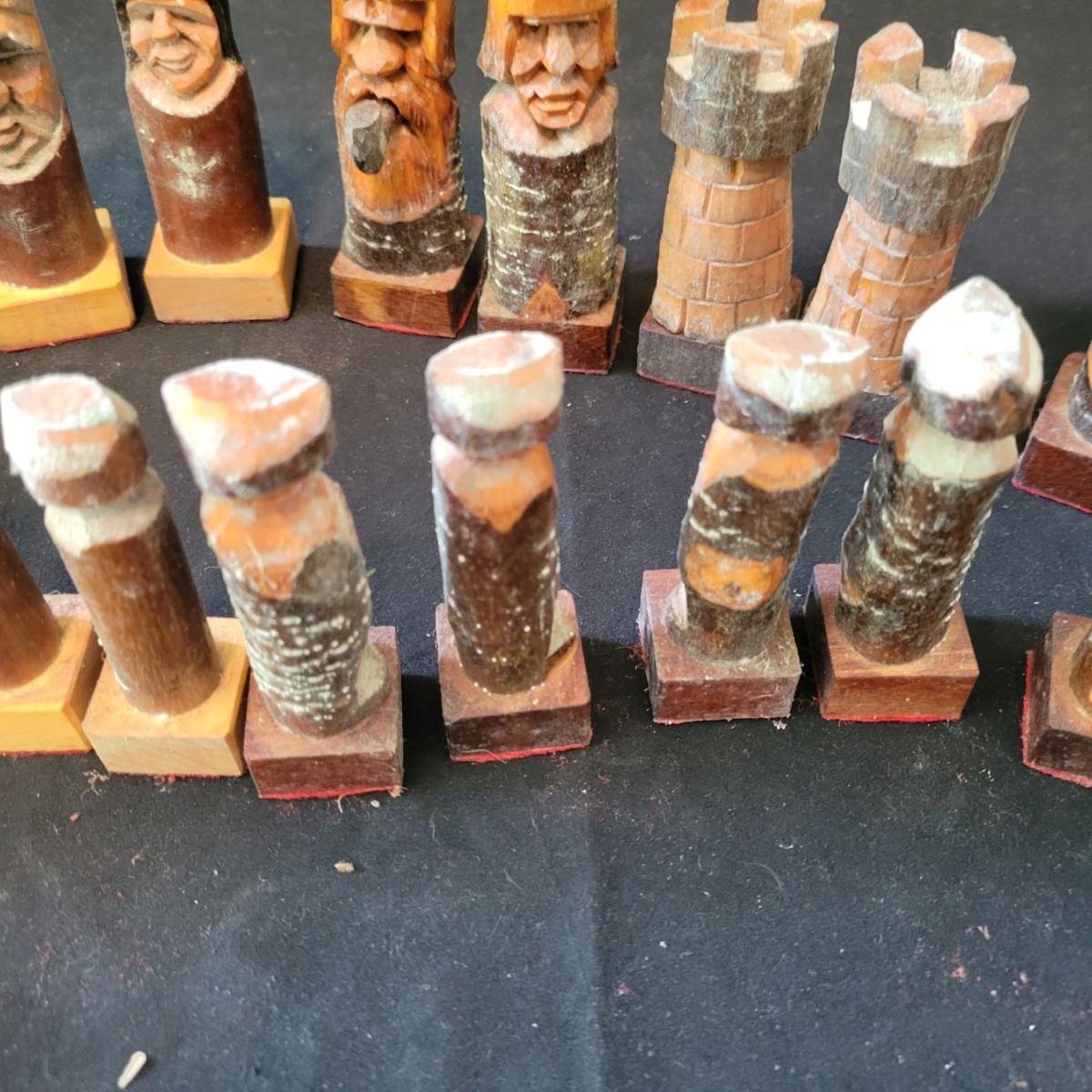 Complete hand carved chess pieces with felt bottoms. Pieces have been stored in a basement and are a bit moldy, bit should clean up nicely since they are lacquered. Multiple pieces have copper embellishments. Kings are approximately 4.25" tall. Shipping available