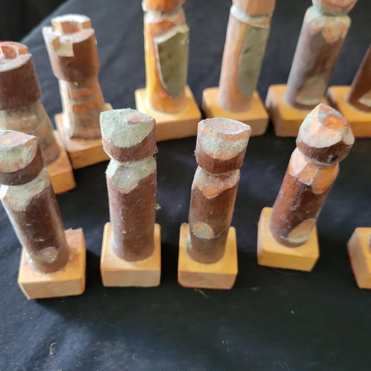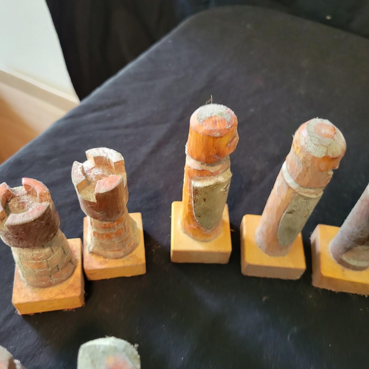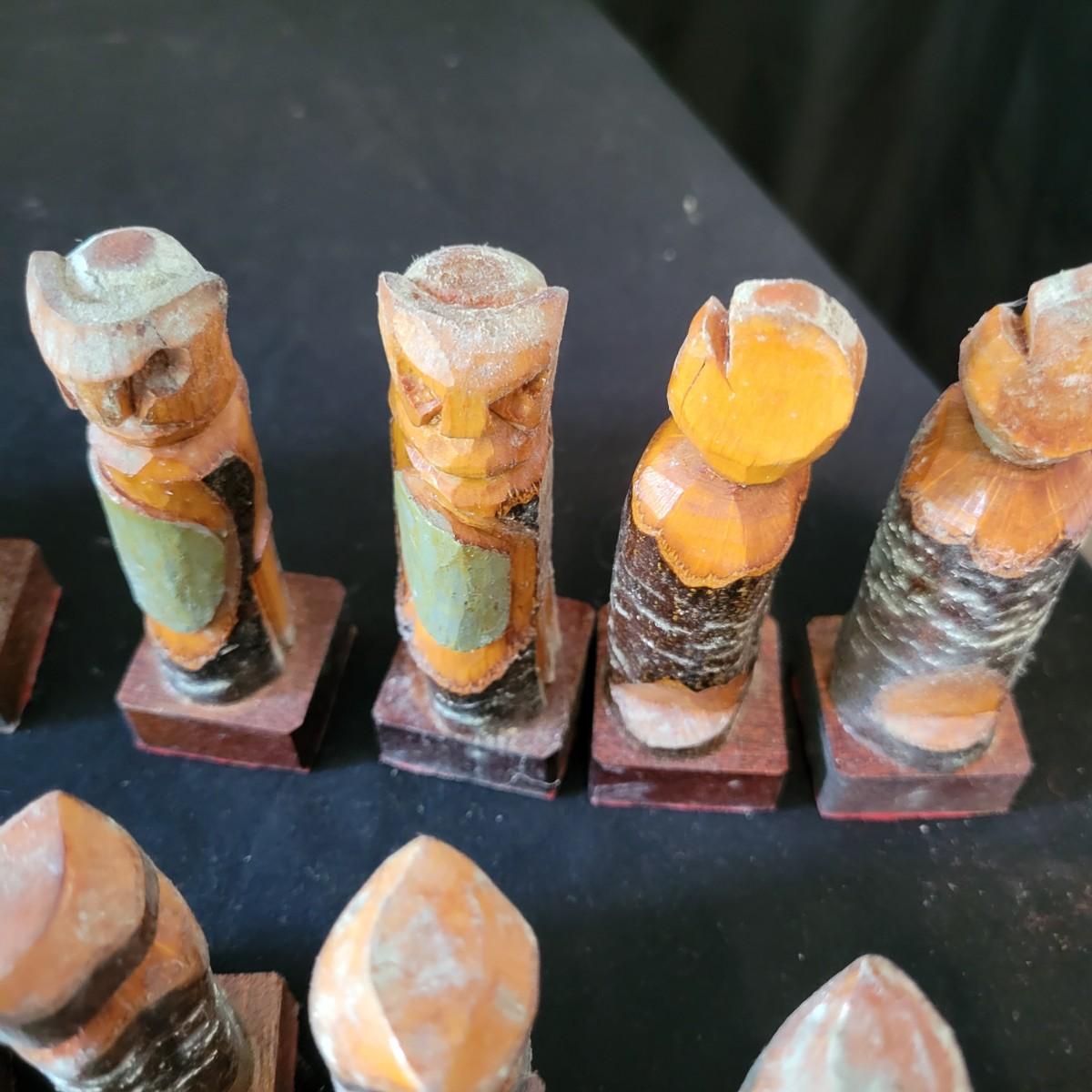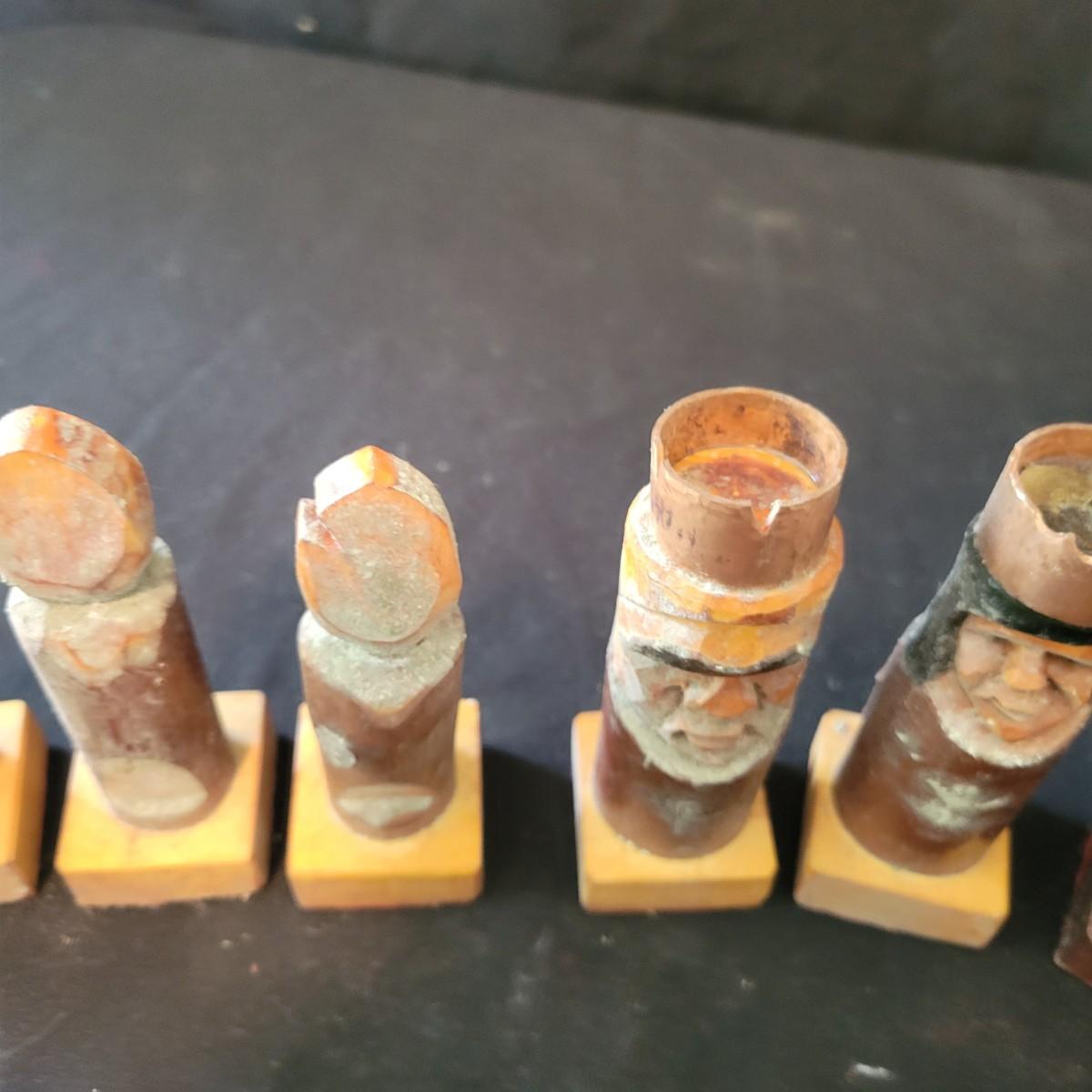 Complete hand carved chess pieces with felt bottoms. Pieces have been stored in a basement and are a bit moldy, bit should clean up nicely since they are lacquered. Multiple pieces have copper embellishments. Kings are approximately 4.25" tall. Shipping available