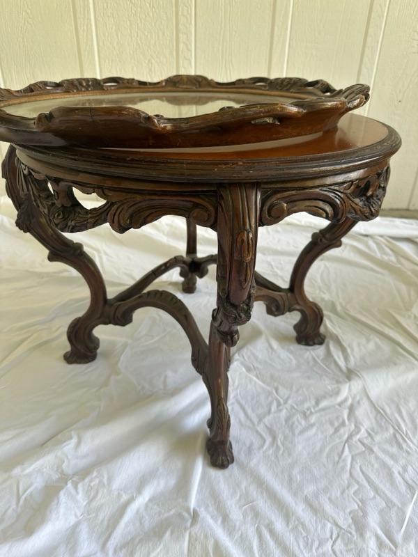 Beautiful Victorian style hand carved coffee table. With wood inlay. And removable glass and wood top 26 inches in diameter and 20 inches tall.