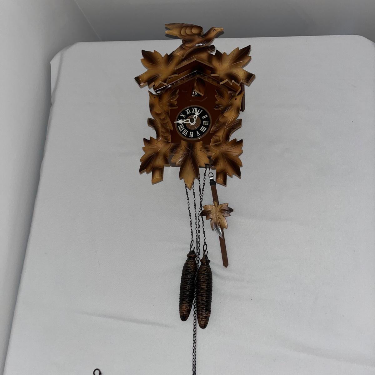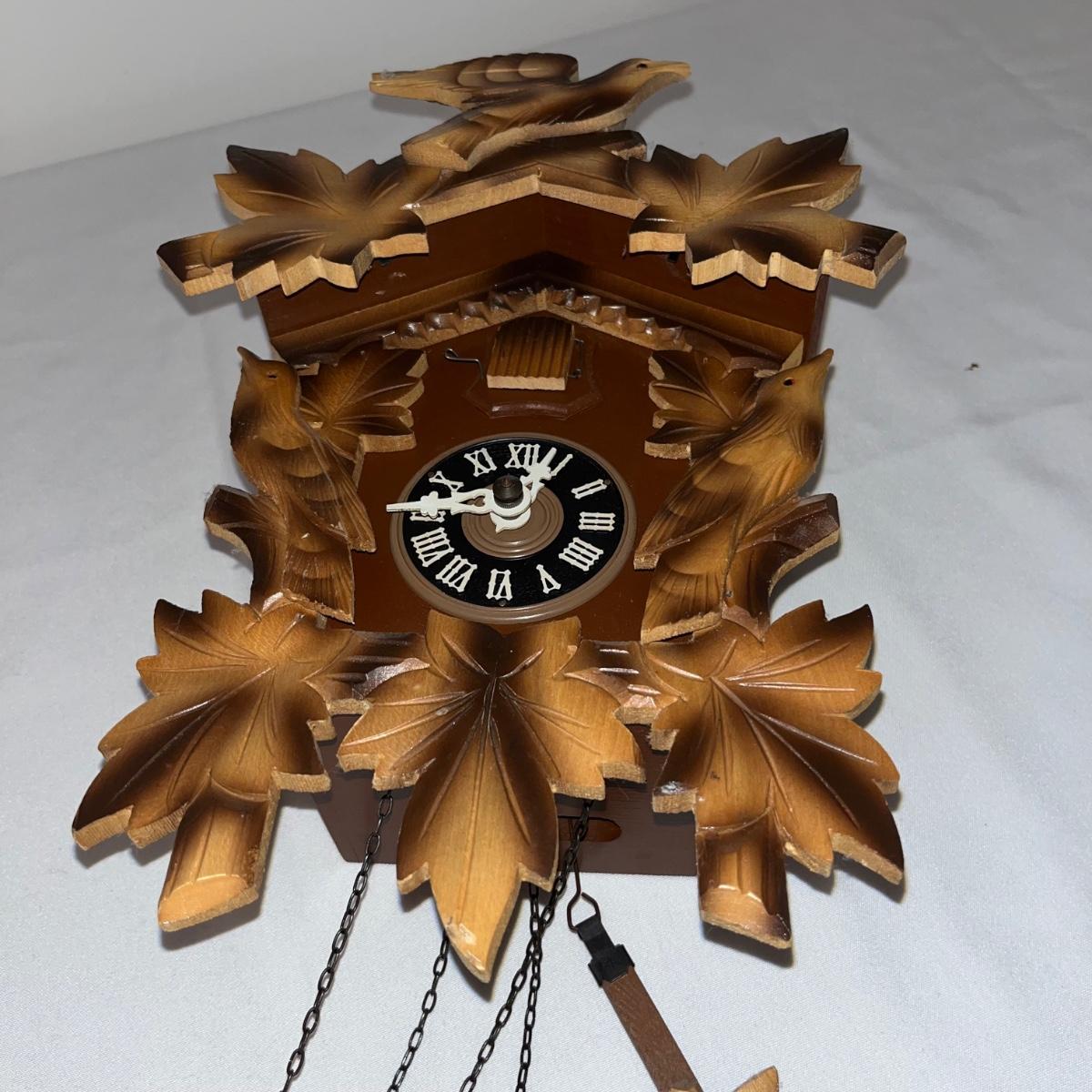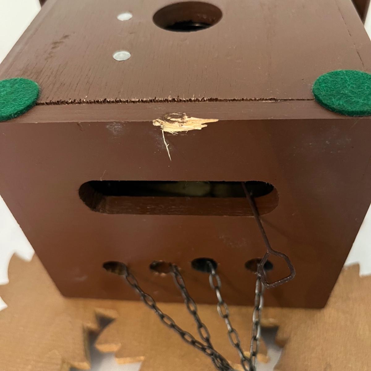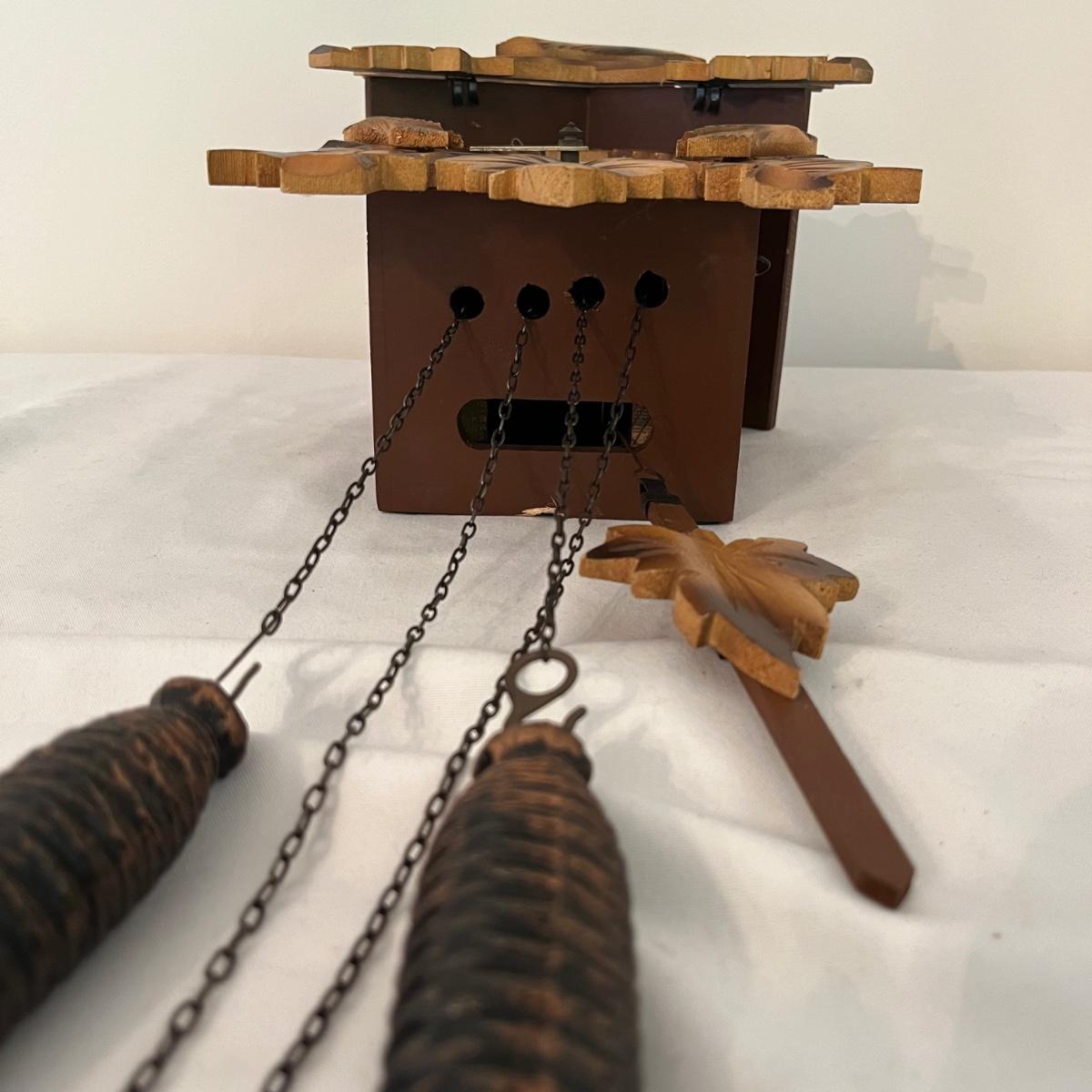 This lot includes one hand carved cuckoo clock with weights. There is one chip on the back of the clock (see photos). Some of the decor on the clock is attachable (see photos). The clock measures about 8.5” x 11.5” x 4.5”H (not including the weights or dangling pieces). Shipping available. Shipping can be costly. We suggest contacting our preferred local shipping provider, Postage Express, with dimensions and getting an estimate before bidding: (828) 670-5501.