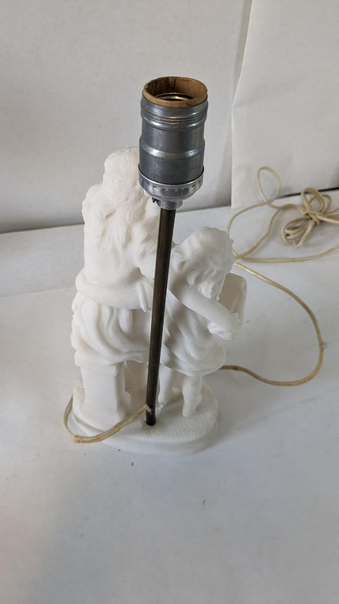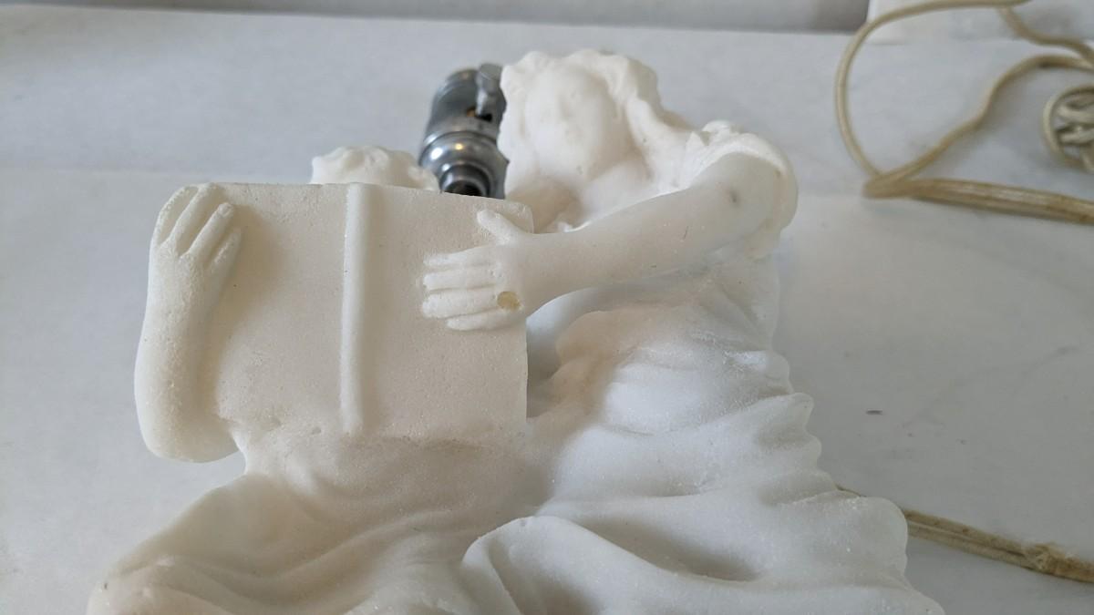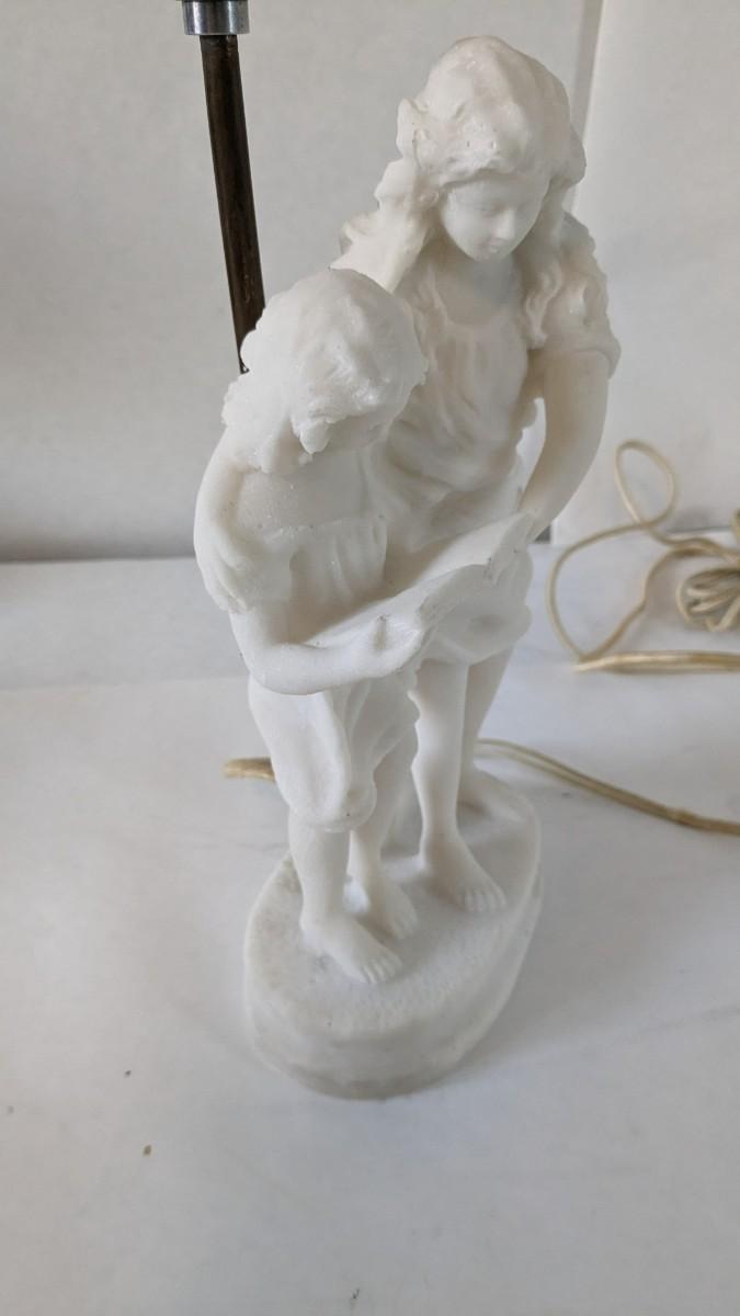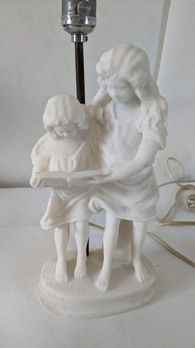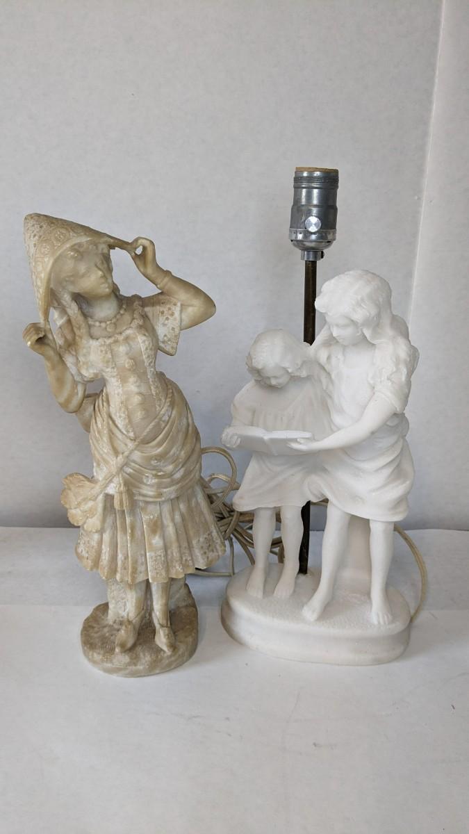 Includes unmarked 13" alabaster Dutch girl with very minor scuffs to finger, hair, and hat. A beautiful but very heavy piece with intricate detail and no markings found. Also includes 11.75" sculpture of woman and child reading a book turned into a lamp, unmarked with natural shedding occuring, wire is starting to fray with updating recommended. Extra handling fees will apply.