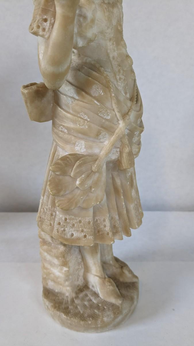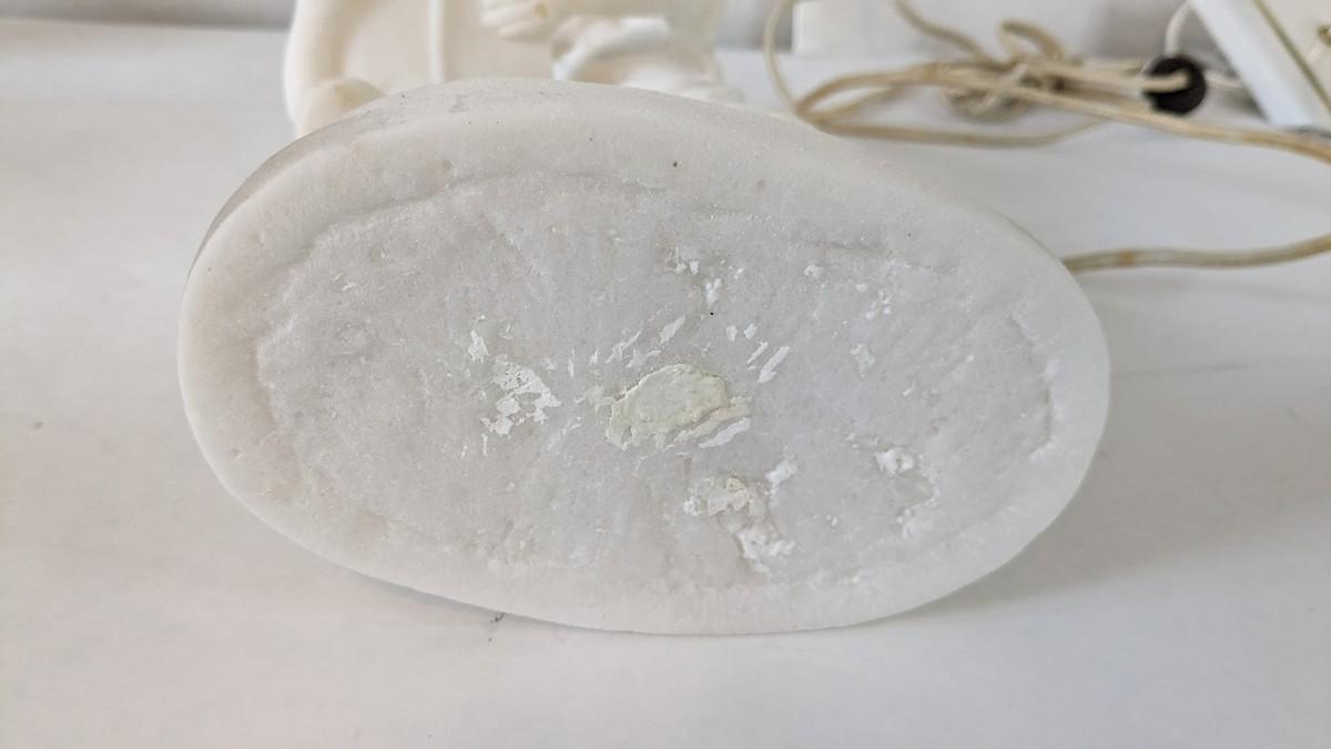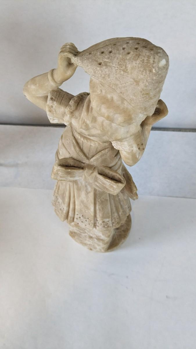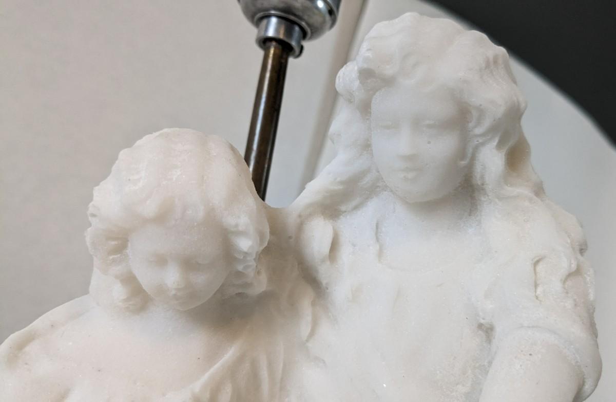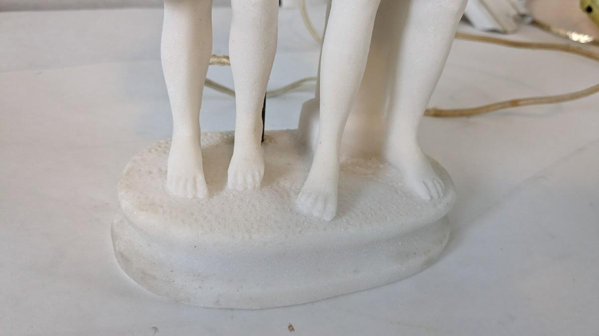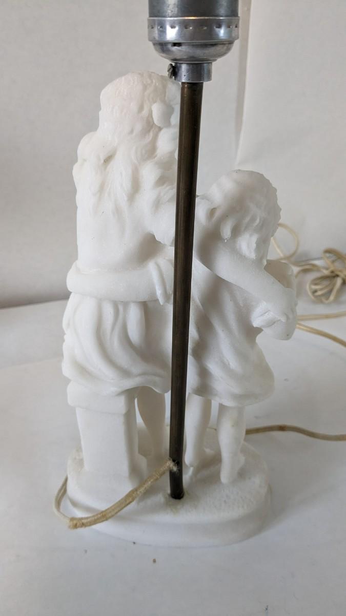 Includes unmarked 13" alabaster Dutch girl with very minor scuffs to finger, hair, and hat. A beautiful but very heavy piece with intricate detail and no markings found. Also includes 11.75" sculpture of woman and child reading a book turned into a lamp, unmarked with natural shedding occuring, wire is starting to fray with updating recommended. Extra handling fees will apply.
