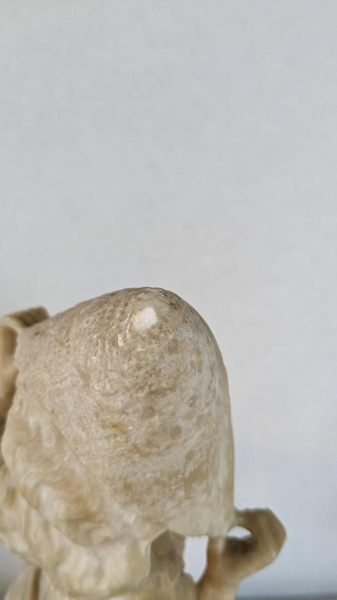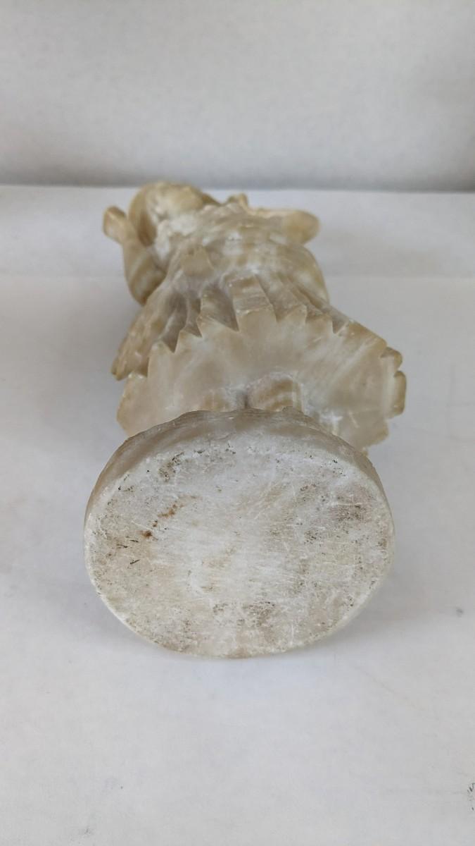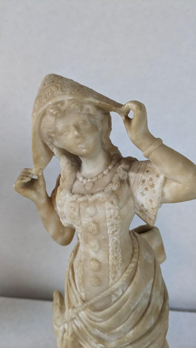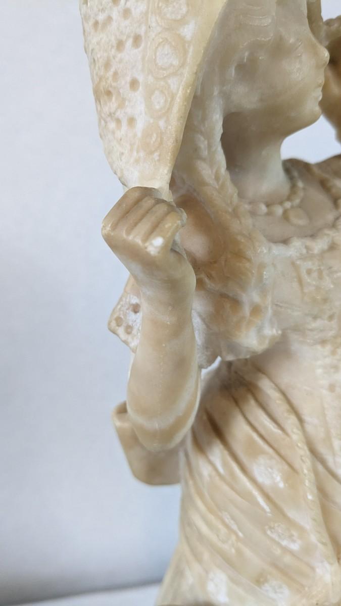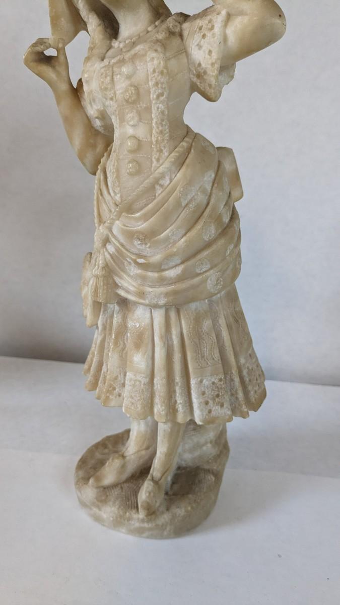 Includes unmarked 13" alabaster Dutch girl with very minor scuffs to finger, hair, and hat. A beautiful but very heavy piece with intricate detail and no markings found. Also includes 11.75" sculpture of woman and child reading a book turned into a lamp, unmarked with natural shedding occuring, wire is starting to fray with updating recommended. Extra handling fees will apply.