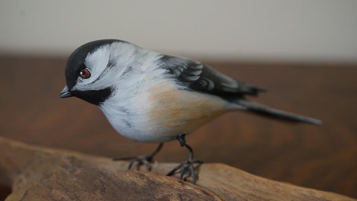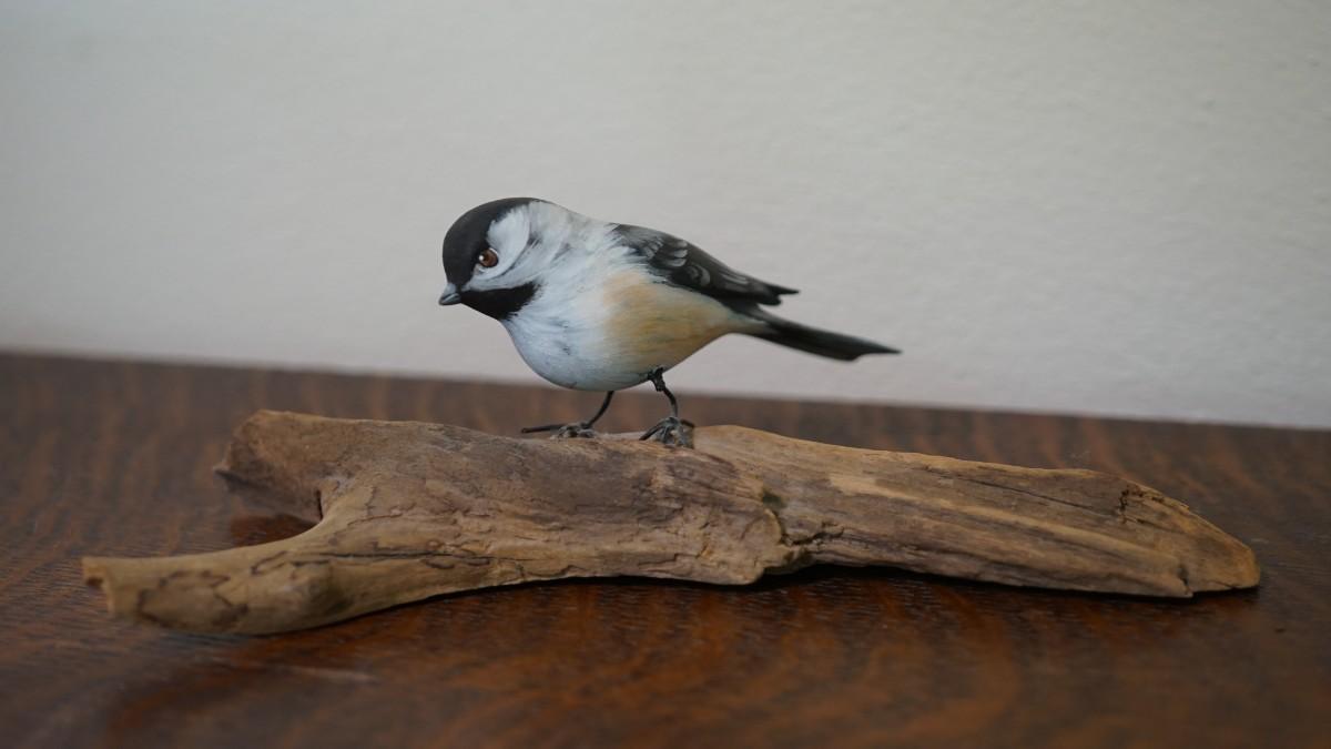 HAND CARVED & HAND PAINTED CHICKADEE BIRD SIGNED ON BASE A.WARRENS AND S. CAGLE