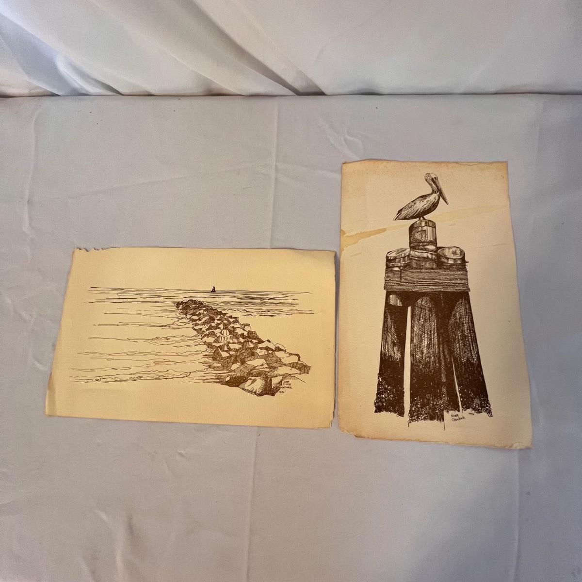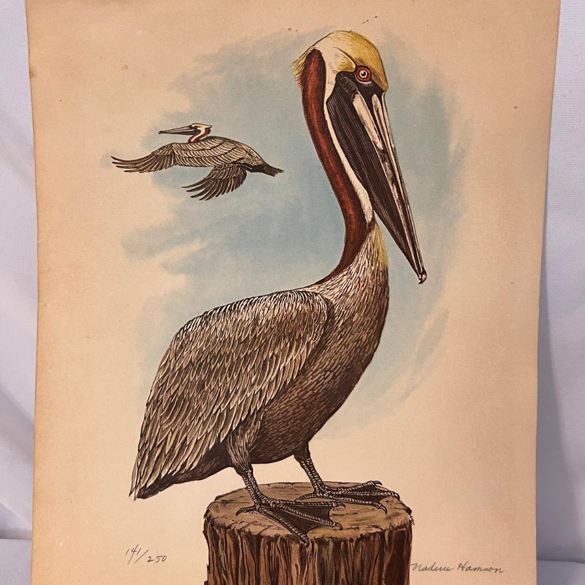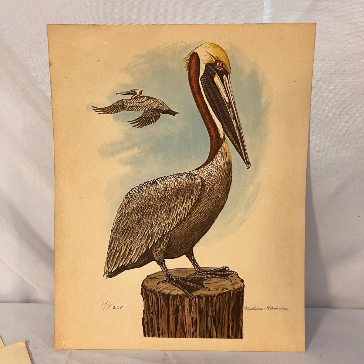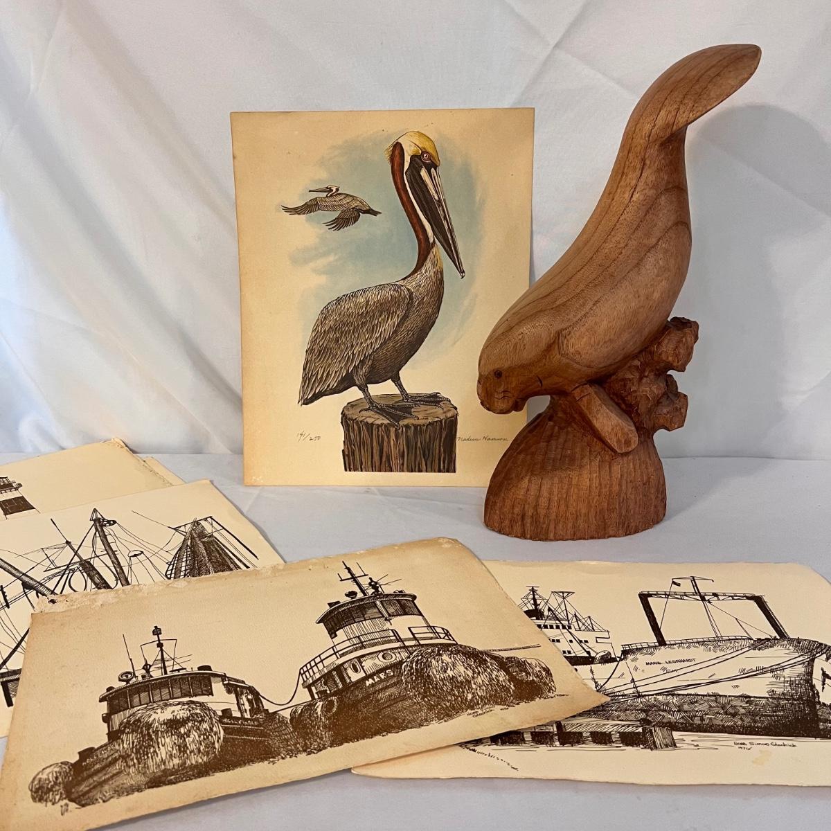 This mostly ocean themed lot includes a manatee statue that appears to be hand carved from a single piece of wood. Statue measures approximately 6” x 4” x 16”H. We have paired the statue with 10 prints. The print with color of a pelican on a tree stump is pencil signed and numbered 141/250; signature possibly reads Nadene Hammon. The rest of the prints are by Nora Simon Glochick, note that some have stains, see images.