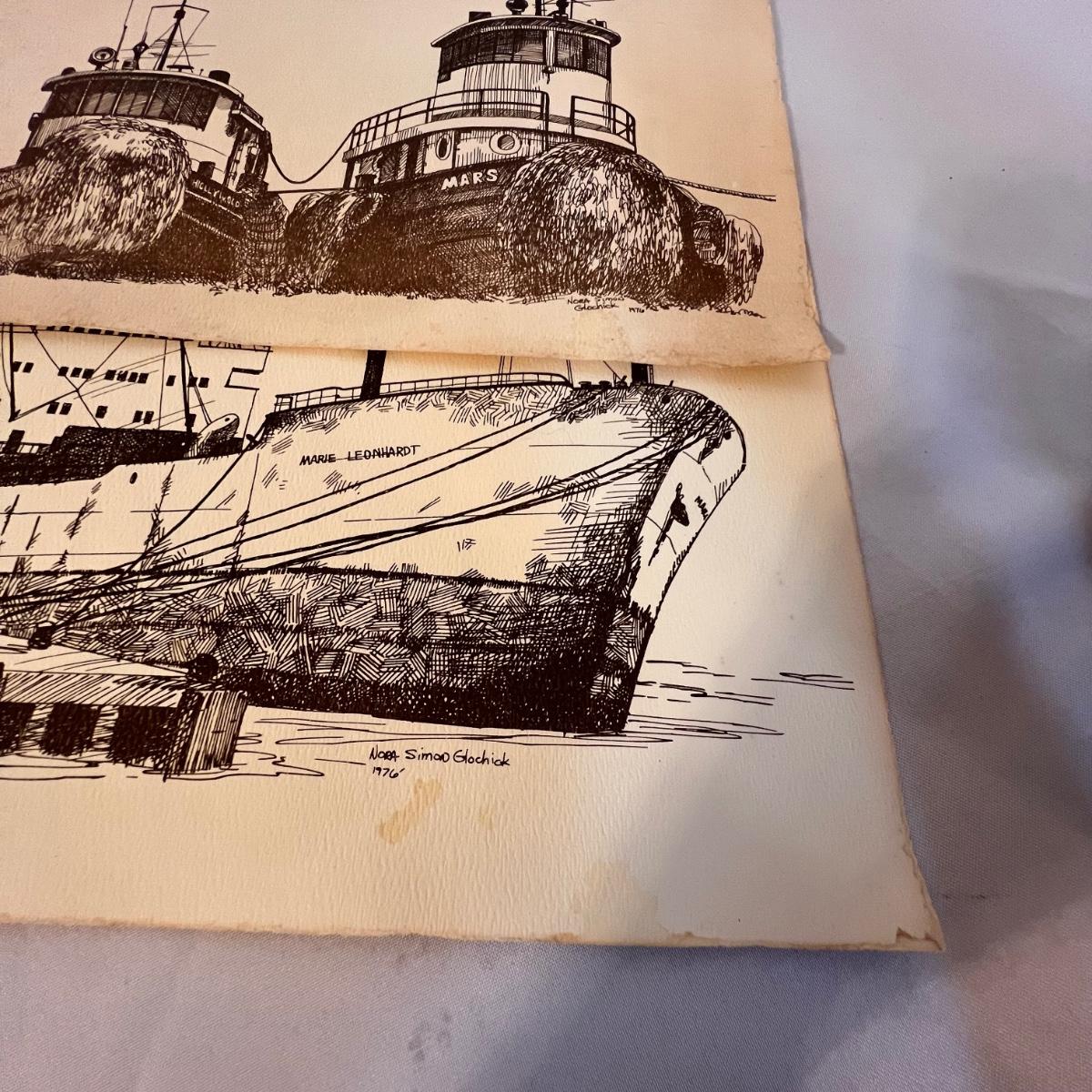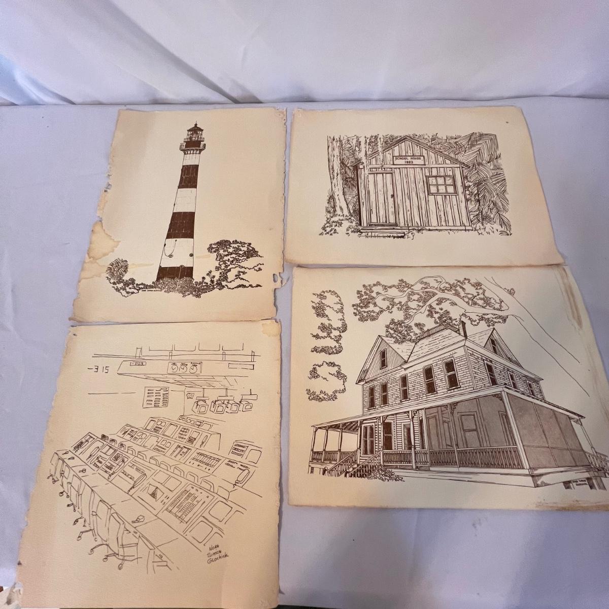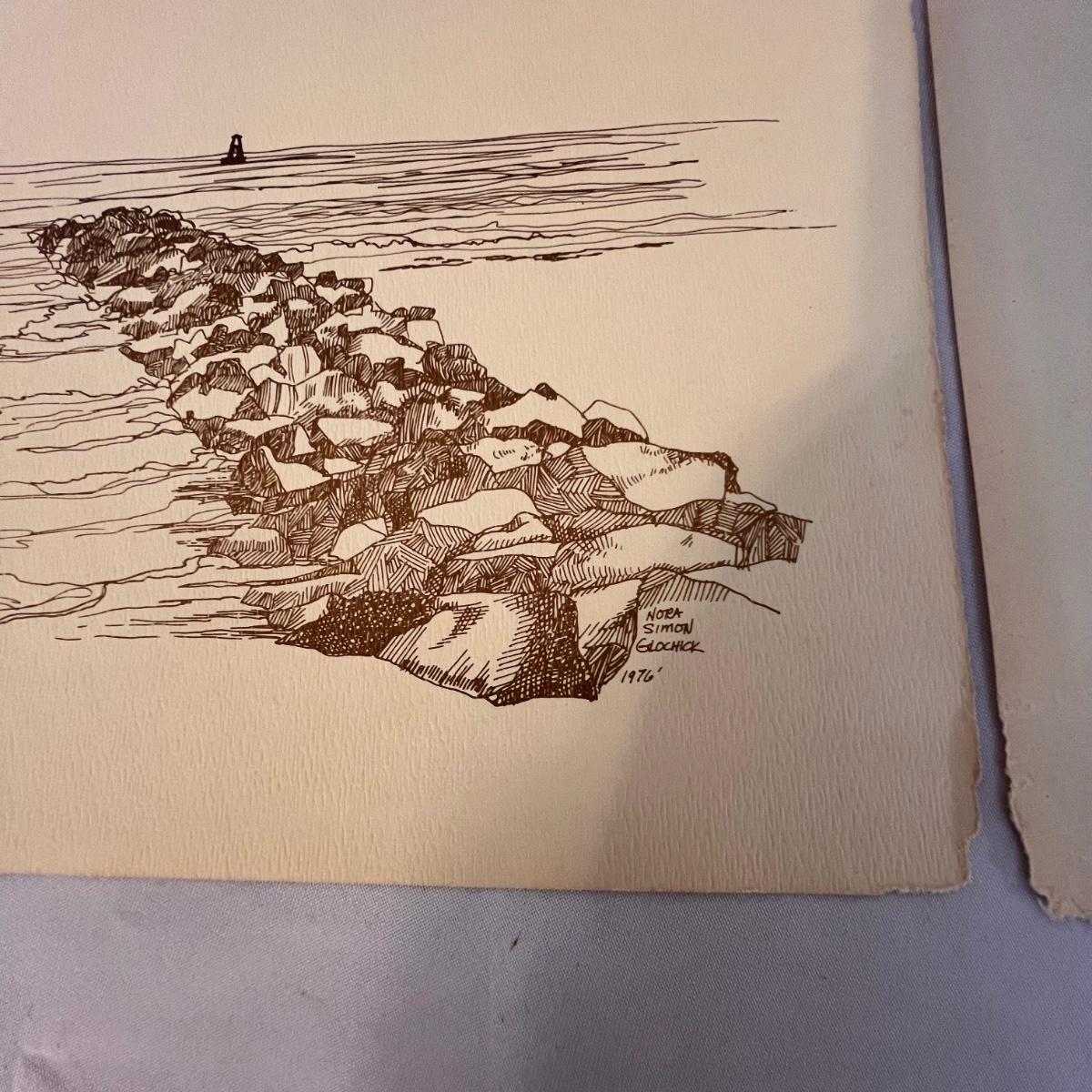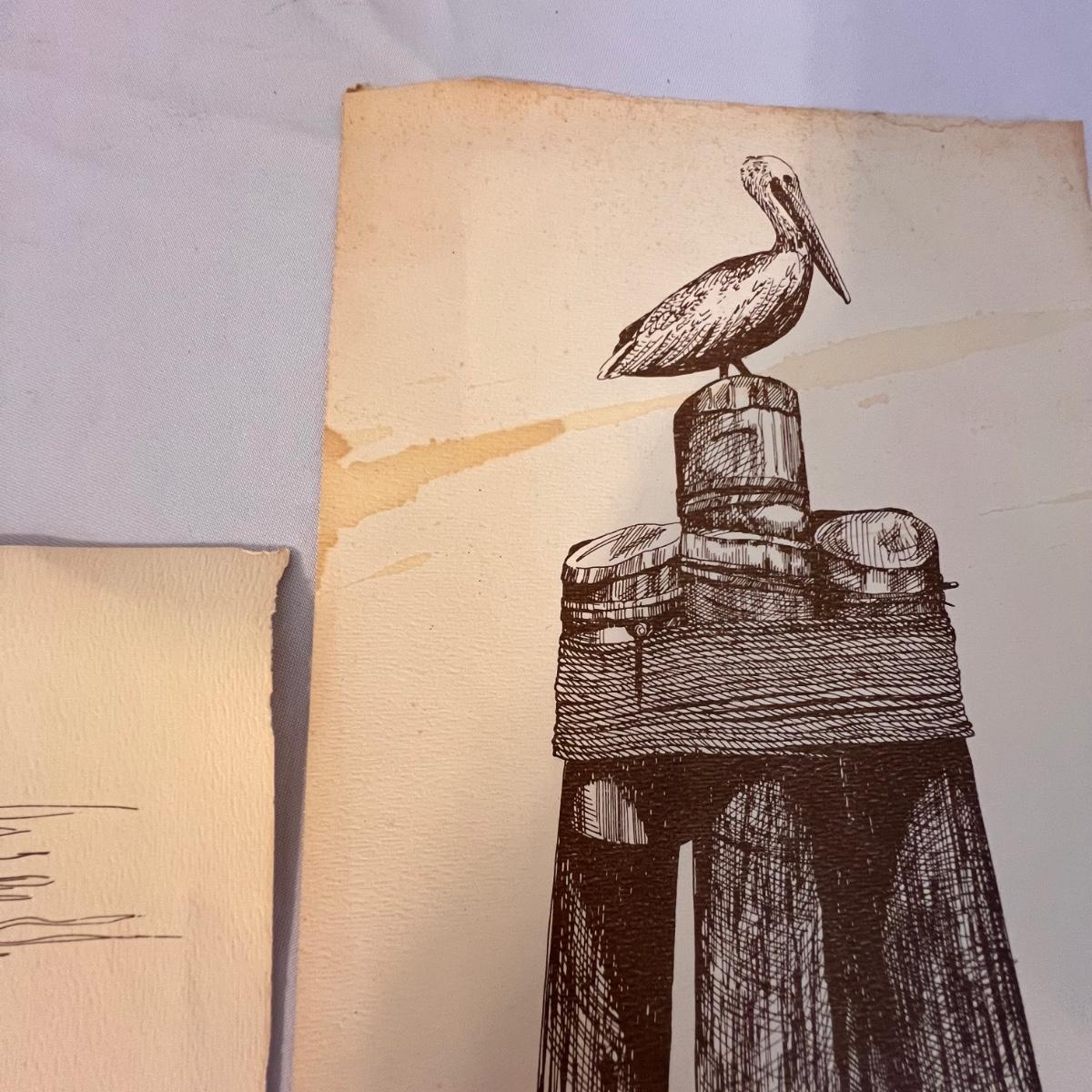 This mostly ocean themed lot includes a manatee statue that appears to be hand carved from a single piece of wood. Statue measures approximately 6” x 4” x 16”H. We have paired the statue with 10 prints. The print with color of a pelican on a tree stump is pencil signed and numbered 141/250; signature possibly reads Nadene Hammon. The rest of the prints are by Nora Simon Glochick, note that some have stains, see images.