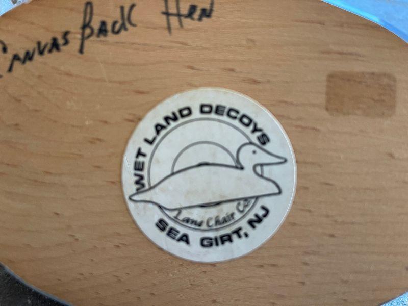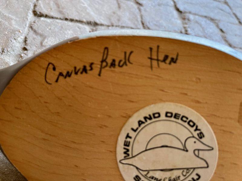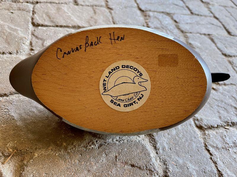 The subject item is an original hand-carved and painted Canvas Back hen decoy created by Wet Land Decoys of Sea Girt, NJ. The half-size decoy has been rendered in a folk art manner in flat, natural colors and simple details, creating a charming bit of shelf art. The carving retains the original company label and hand notation in ink on the bottom.