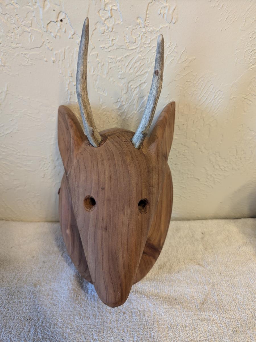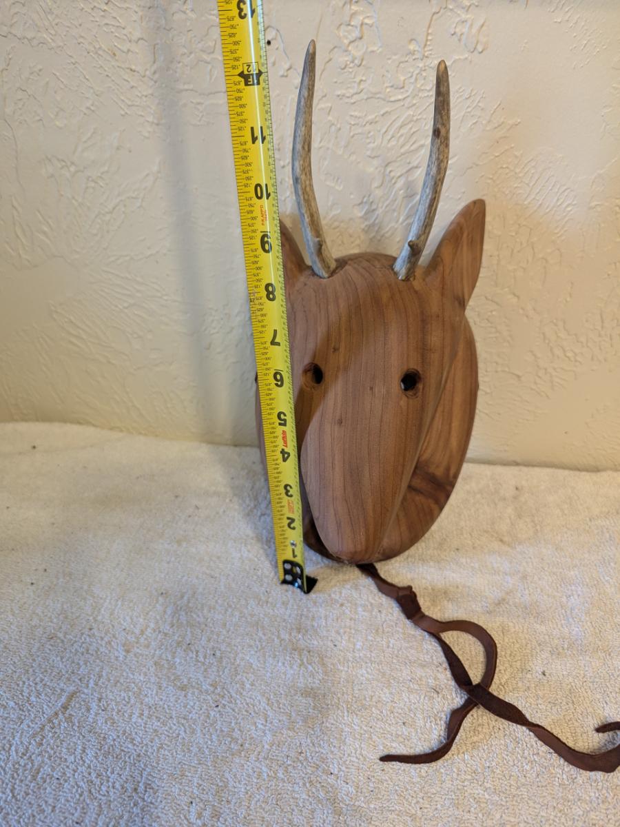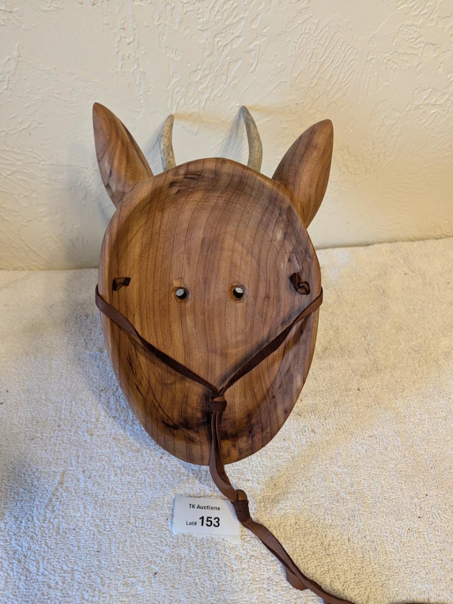 Hand carved redwood art mask with Antlers