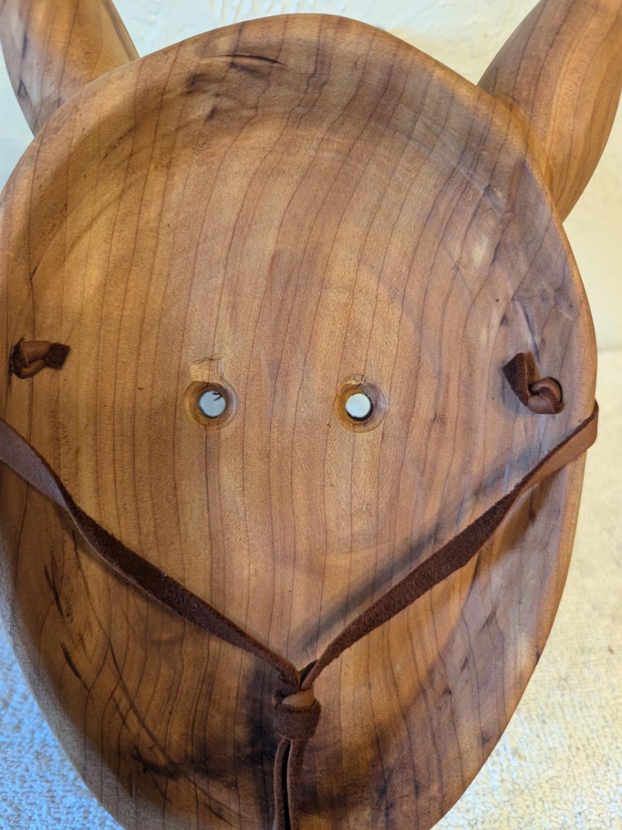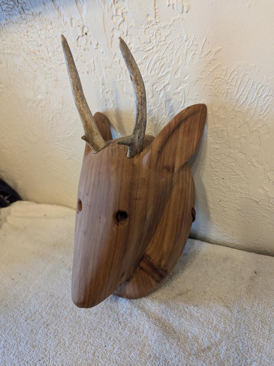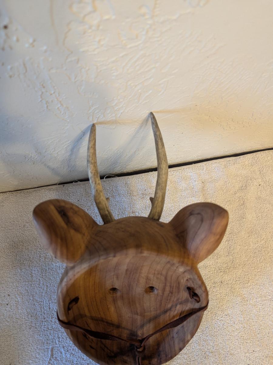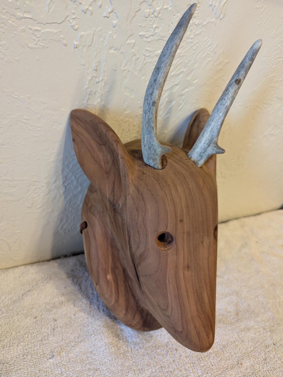 Hand carved redwood art mask with Antlers