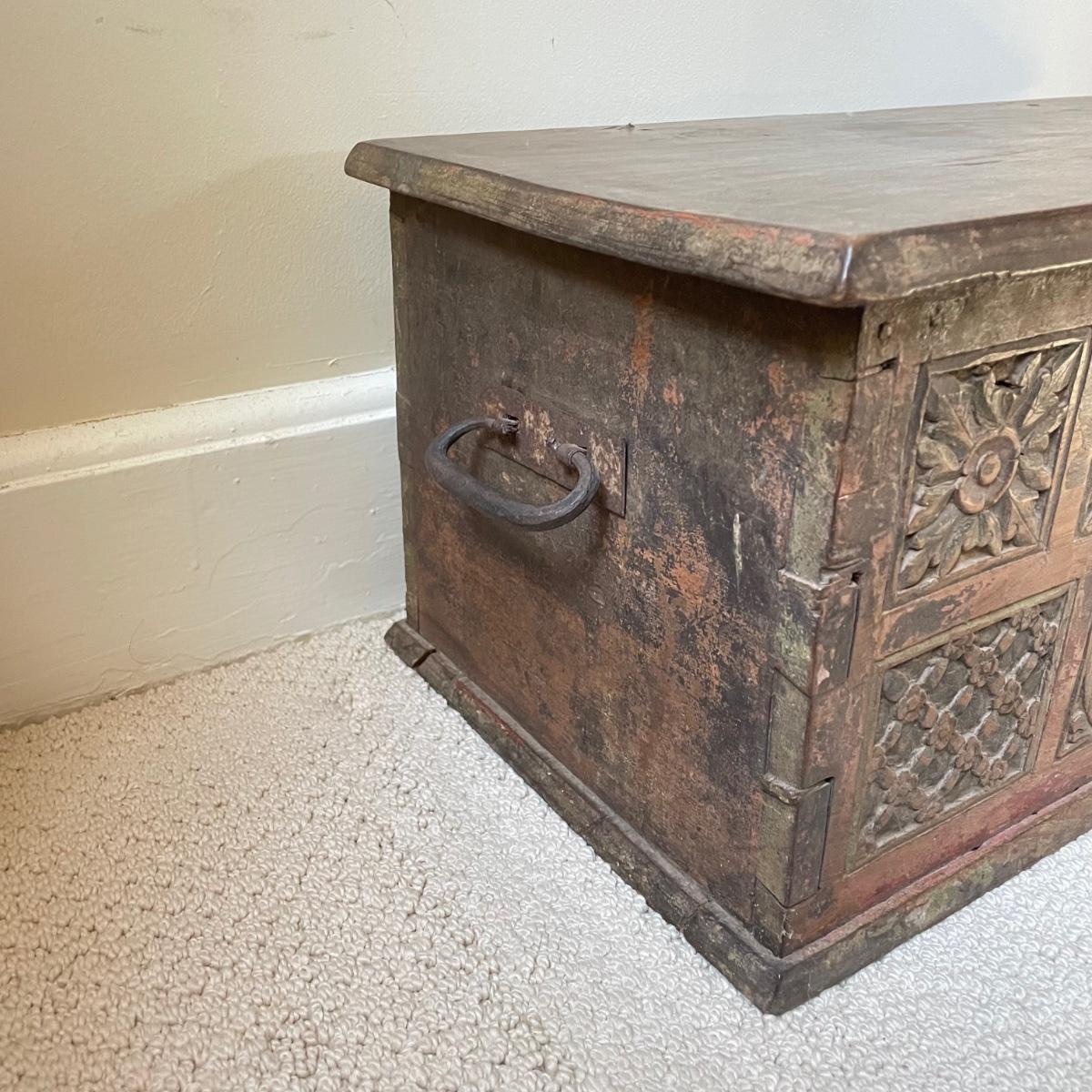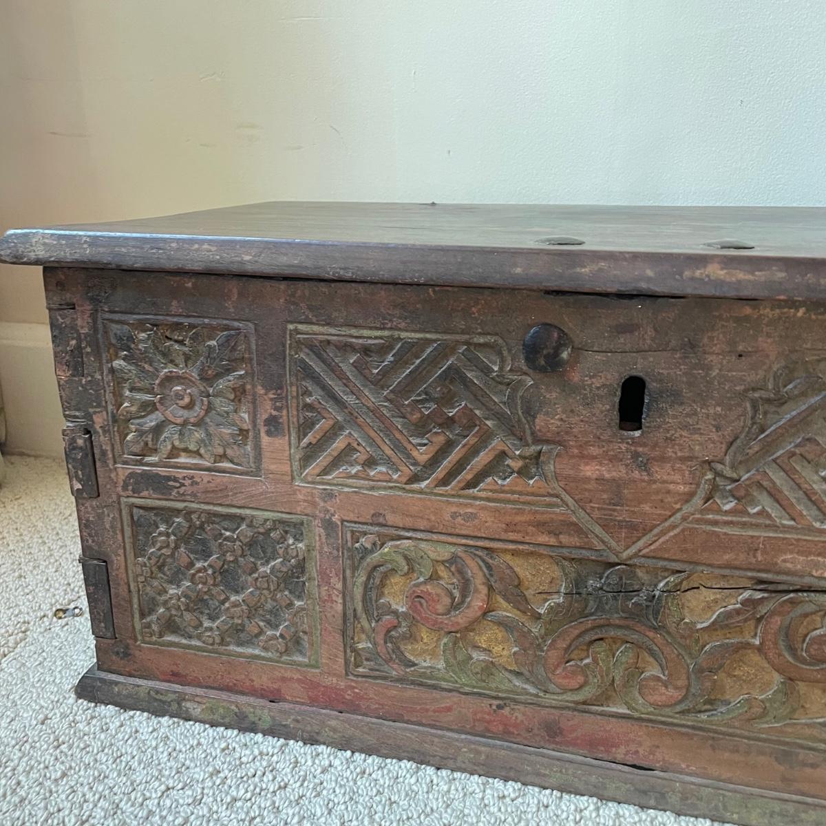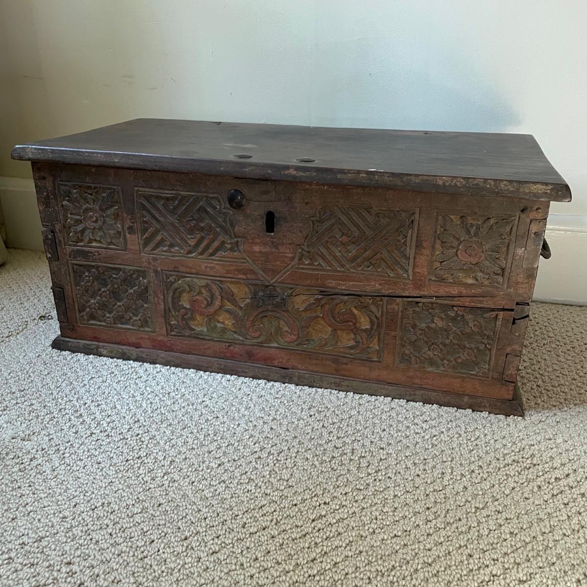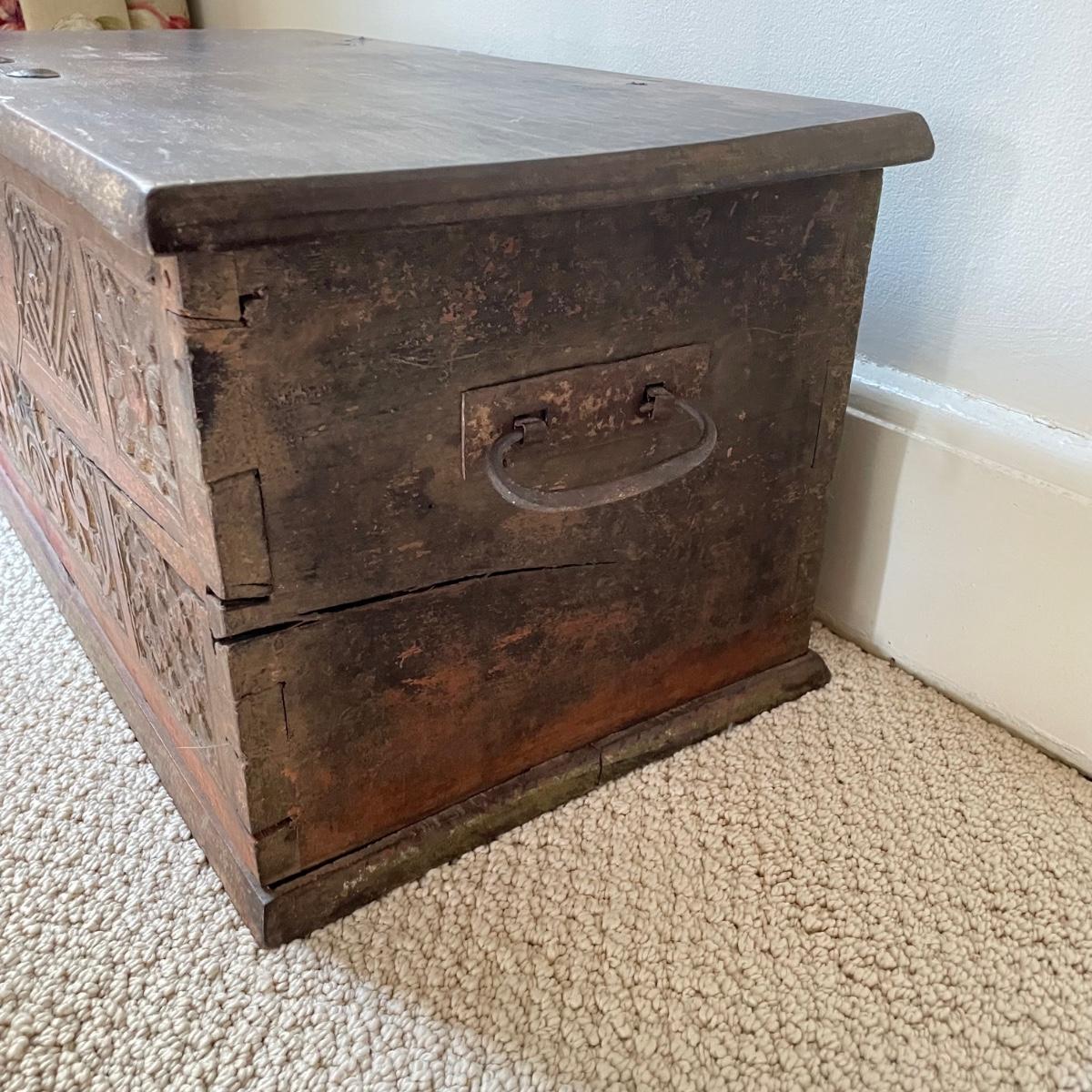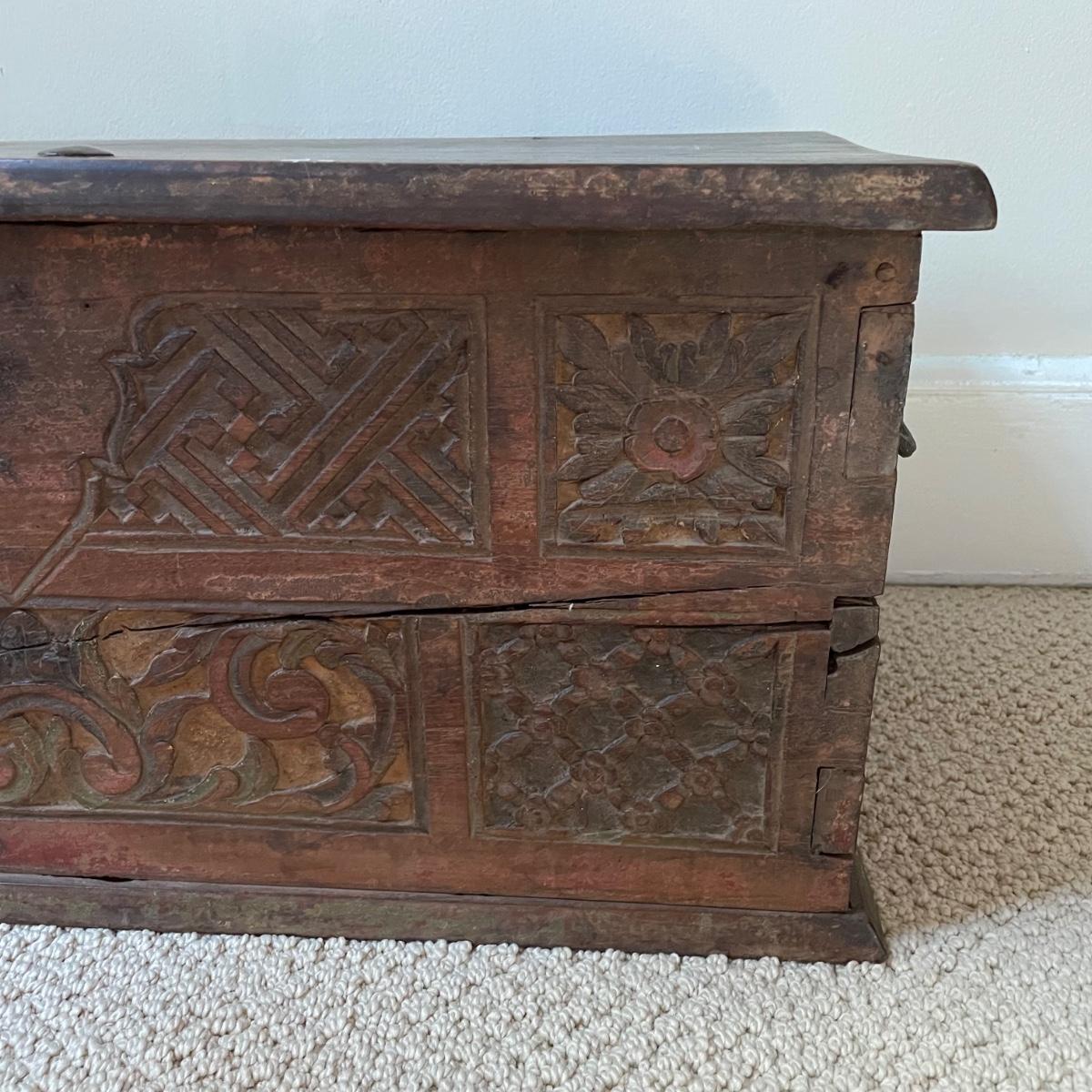 Small tabletop wooden chest appears to be fairly old with its hand carved face, rustic hardware and dovetailed construction. Chest measures 23” x 11.75” x 10.25”H. Piece has a keyhole, but no lock or key is included with lot. Shipping available. Shipping can be costly. We suggest contacting our preferred local shipping provider, Postage Express, with dimensions and getting an estimate before bidding: (828) 670-5501 or postageexpress@yahoo.com.