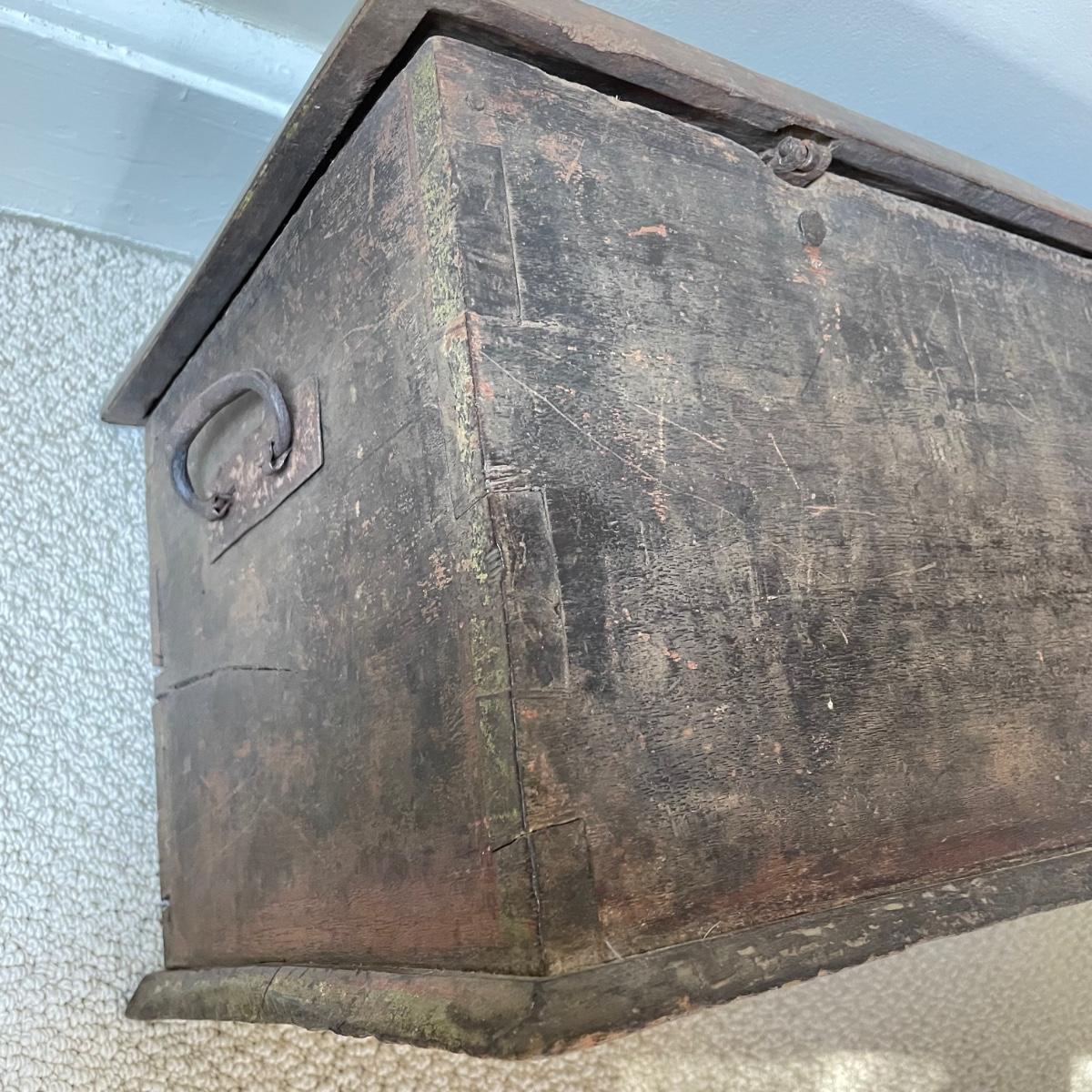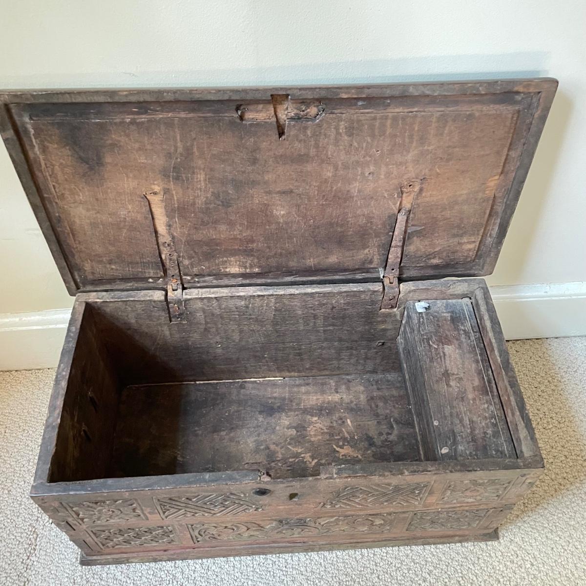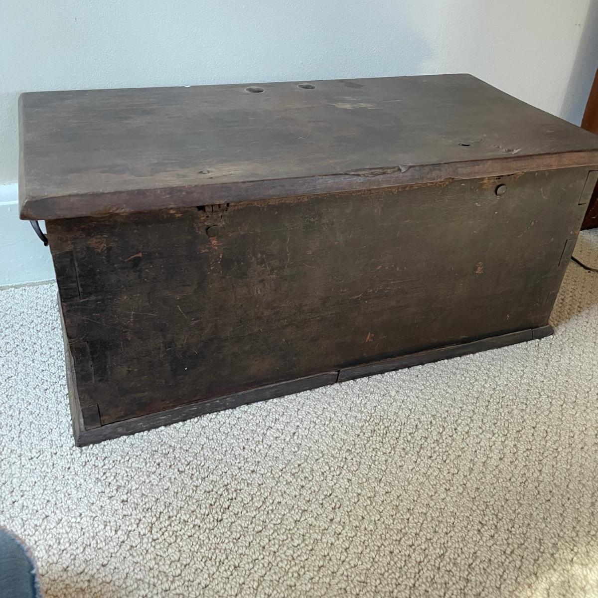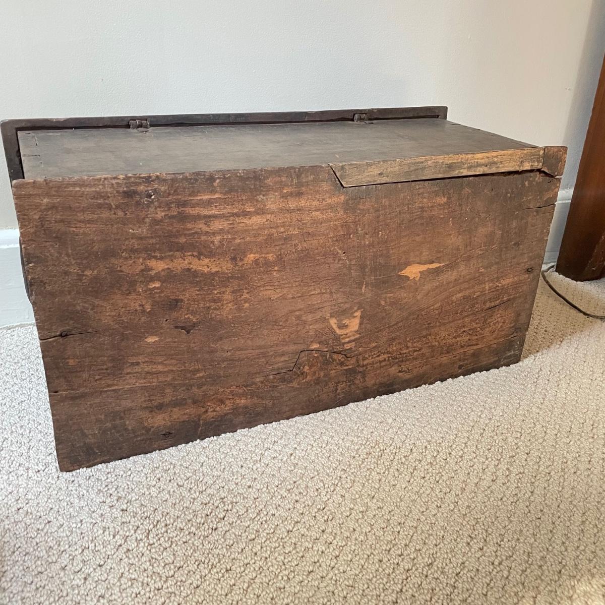 Small tabletop wooden chest appears to be fairly old with its hand carved face, rustic hardware and dovetailed construction. Chest measures 23” x 11.75” x 10.25”H. Piece has a keyhole, but no lock or key is included with lot. Shipping available. Shipping can be costly. We suggest contacting our preferred local shipping provider, Postage Express, with dimensions and getting an estimate before bidding: (828) 670-5501 or postageexpress@yahoo.com.