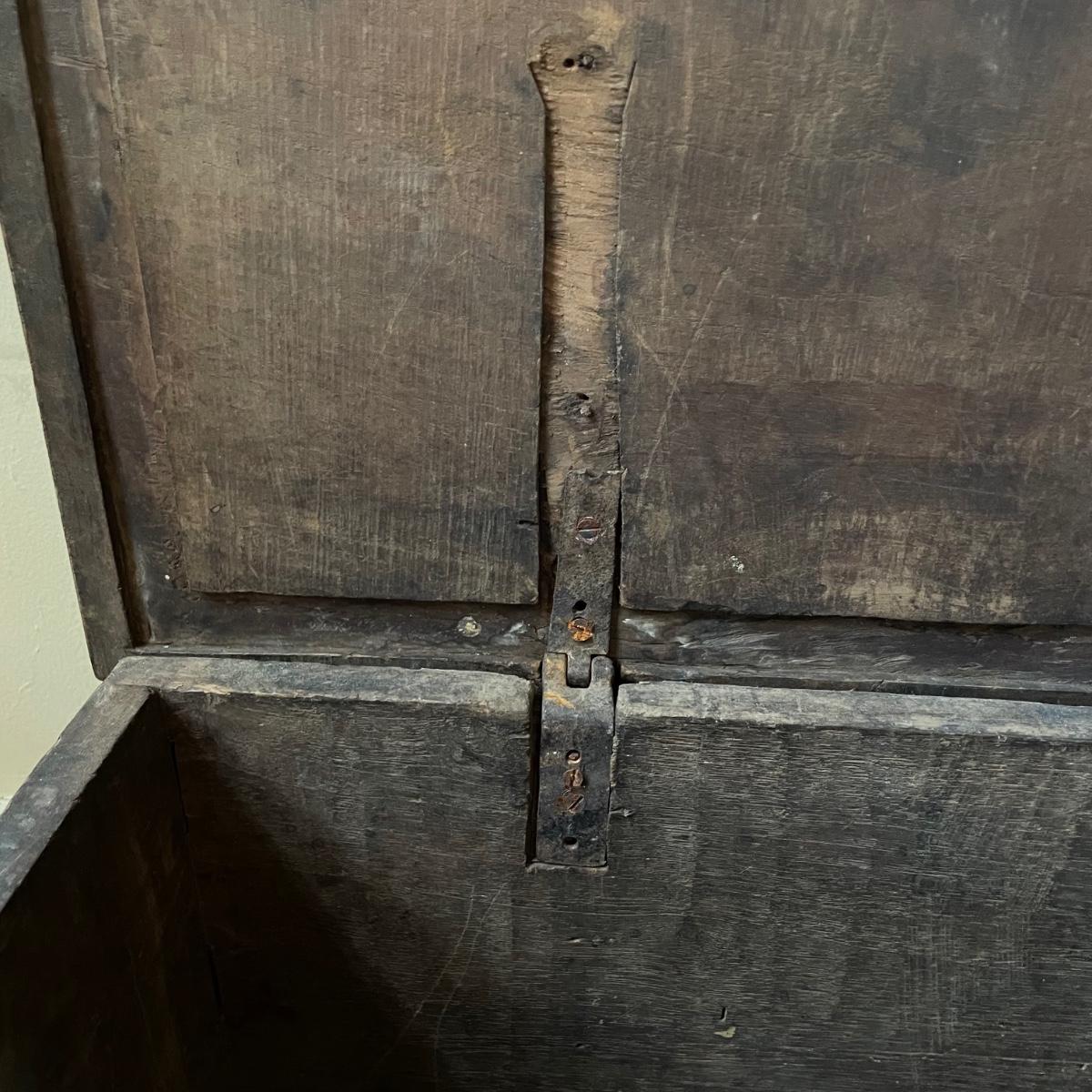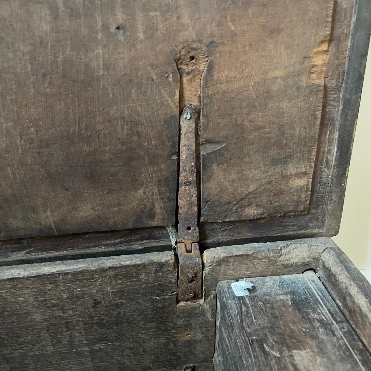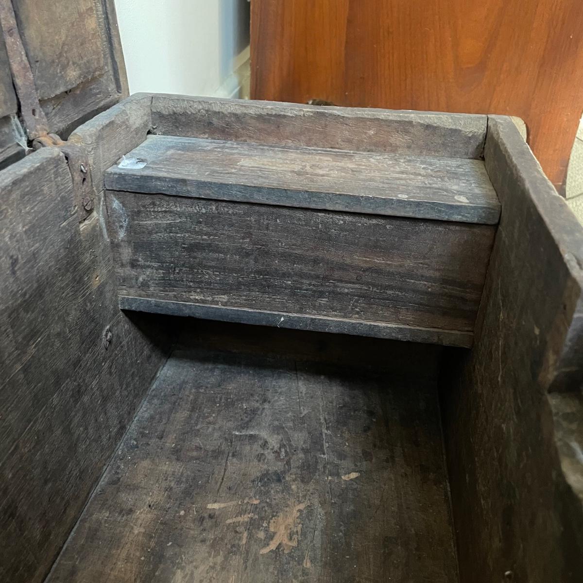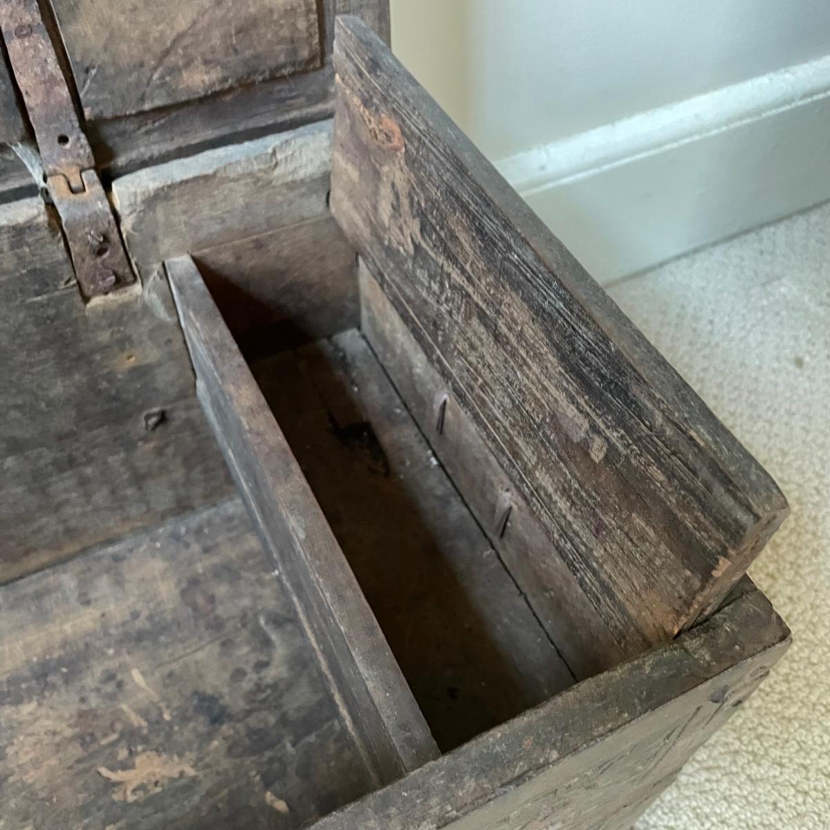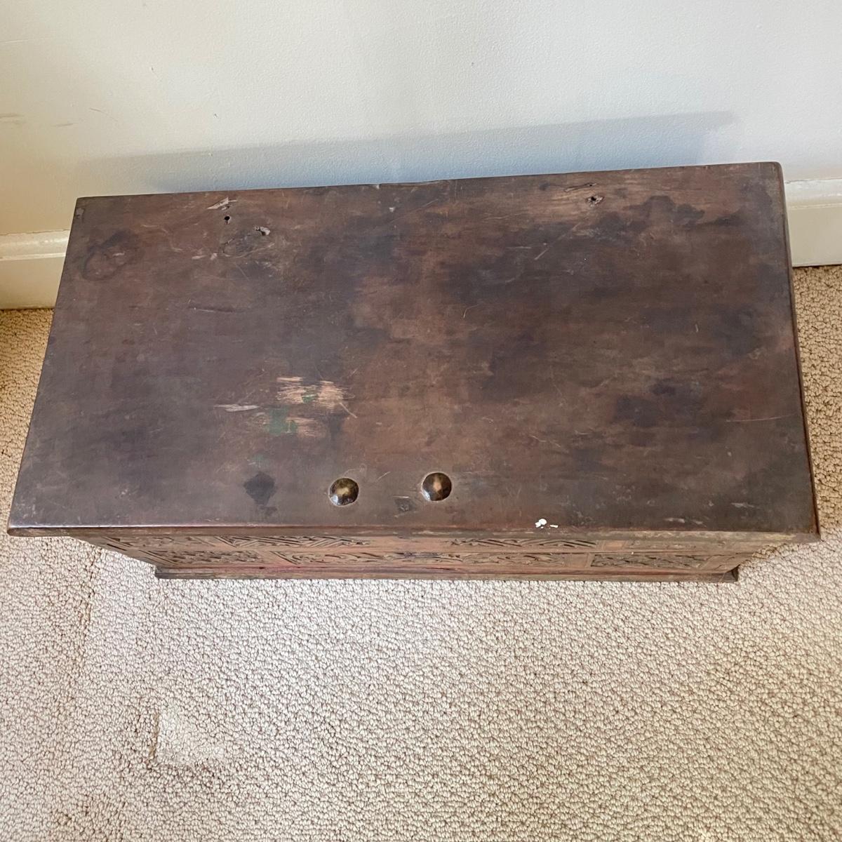 Small tabletop wooden chest appears to be fairly old with its hand carved face, rustic hardware and dovetailed construction. Chest measures 23” x 11.75” x 10.25”H. Piece has a keyhole, but no lock or key is included with lot. Shipping available. Shipping can be costly. We suggest contacting our preferred local shipping provider, Postage Express, with dimensions and getting an estimate before bidding: (828) 670-5501 or postageexpress@yahoo.com.