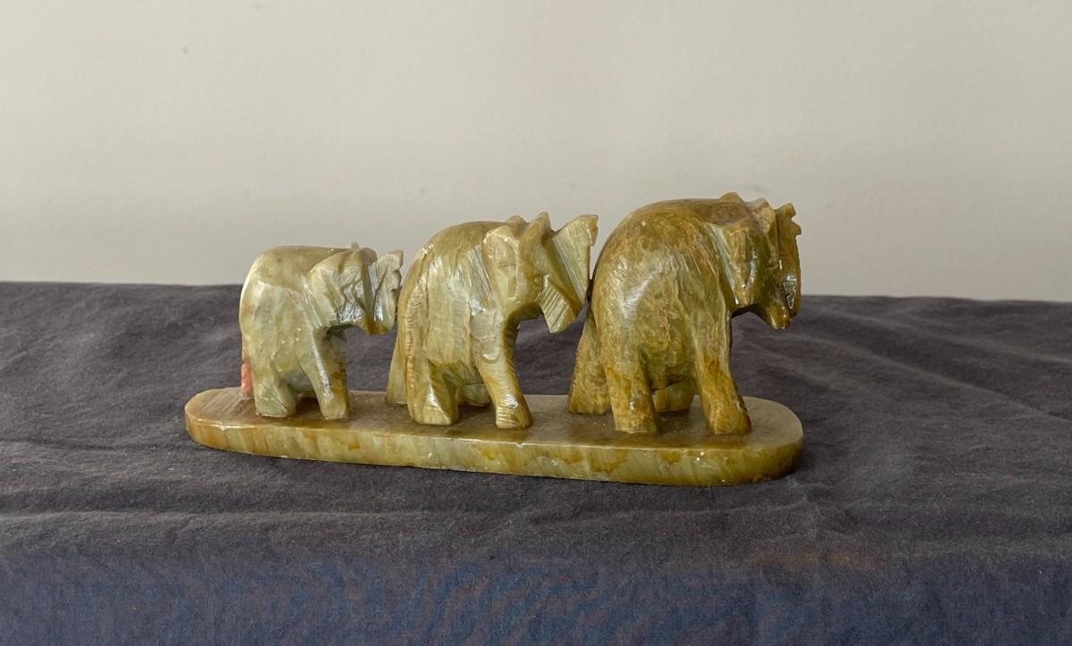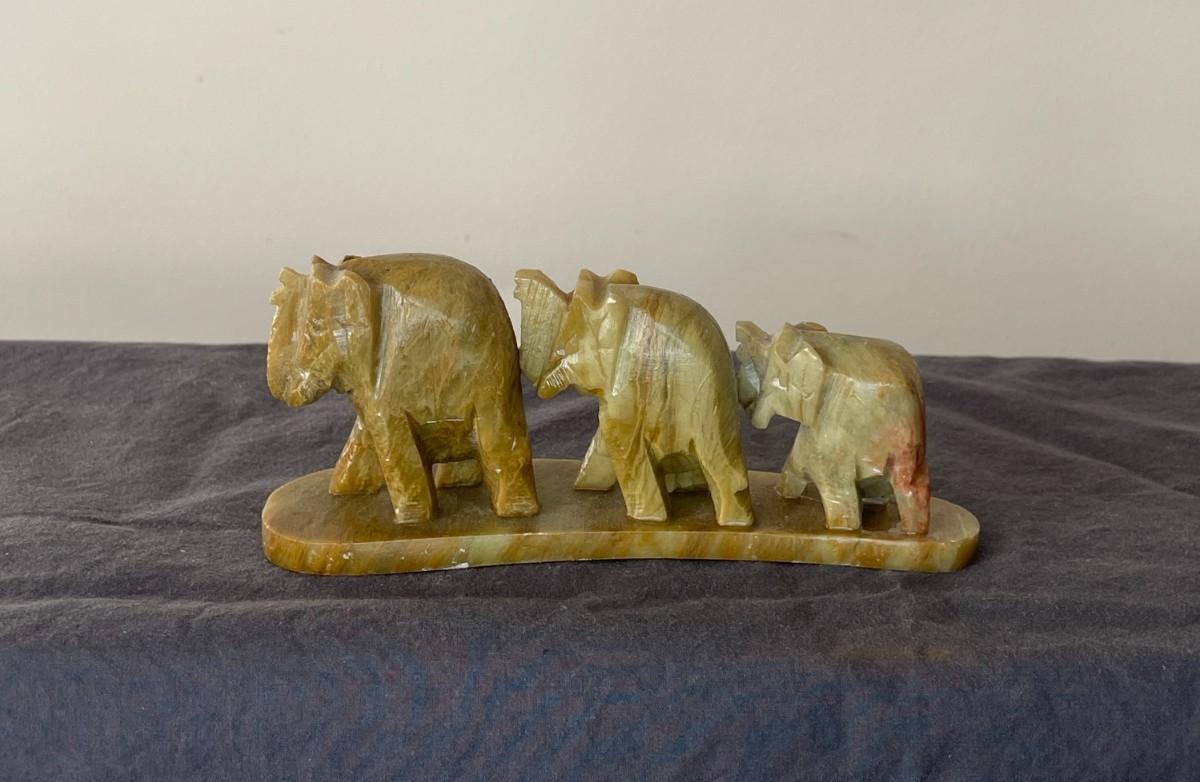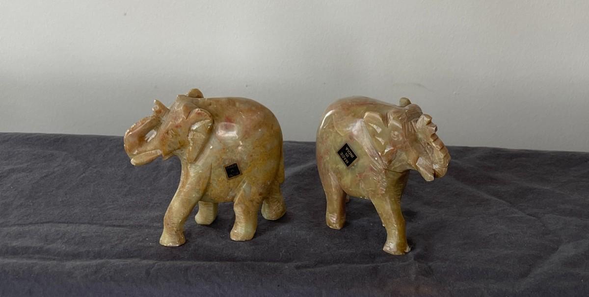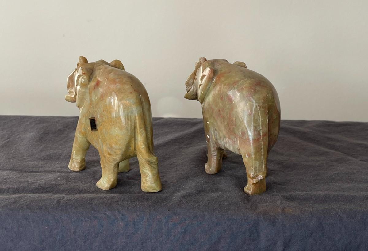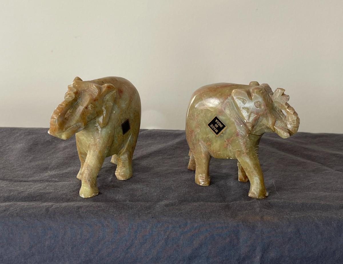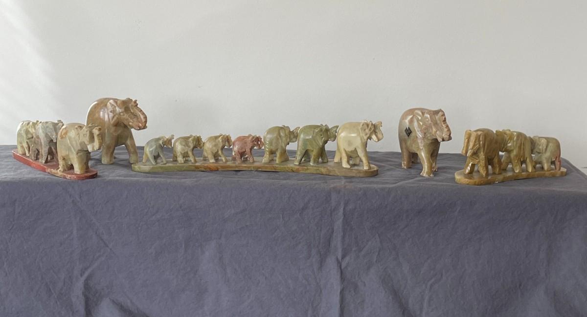 2 marble hand carved elephants and 3 sets of Elephants in a row hand carved from Soap Stone.