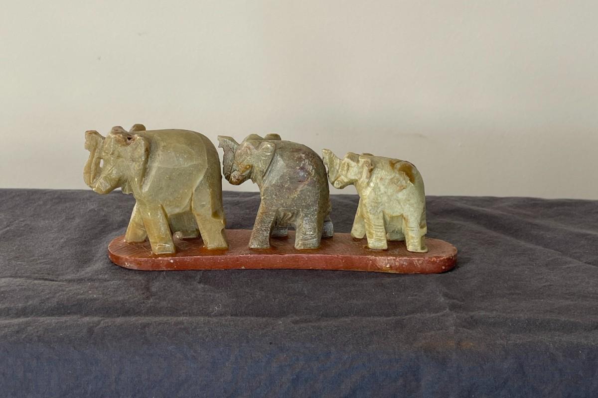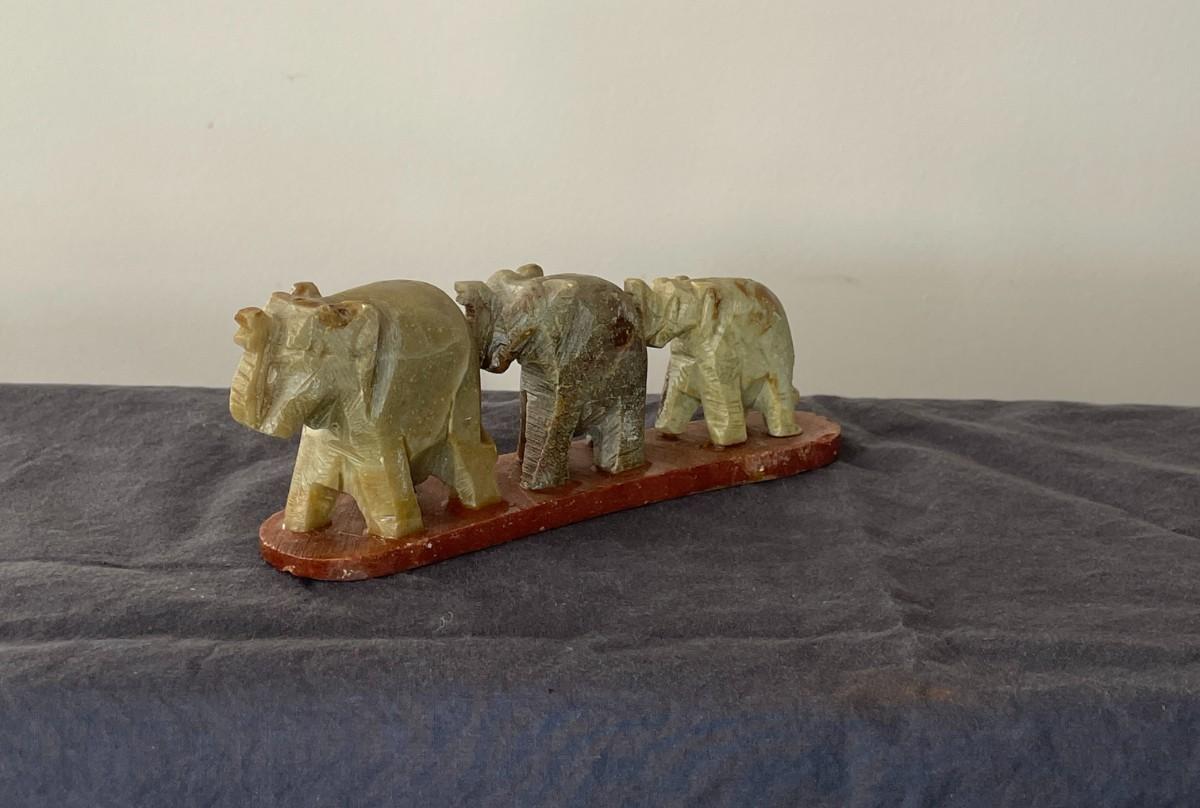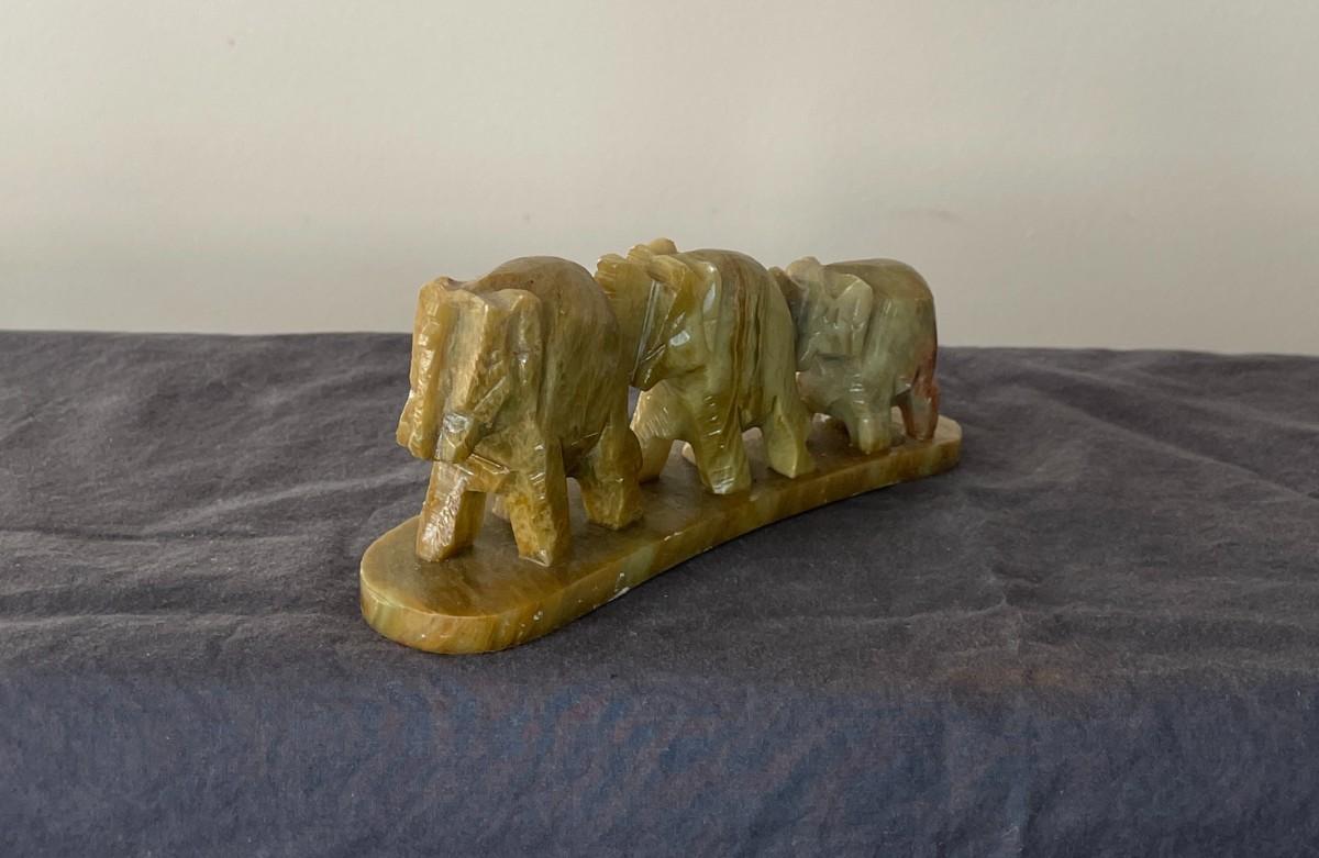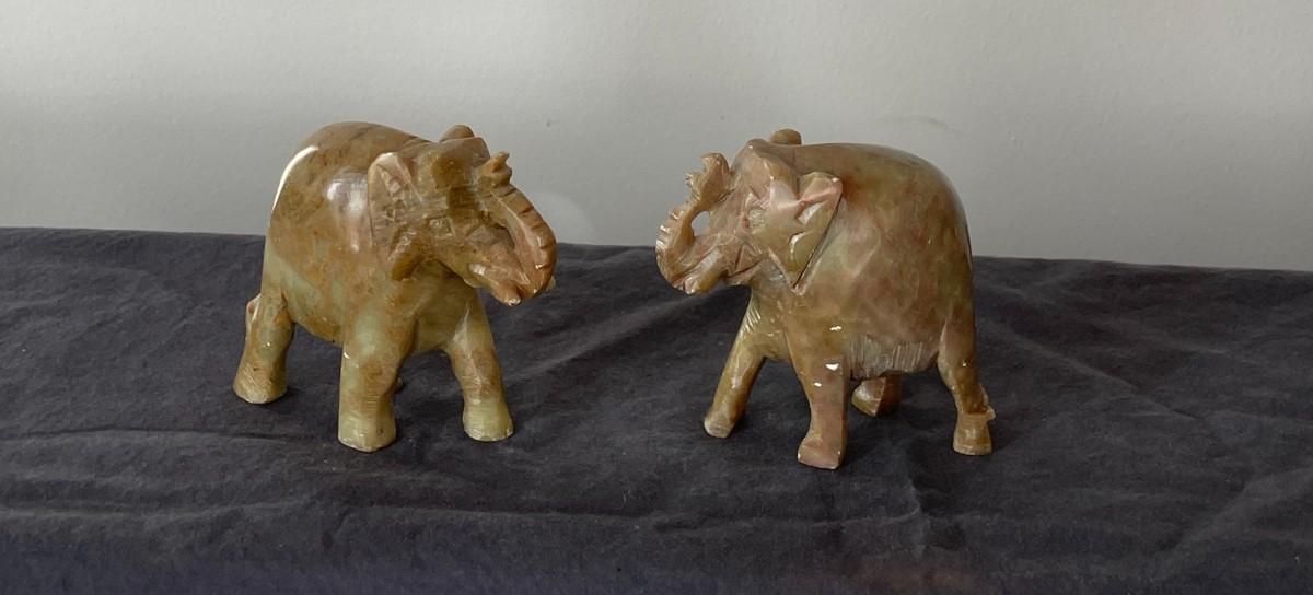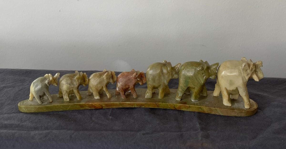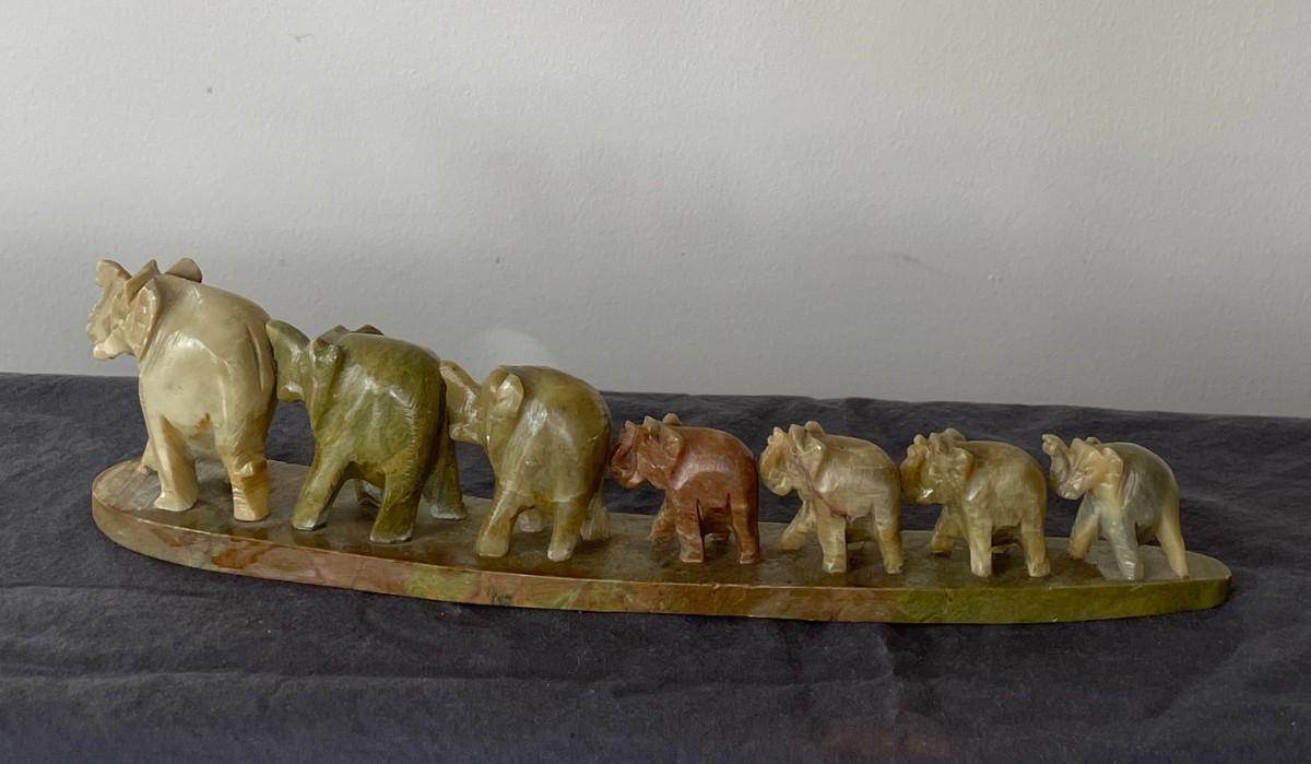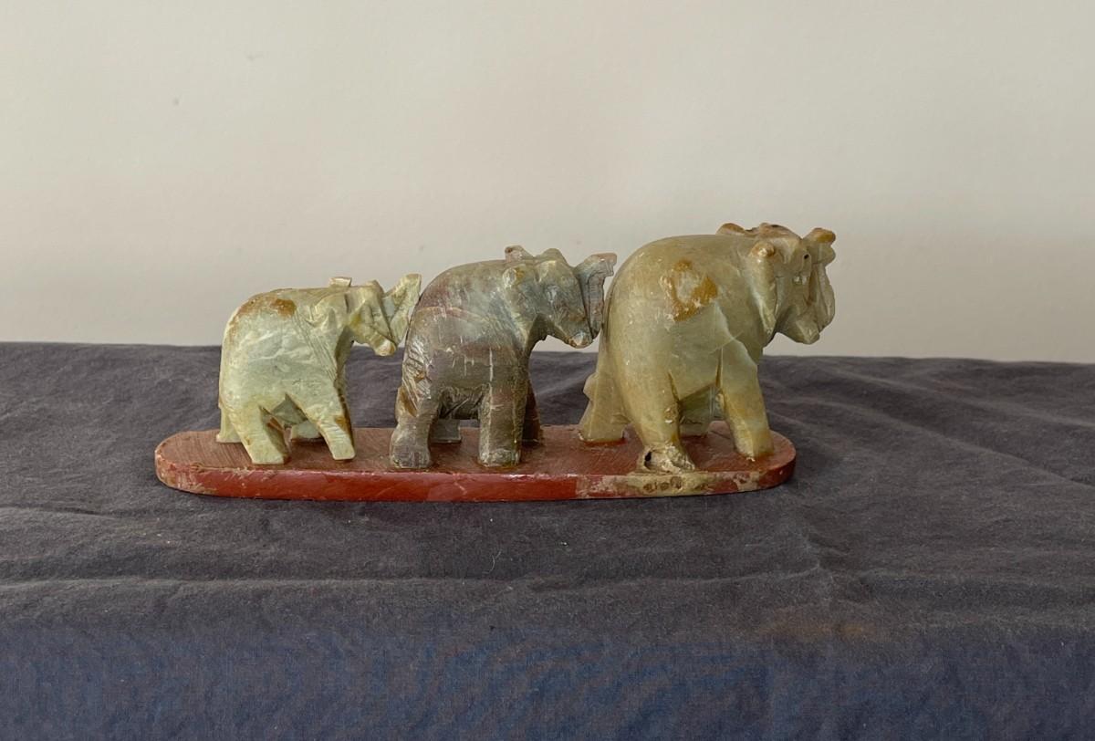 2 marble hand carved elephants and 3 sets of Elephants in a row hand carved from Soap Stone.
