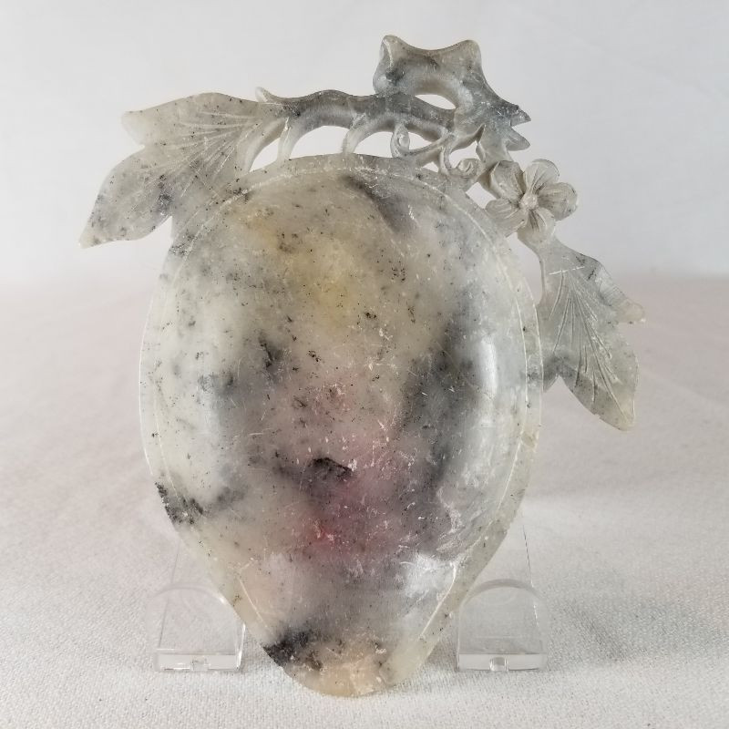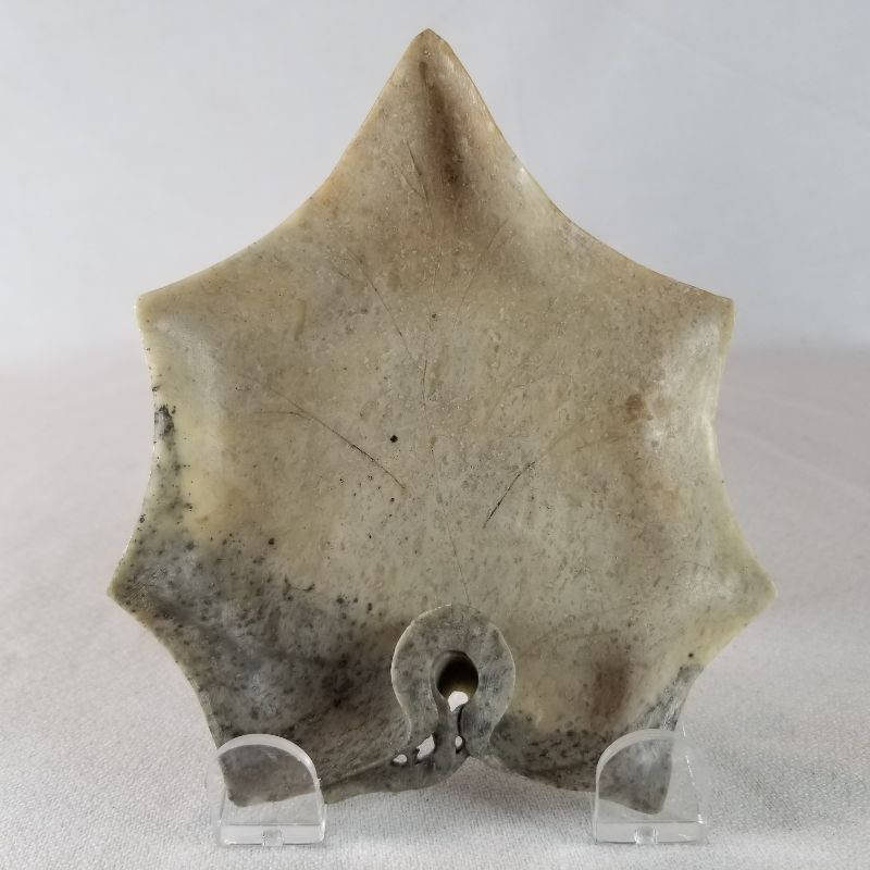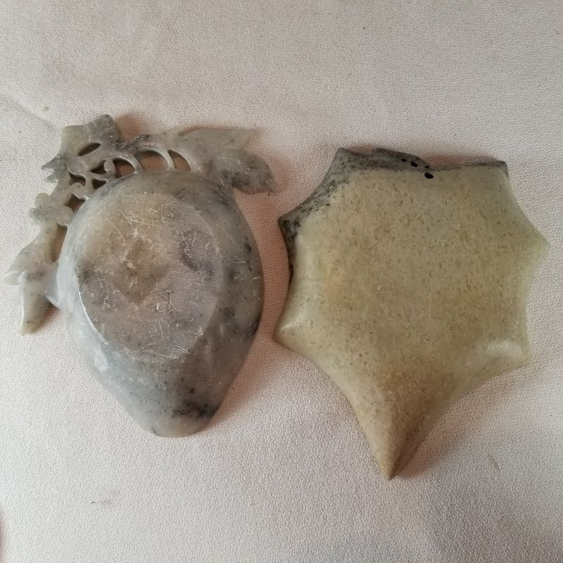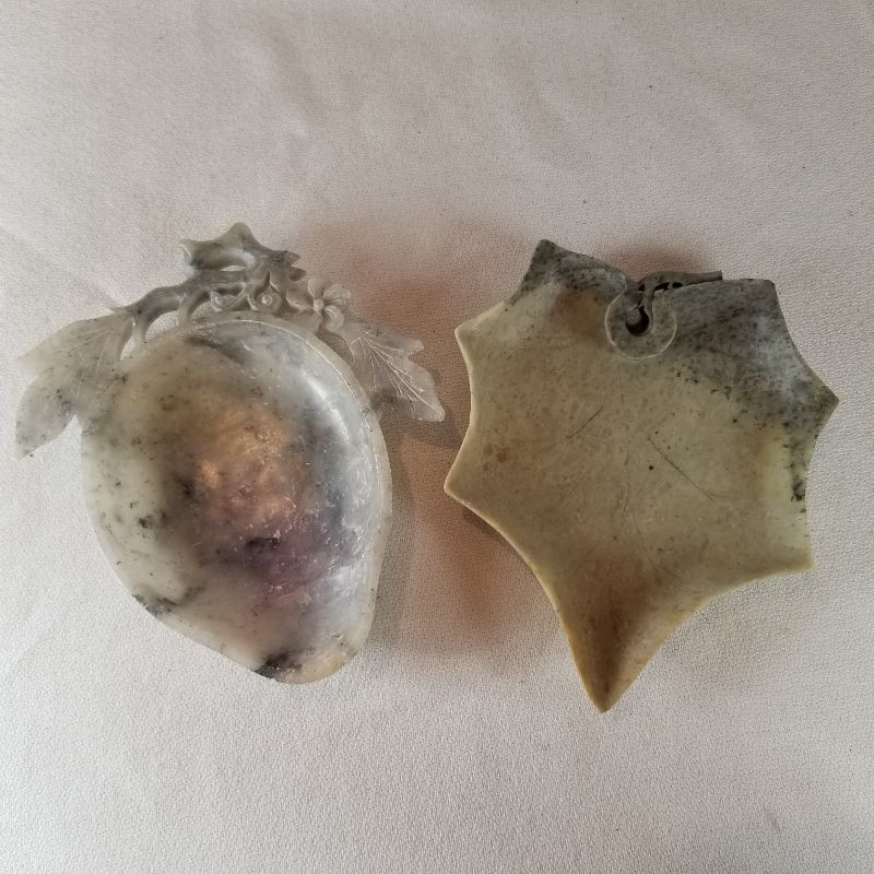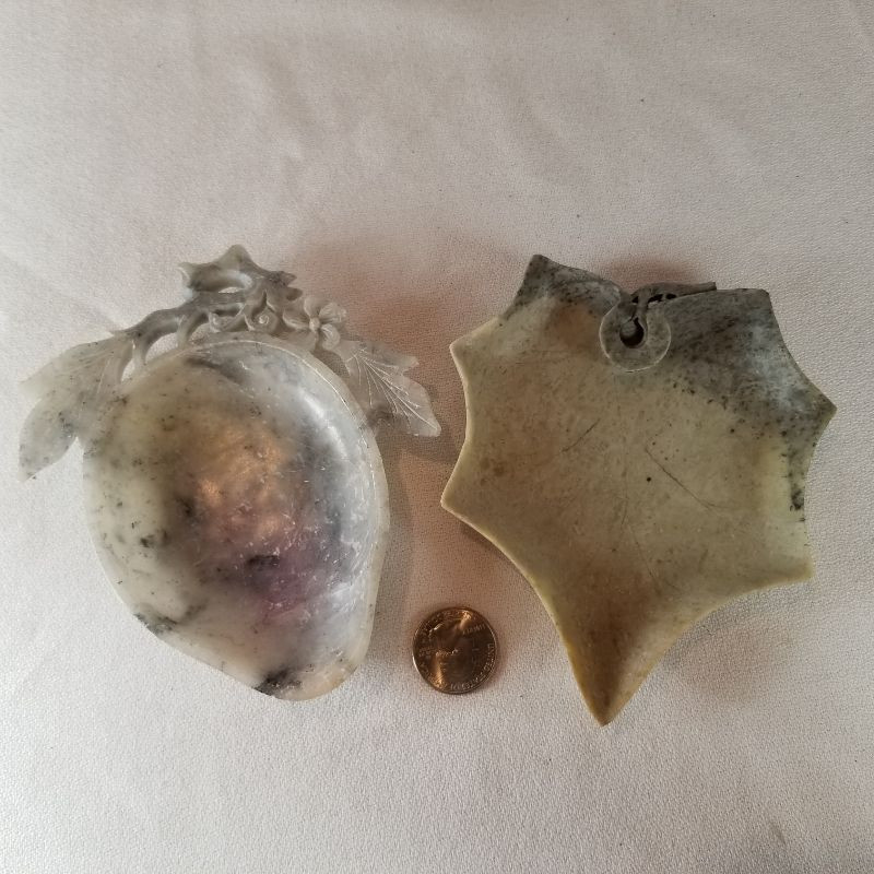 Two very nice small hand carved soap stone items. A pear and a leaf. Both are 5-1/2-inches long. The pear has a very small nick on bottom edge and a few tiny scratches. Both are considered in very good condition - nothing broken or cracked. Both are very pretty.