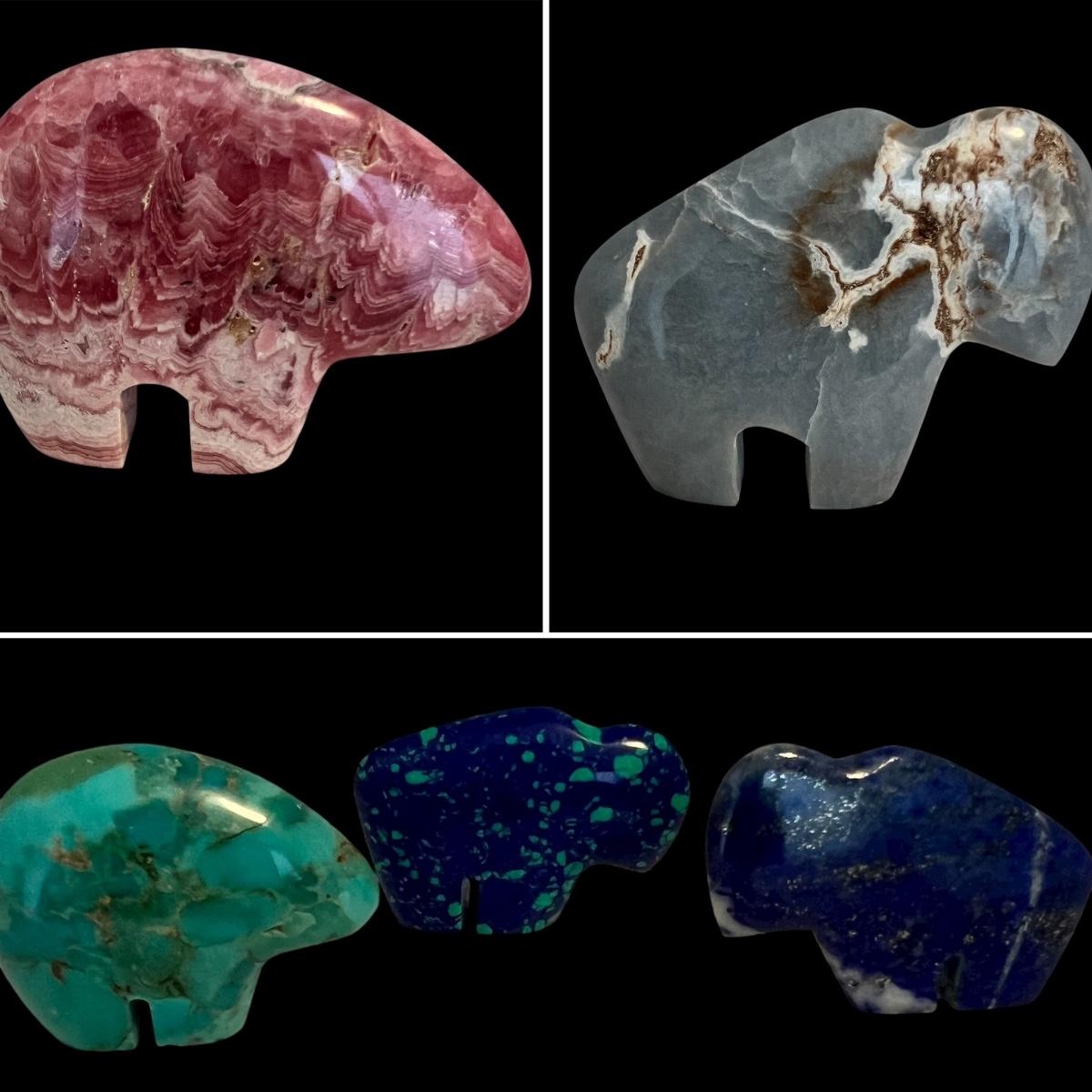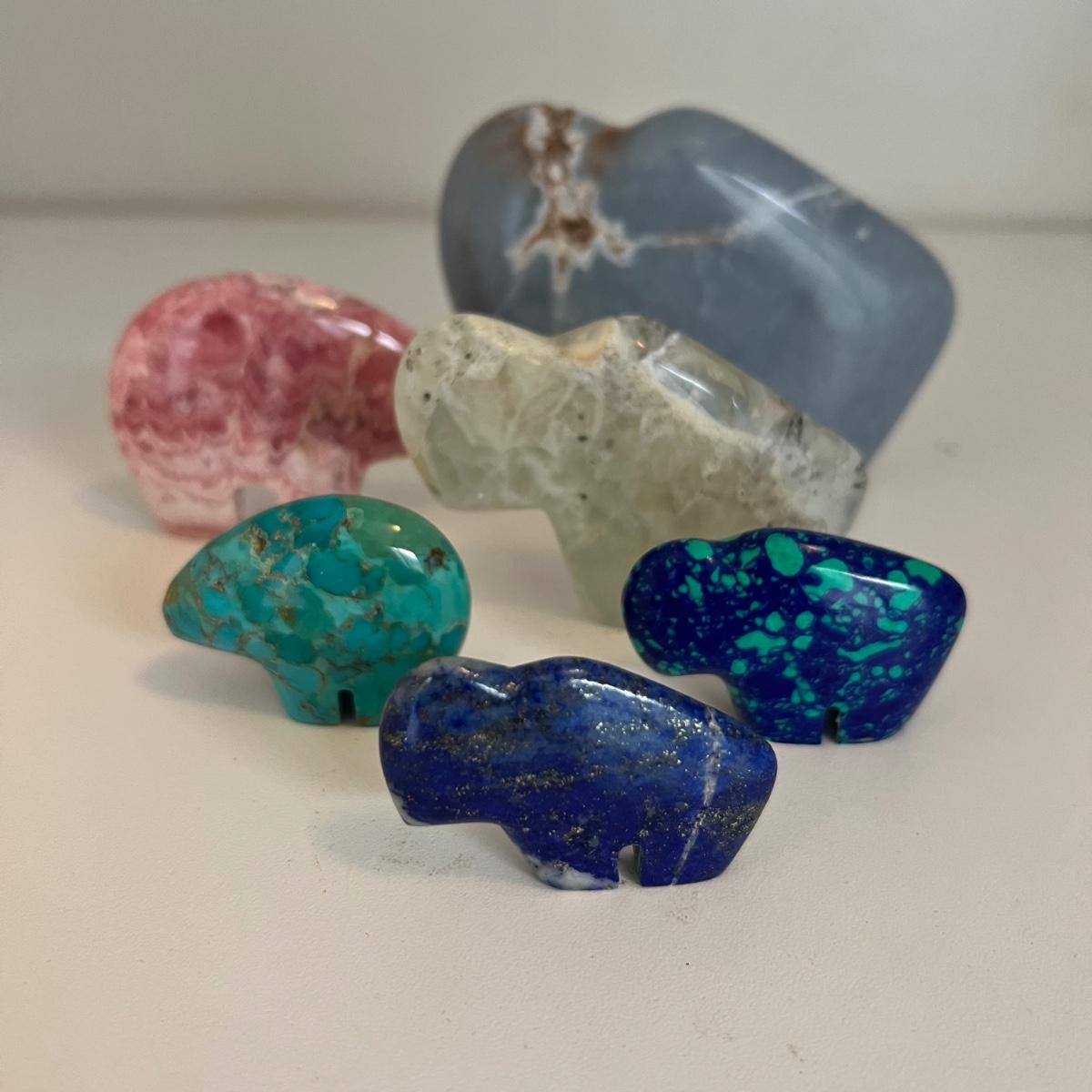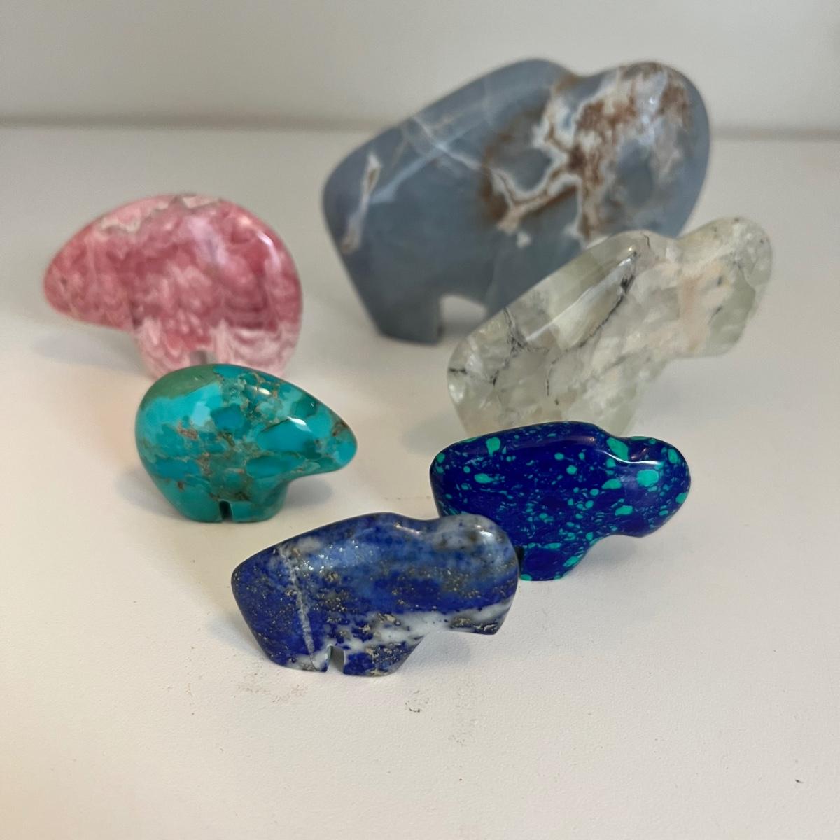 Four bison and two bear fetishes. All appear to hand carved from various stone including rhodocrosite, turquoise and more.