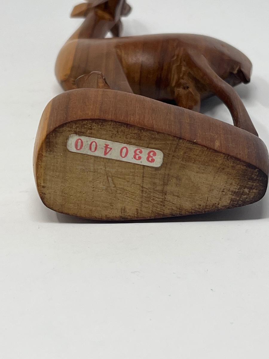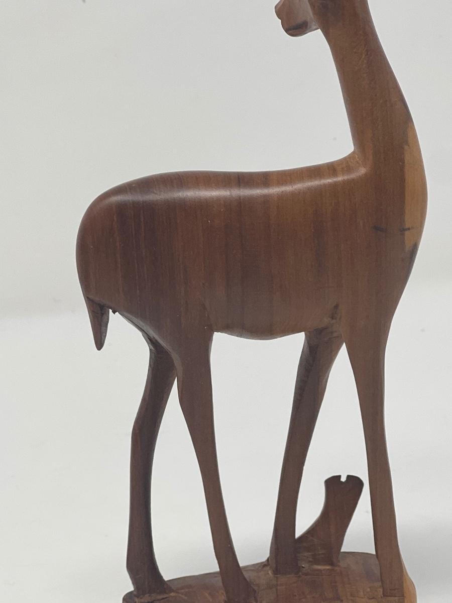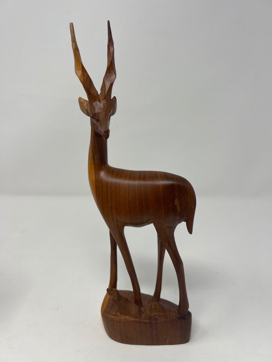 Two hand carved wood deer figures. Made in Kenya. 10.5” tall x 4” wide