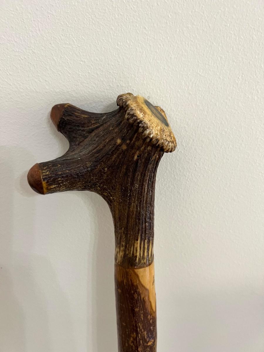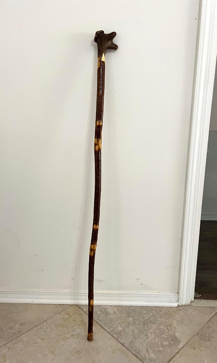 Hand Carved walking stick is carved out of wood and a deer antler at the top measuring 4 feet tall. Swiss gear stick is adjustable.