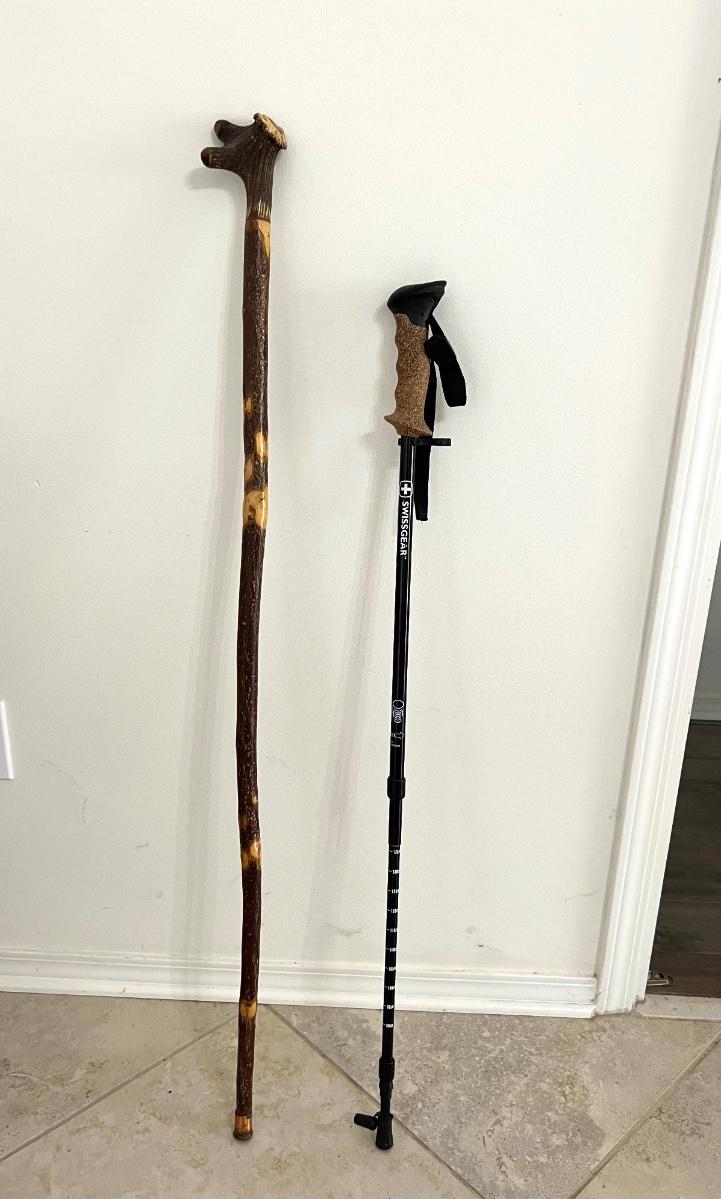 Hand Carved Walking Stick & Swiss Gear Adjustable Walking Stick.