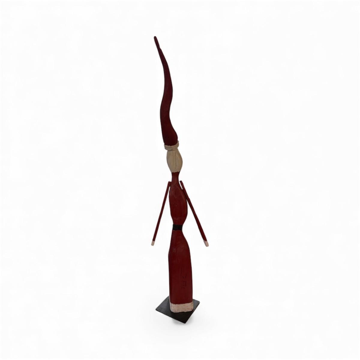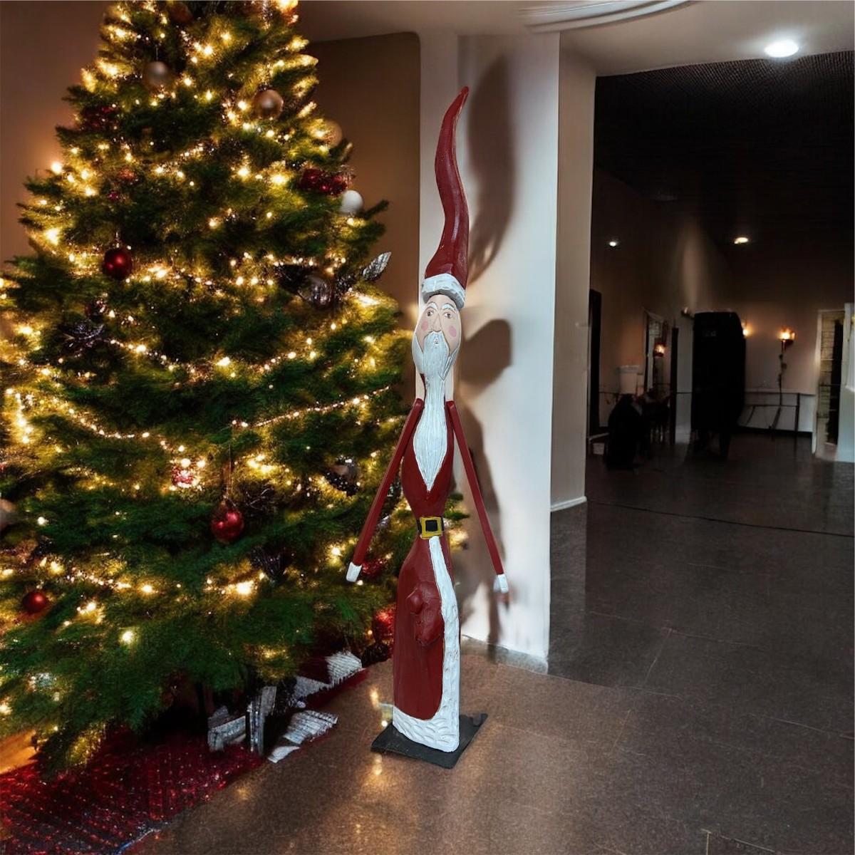 Hand Carved Whimsical Rustic Style Wooden Santa Clause. Hand painted in Traditional Red and White colors featuring a long flowing white beard and a tall cured red hat. This is a unique hand carved piece. Carvers name is on the back of the figurine. Approximately 51" tall