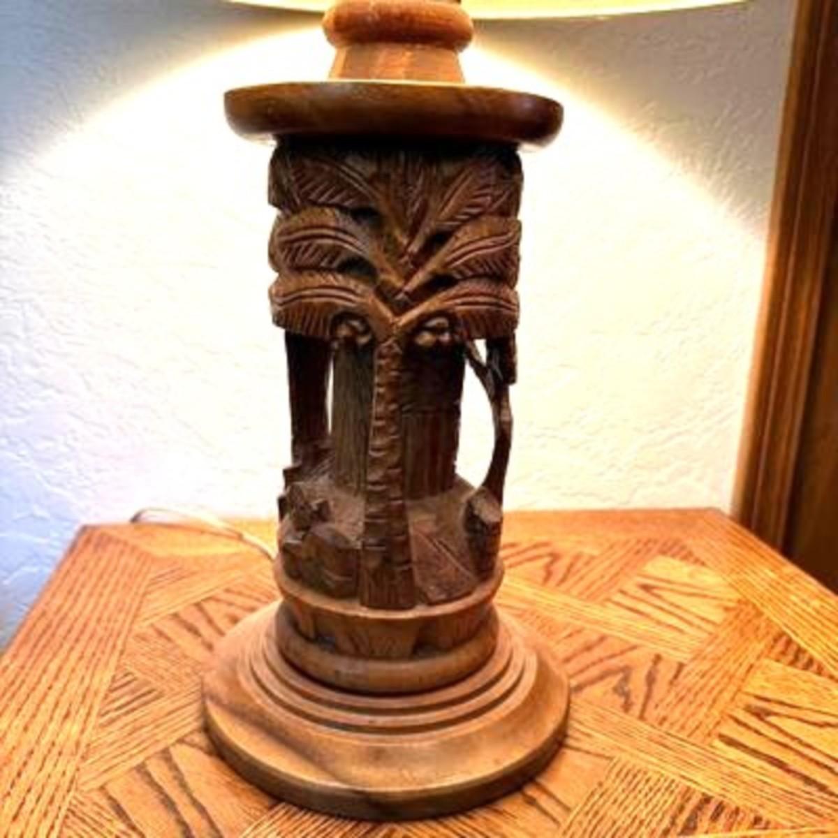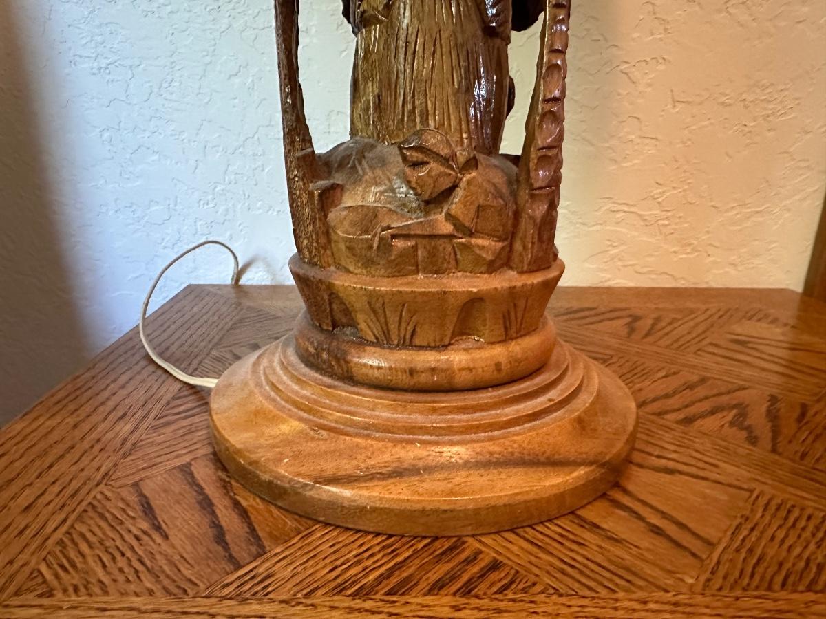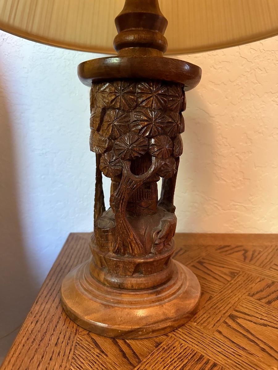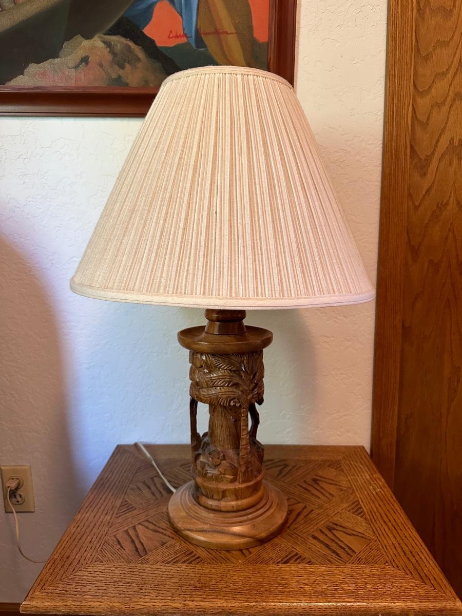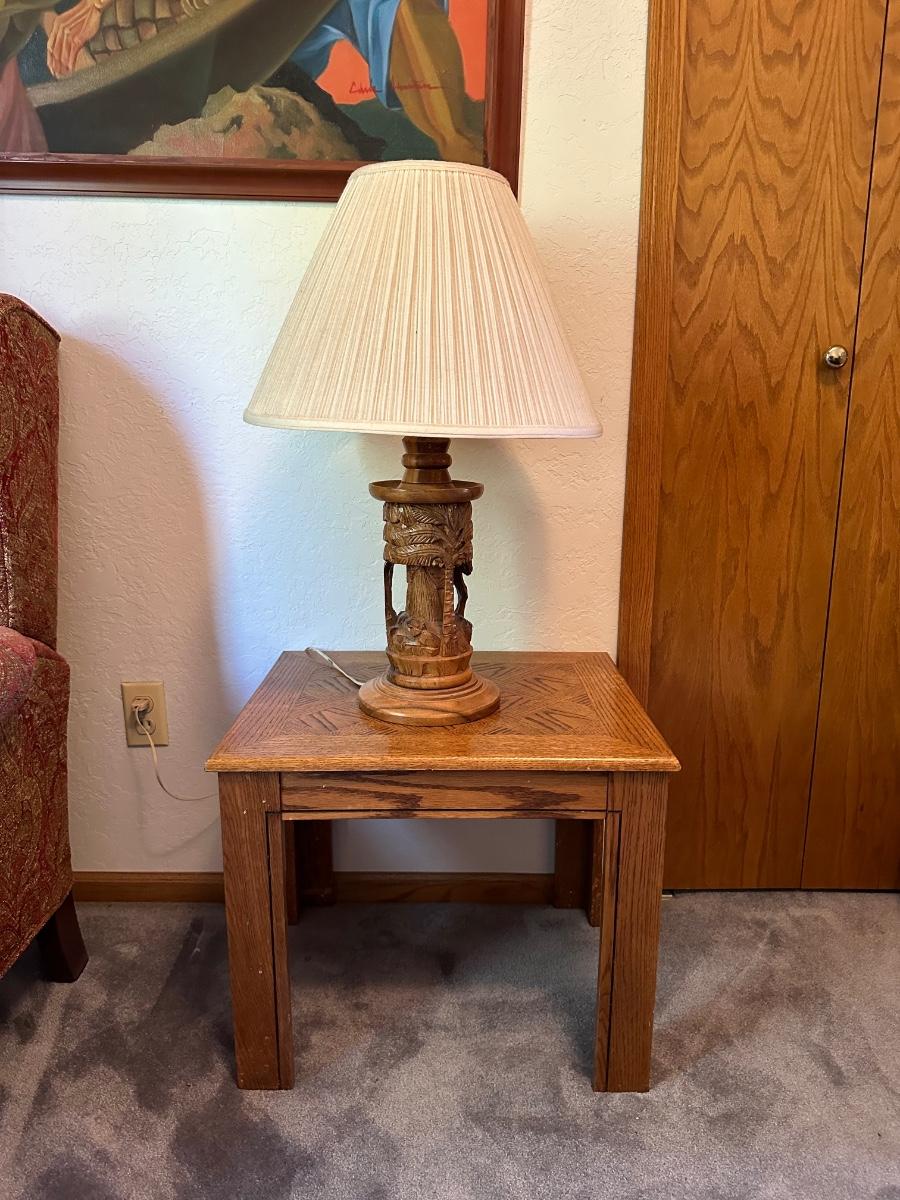 HAND CARVED WOOD BASE LAMP AND SOLID WOOD END TABLE
