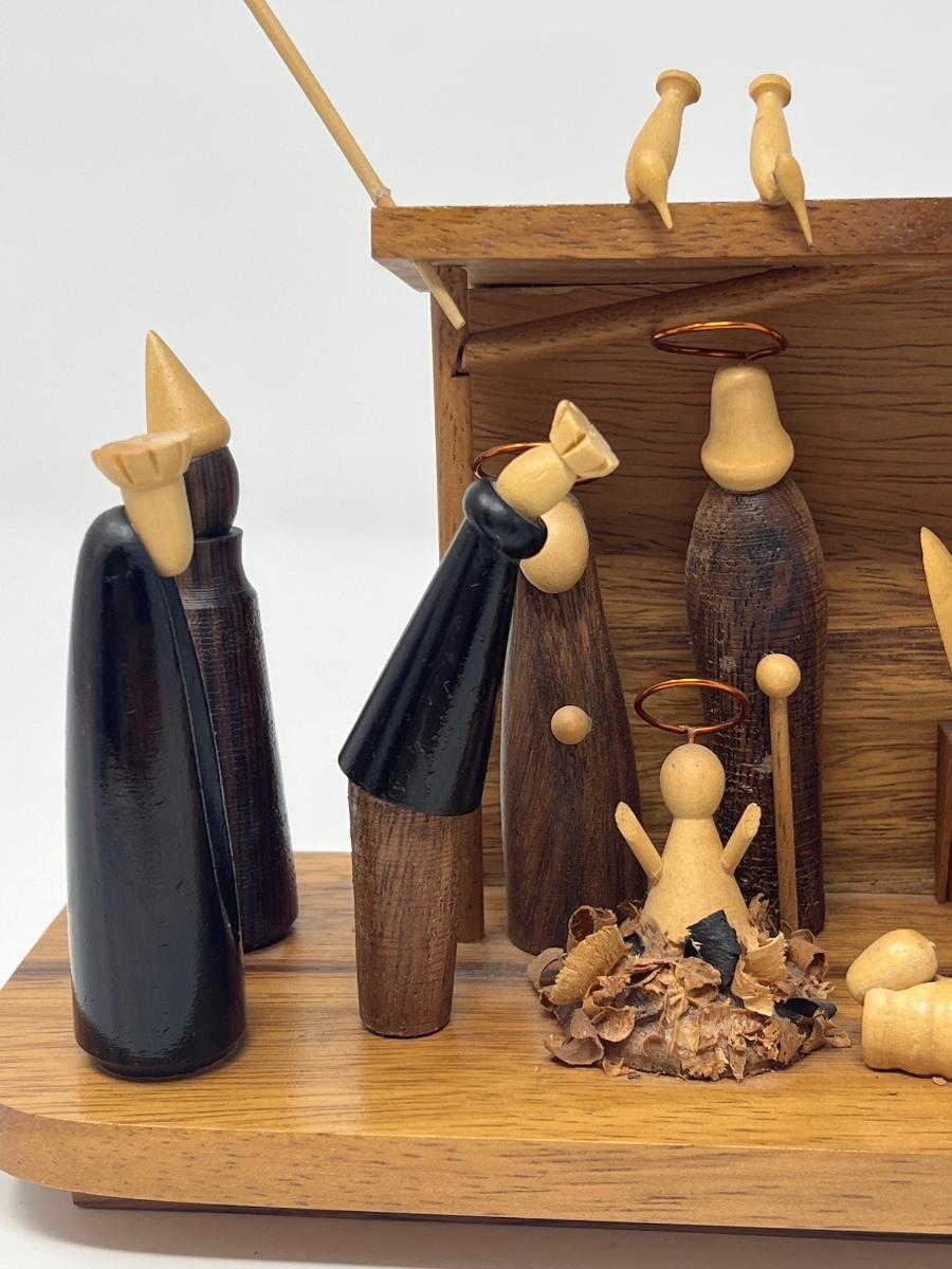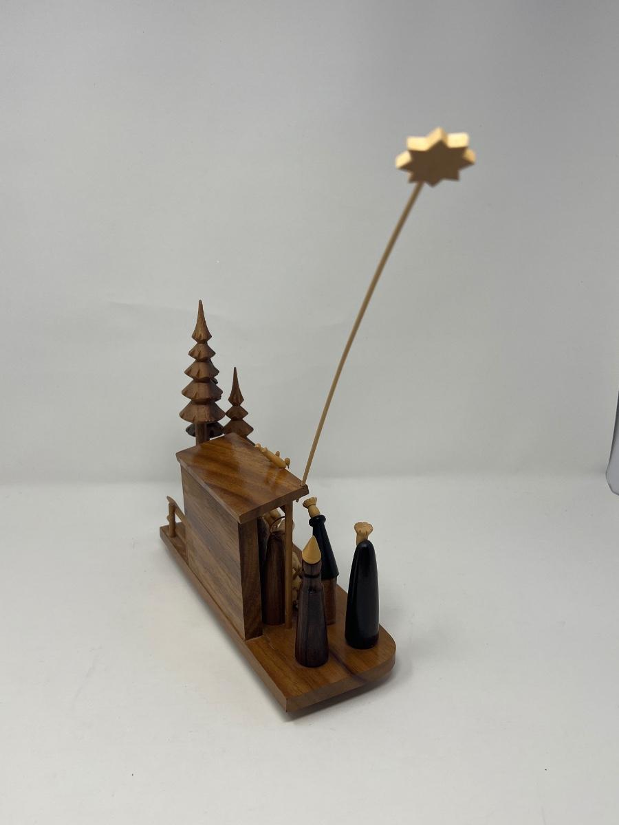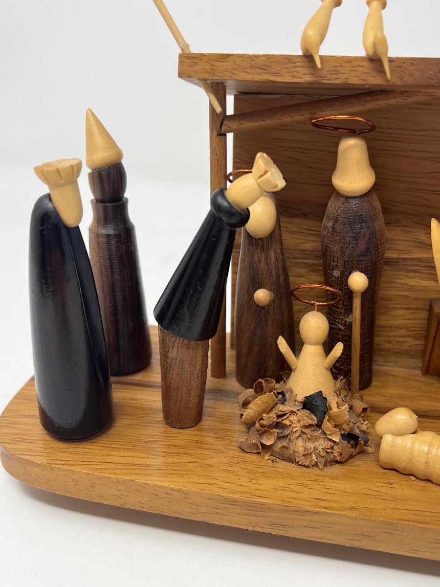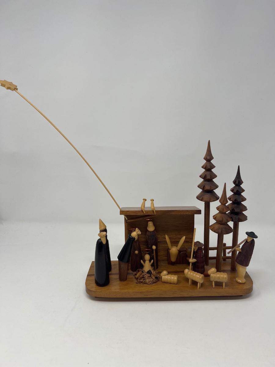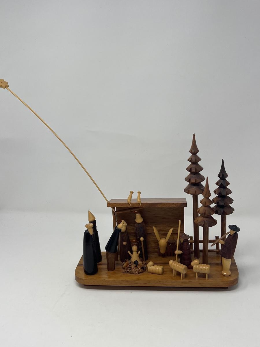 Delightful wood carved manger scene marked on bottom. Star, shepherd staff are removable.