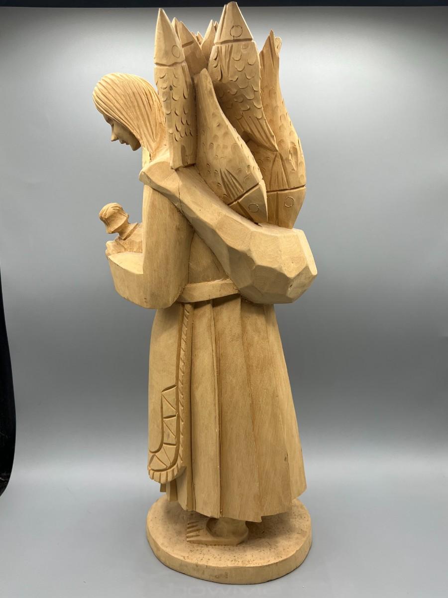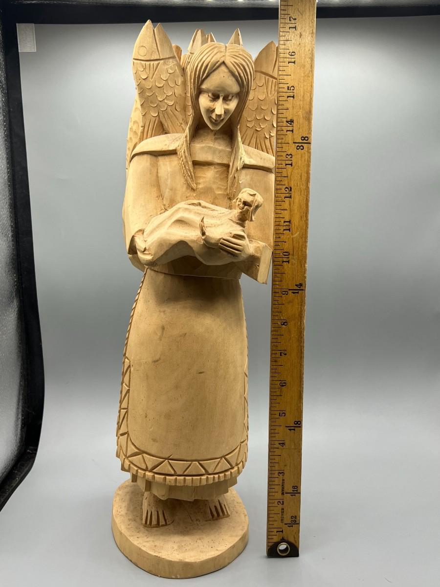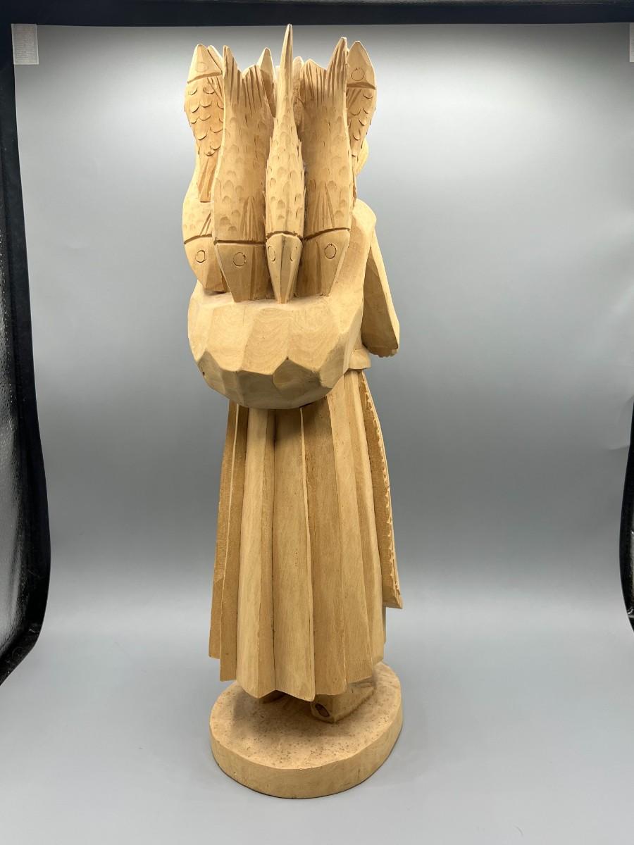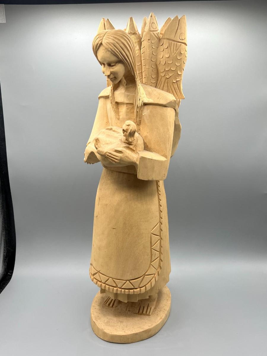Hand Carved Wood Figurine of Indigenous Woman with Child and Fish, there is some light wear, but there is no significant damage to the wooden figurine and is in good displayable condition. Check pictures for more details and for sizing.