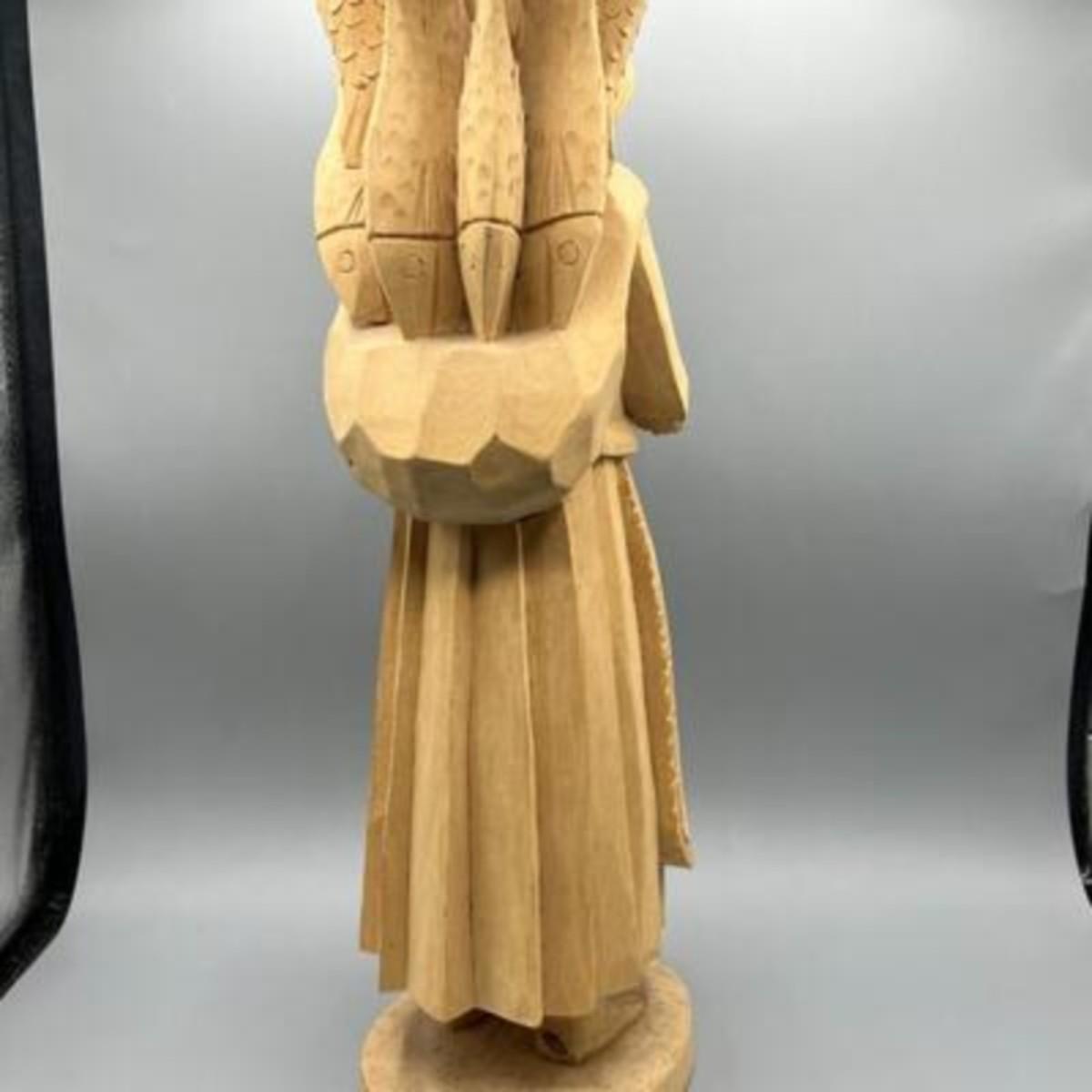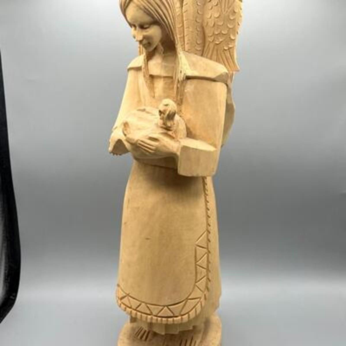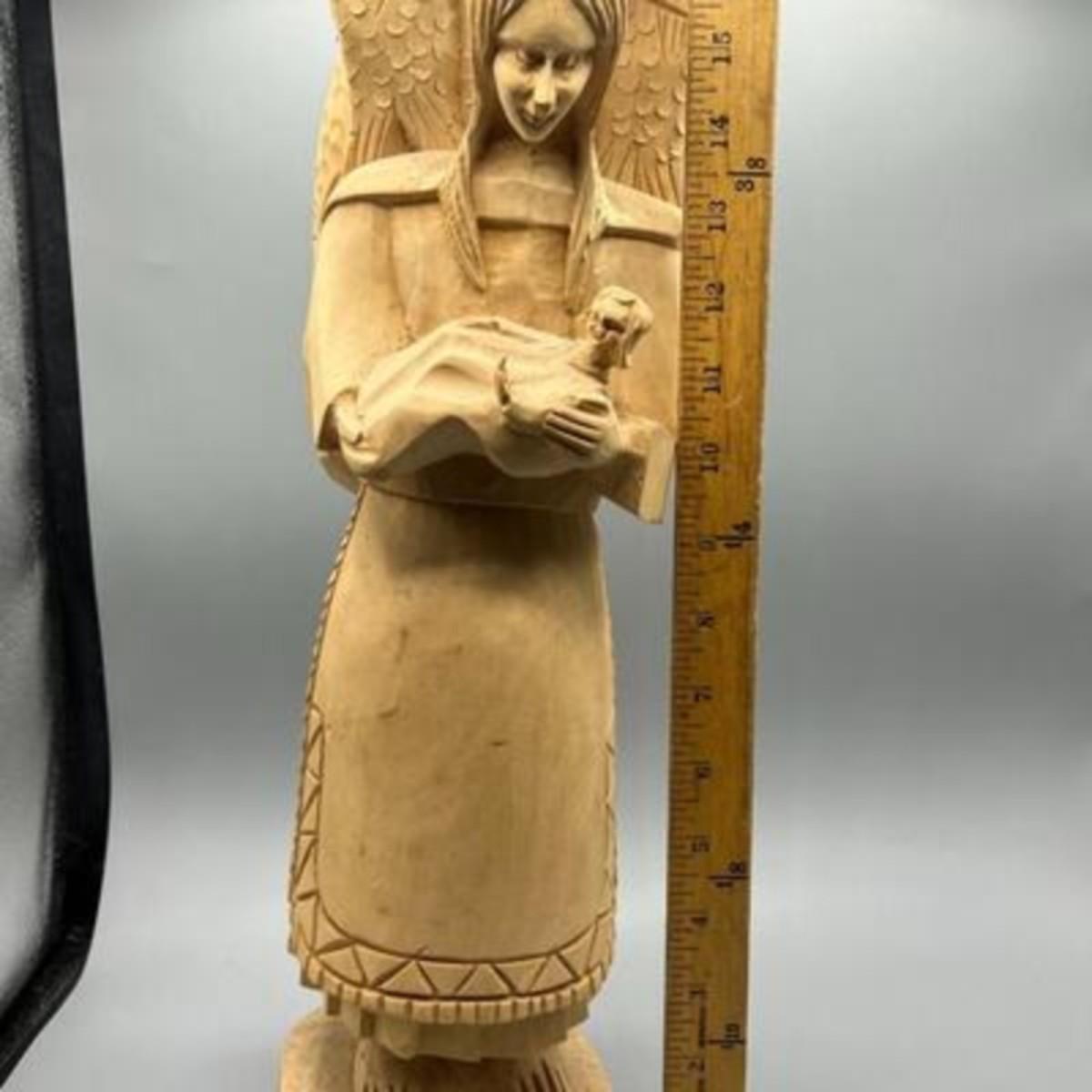 Hand Carved Wood Figurine of Indigenous Woman with Child and Fish, there is some light wear, but there is no significant damage to the wooden figurine and is in good displayable condition. Check pictures for more details and for sizing.