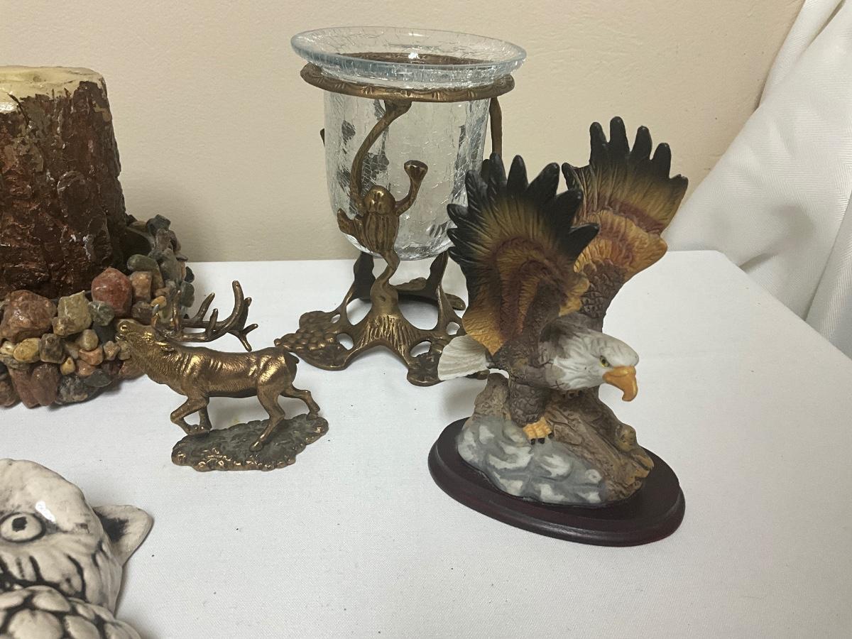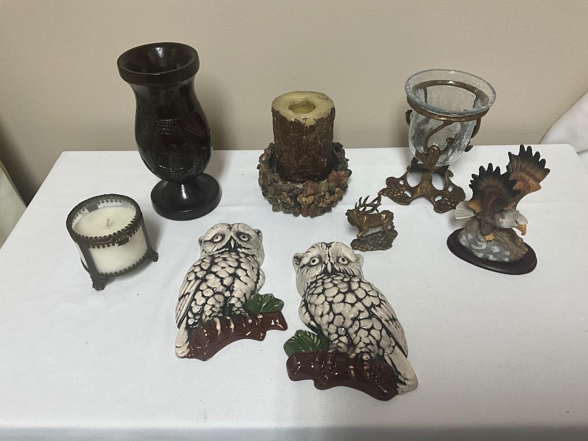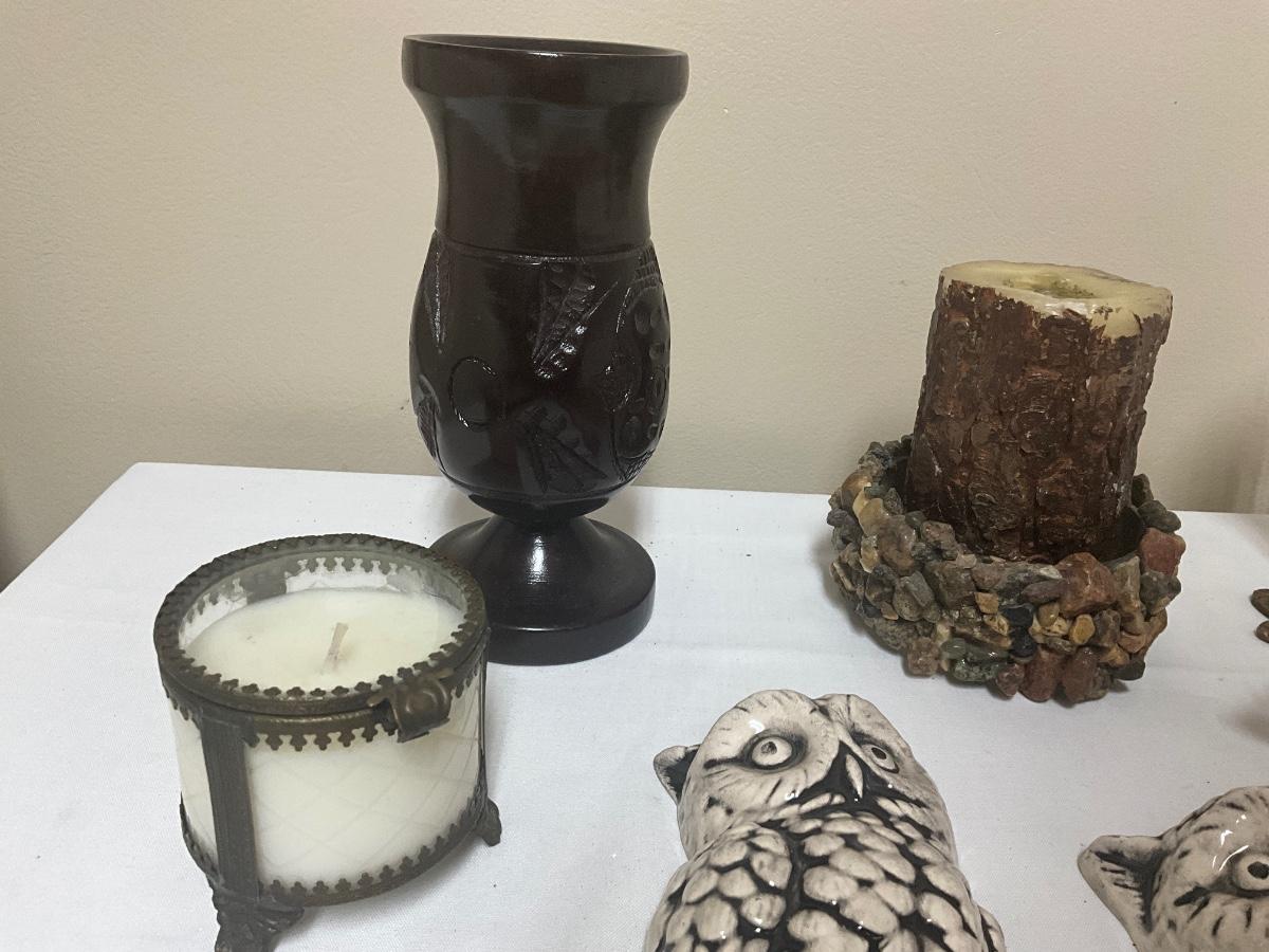 Hand Carved Wood Vase, Brass Elk, Ceramic Owls, Brass Frog container, candles