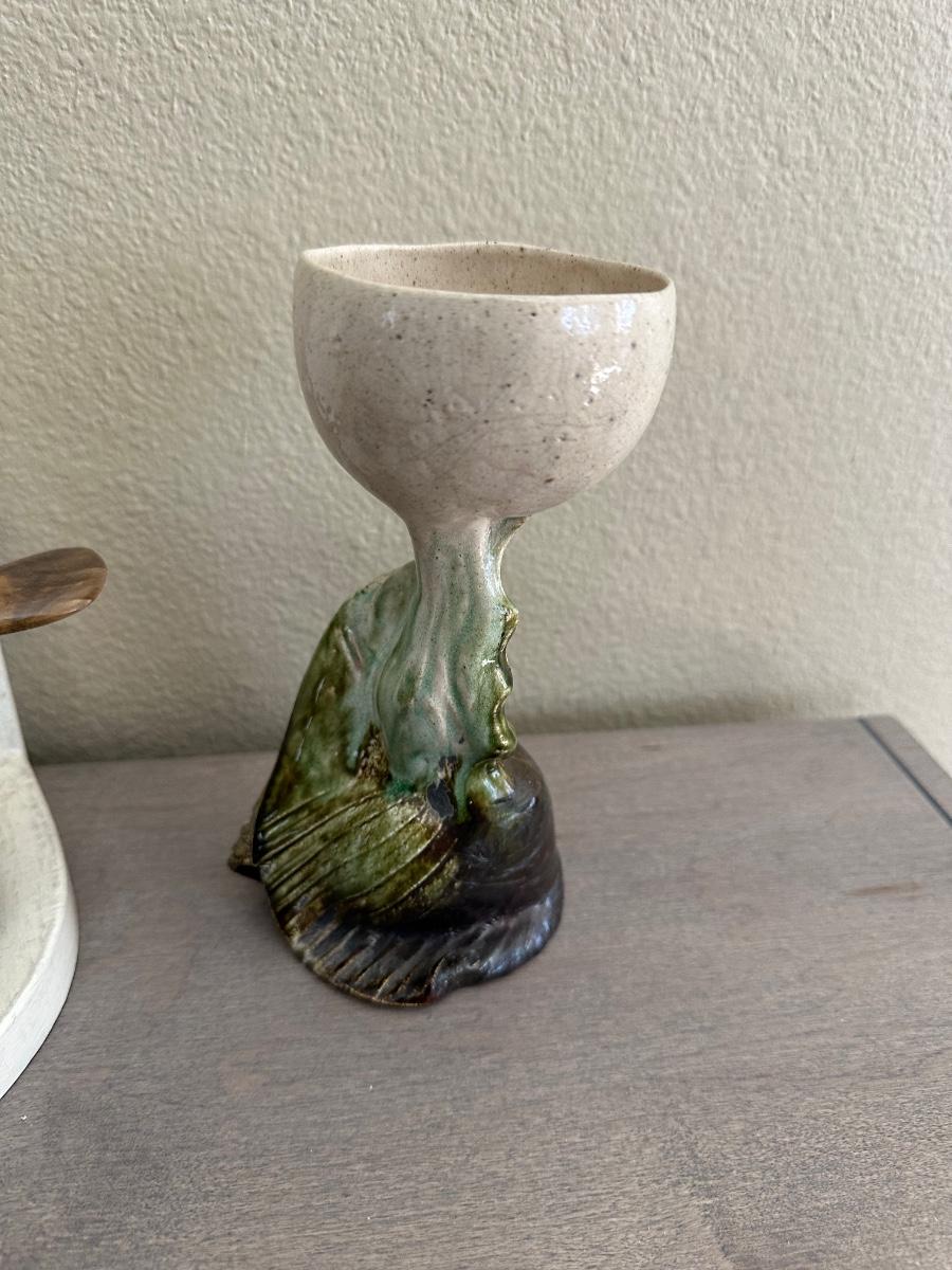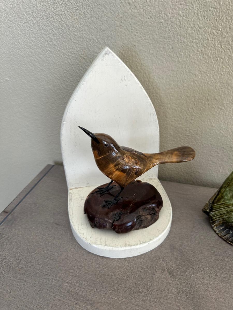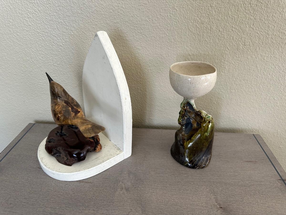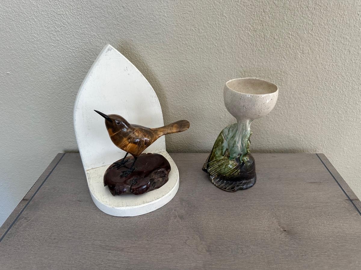 HAND CARVED WOODEN BIRD AND A UNIQUE CLAY PIECE