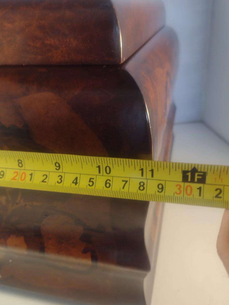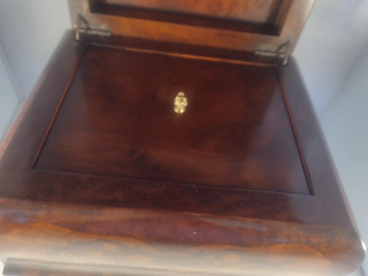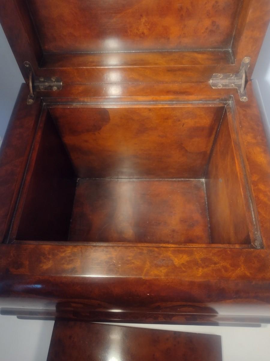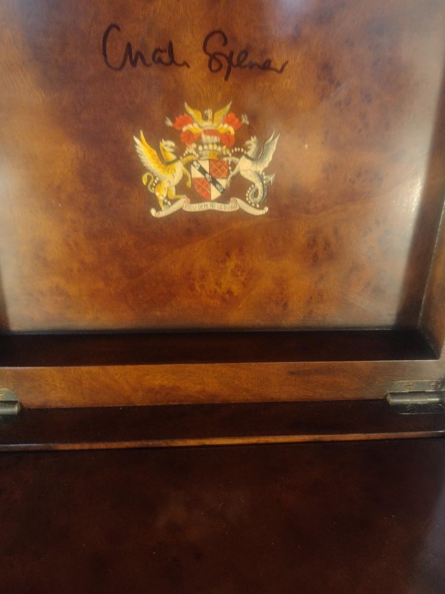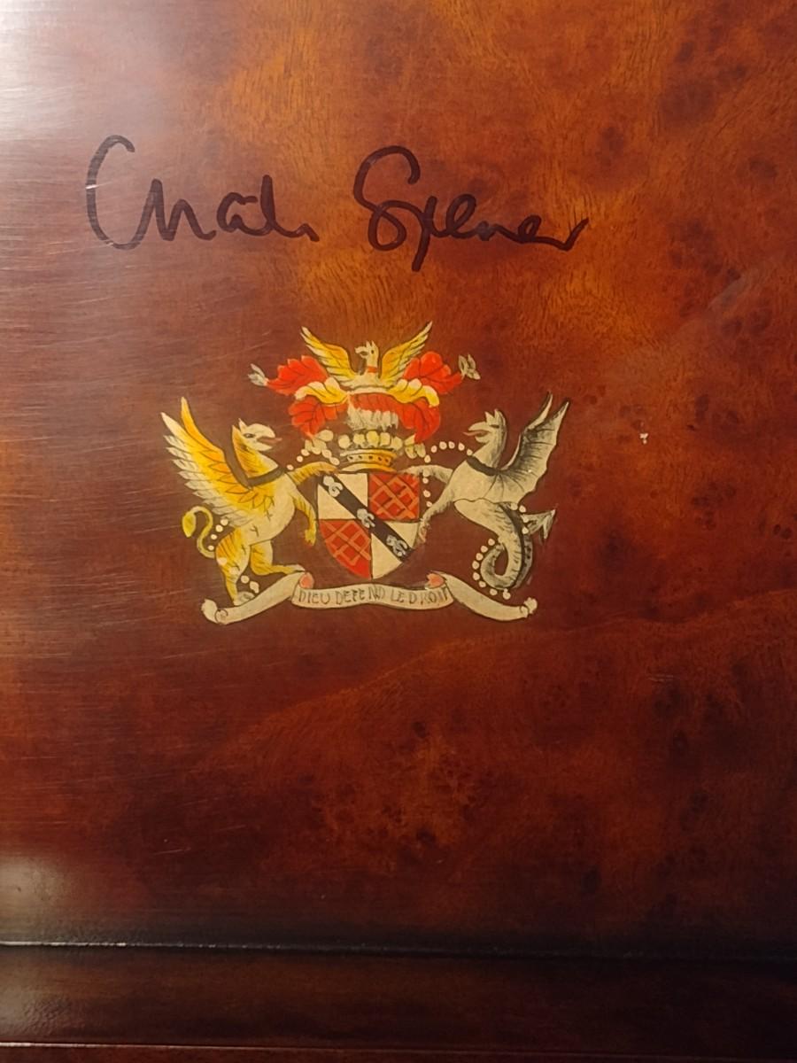 Hand Crafted Burlwood Mahogany English Gentleman's Storage Box by Charles Spencer, 9th Earl Spencer (Princess Diana's younger brother). Item is complete with the family's coat of arms.
