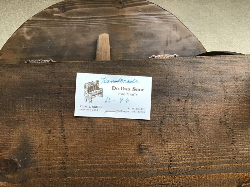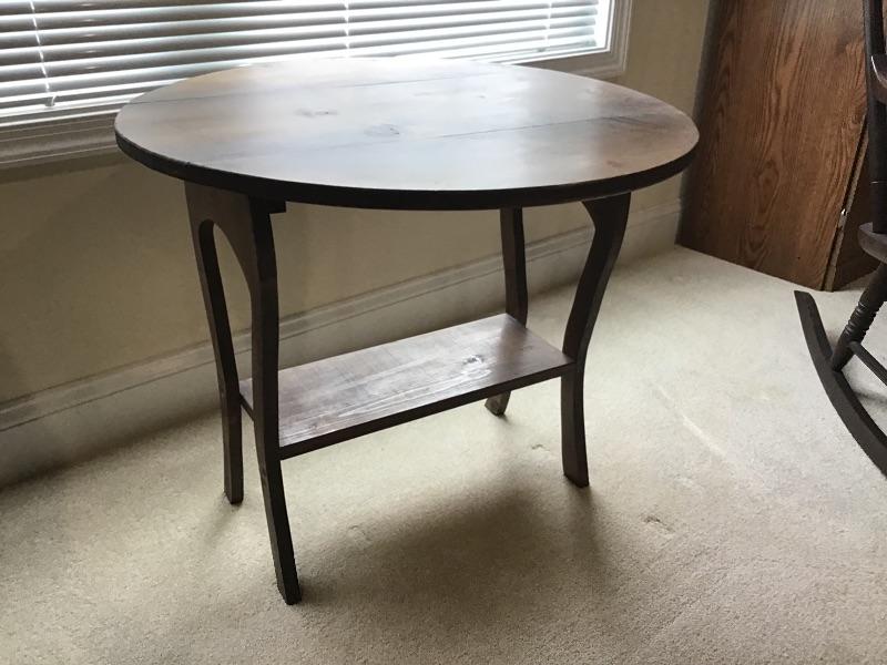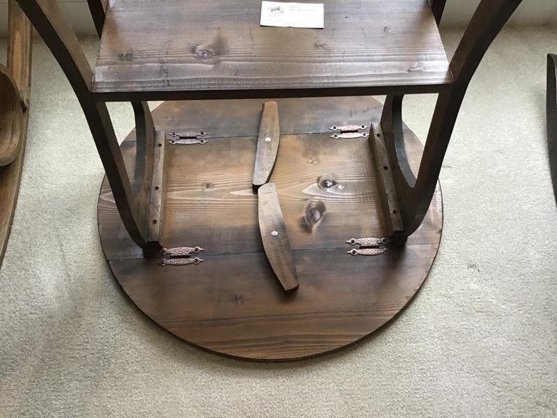 Beautiful hand crafted wood table by Do-Dad Shop. 27” and the shelf is 7” x 18 1/2”. Both sides fold down in beautiful condition.
