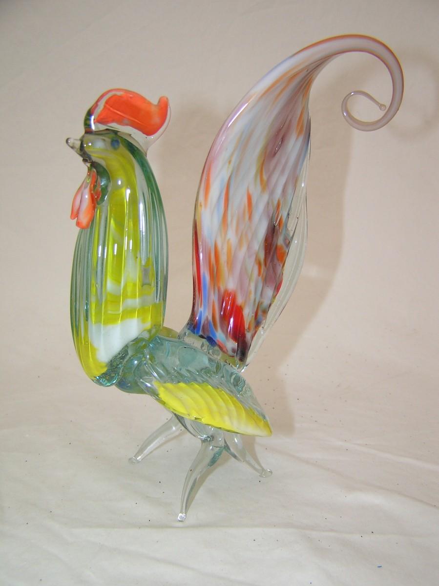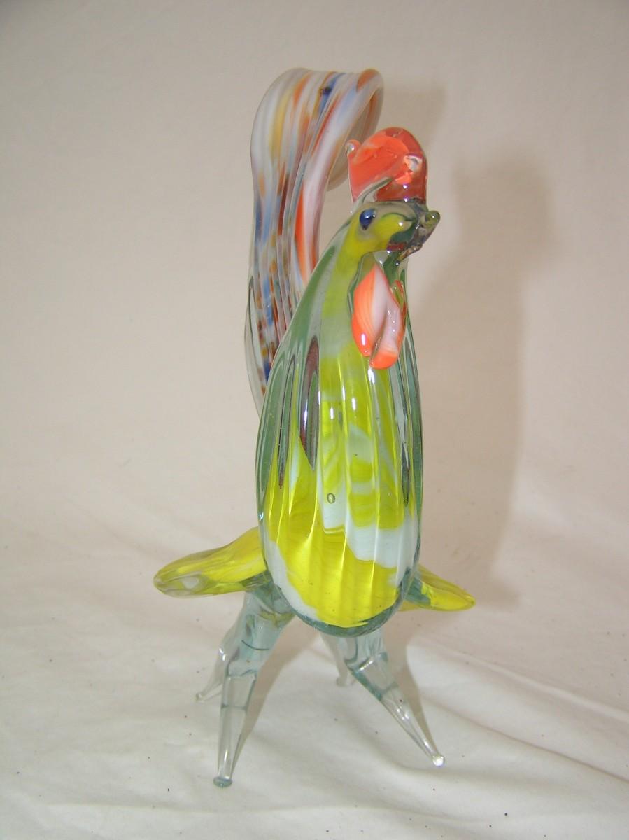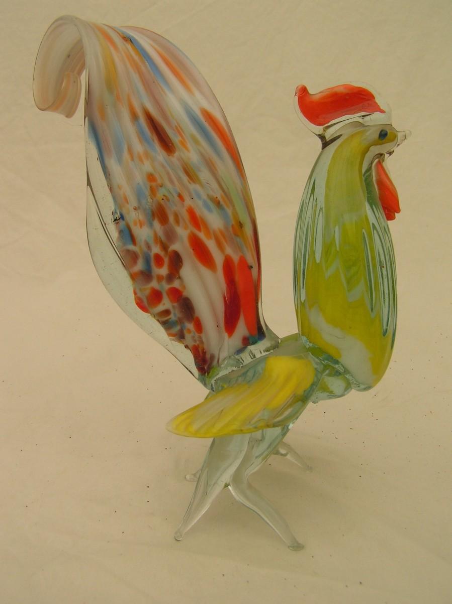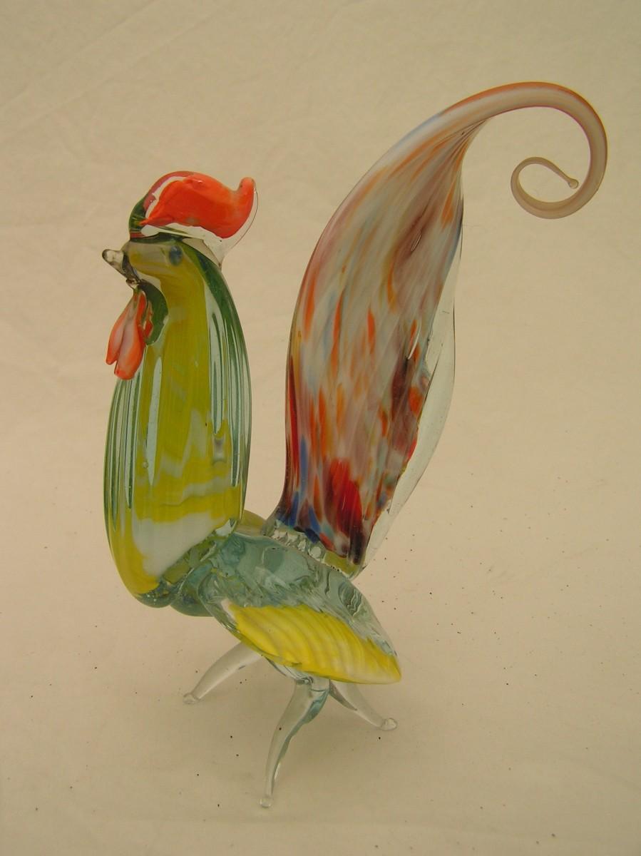 Colorful hand crafted decorative glass chicken figurine. This one is believed to be from Murano Island, Italy. Roosters are believed to bring Good Luck. Stands about 8-3/4" tall at tail.